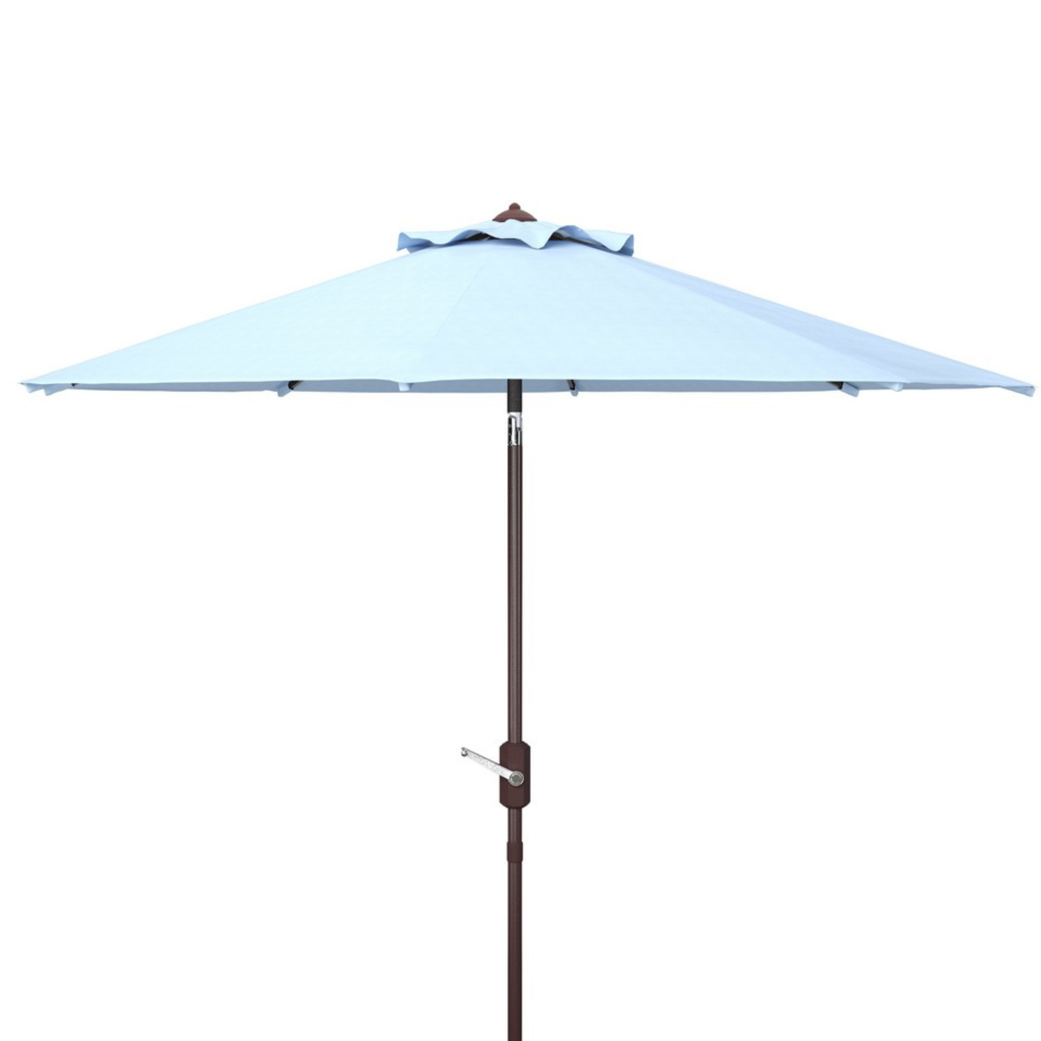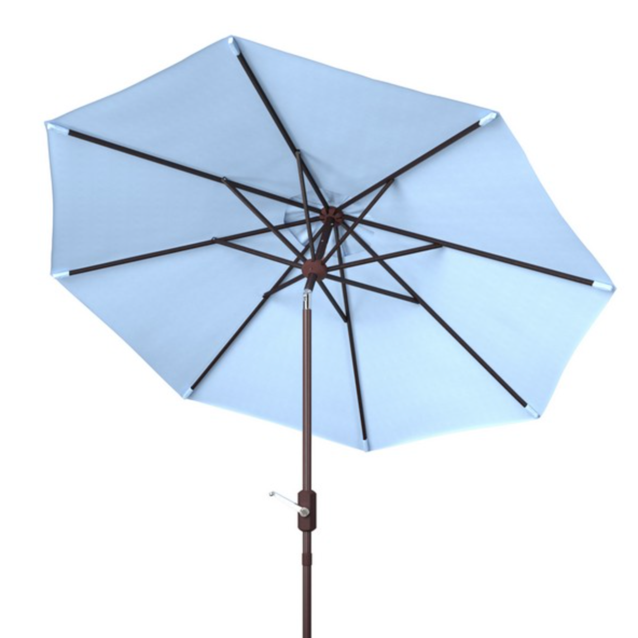 This charming umbrella designed to keep you cool and comfortable. The 9-foot canopy features a durable brown aluminum frame and weather-resistant polyester fabric. The easy-to-use auto tilt crank mechanism adds convenience and style to your patio experience. Click images for greater detail.