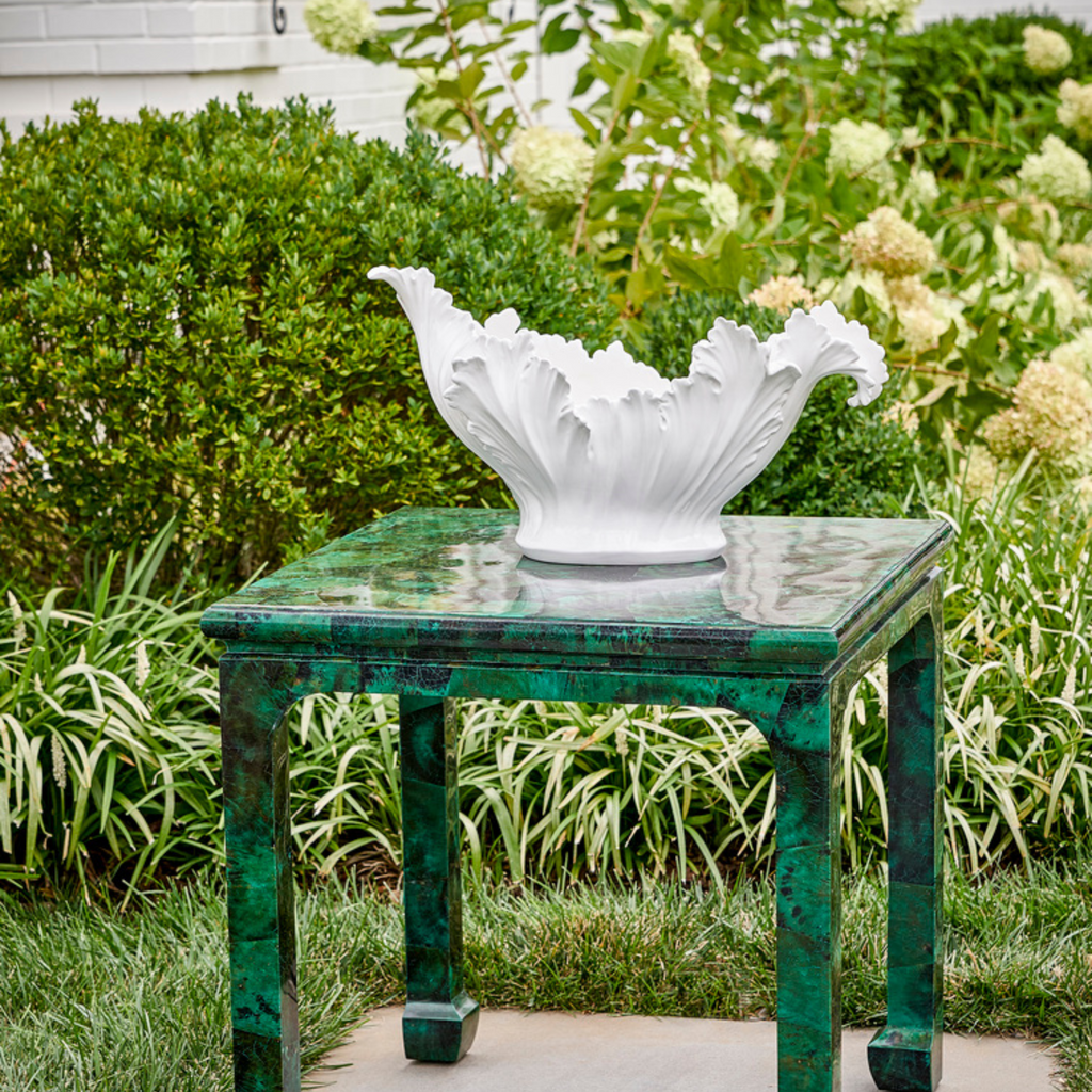 Ancanthus Leaf Bowl is one of our most versatile bowls. This glossy white hand painted Italian ceramic bowl features a layer of detailed acanthus leaves. Its simple color yet elegant design is ideal for use as a stand alone accent on a tabletop or bookcase in any decorative style. However, it can also be used to hold fruit, decorative orbs or a dried arrangement for a stunning centerpiece or even add ice and use as an exquisite wine chiller at your next garden party. Made in Italy.