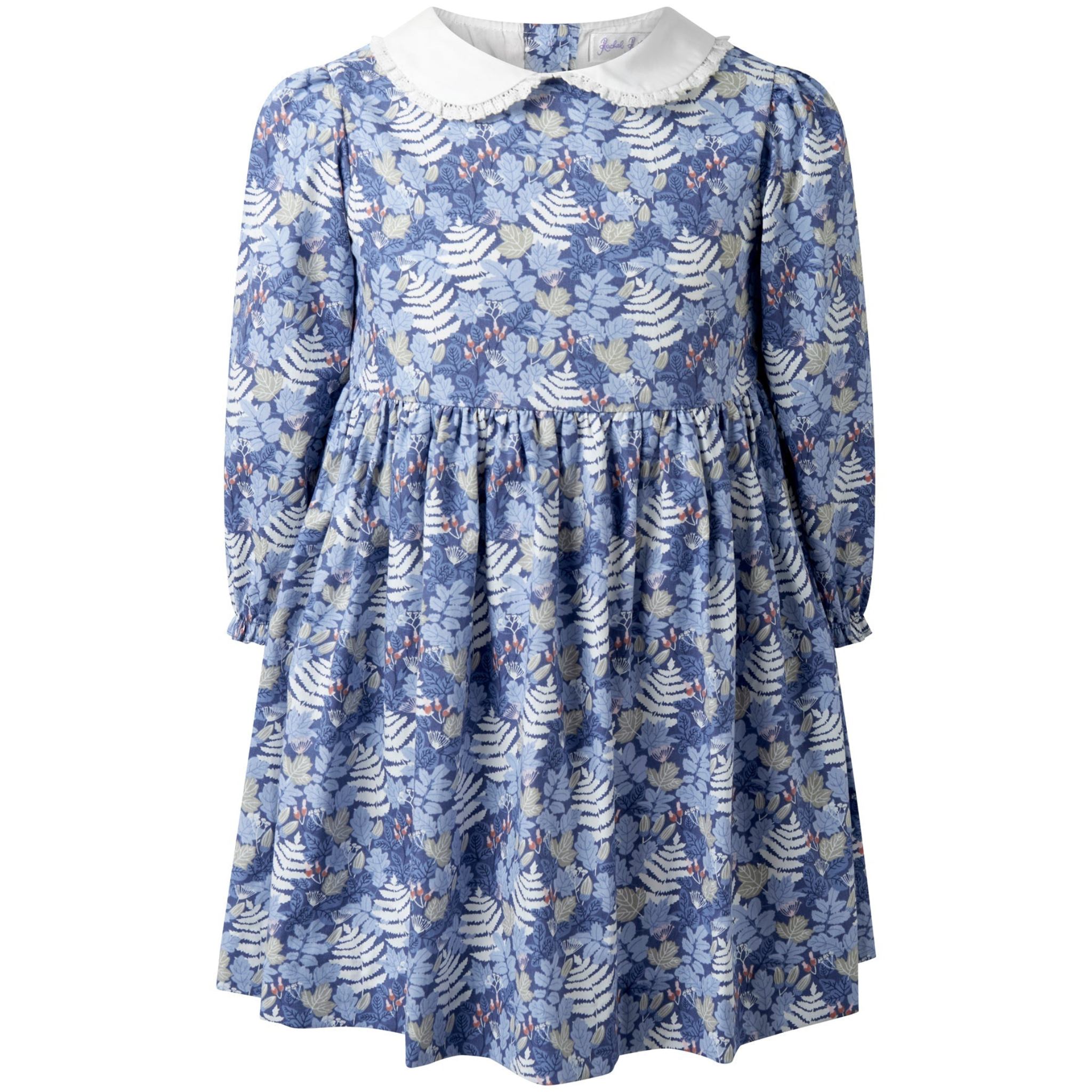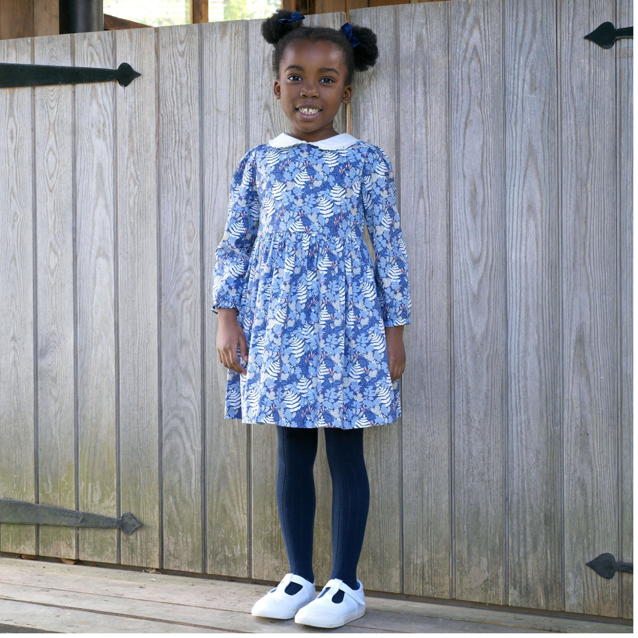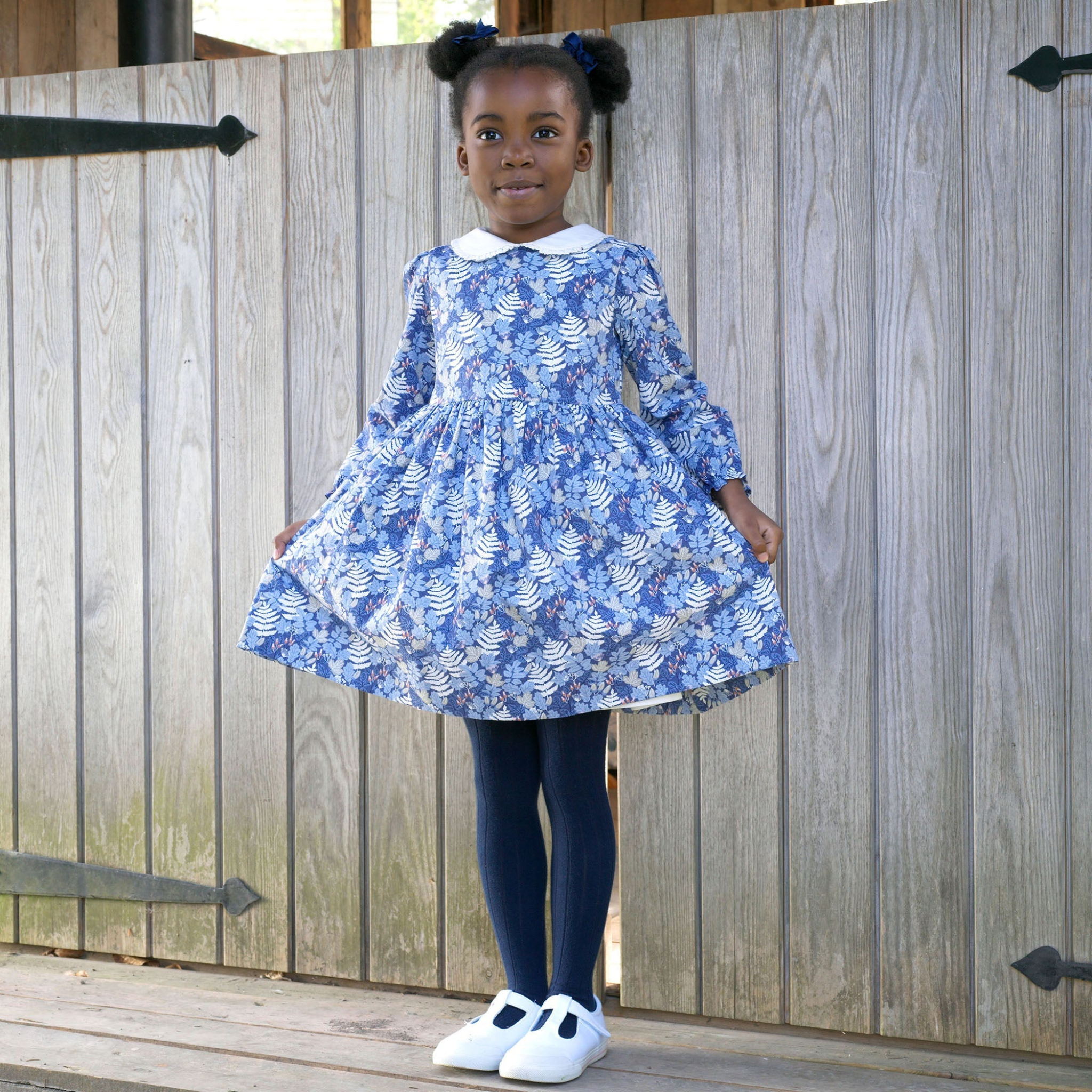 This adorable dress features a charming acorn leaf pattern fabric, giving it a cozy, nature-inspired vibe. The dress is beautifully finished with a delicate lace-trimmed ivory Peter Pan collar, adding a sweet and classic touch. Perfect for any little adventurer, this dress combines comfort with a timeless design that’s ideal for playdates or family outings.