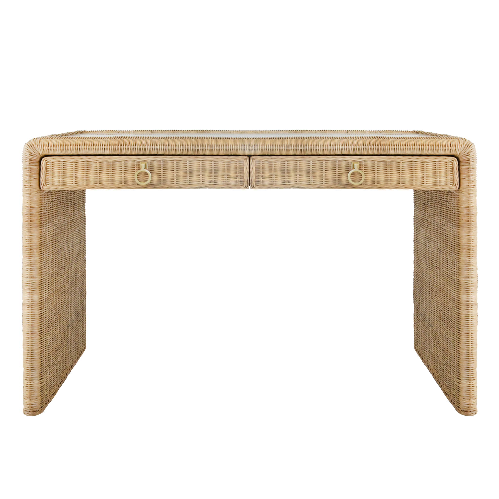 The Adrien Rattan Desk boasts a unique design with a woven rattan frame and an inset glass top. Its two drawers provide functional storage while its waterfall-edge adds a touch of elegance. Elevate your workspace with this luxury desk.