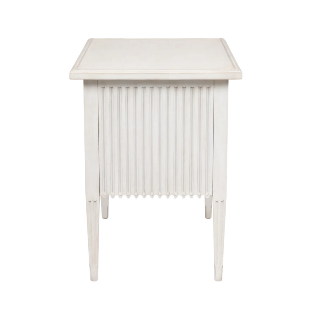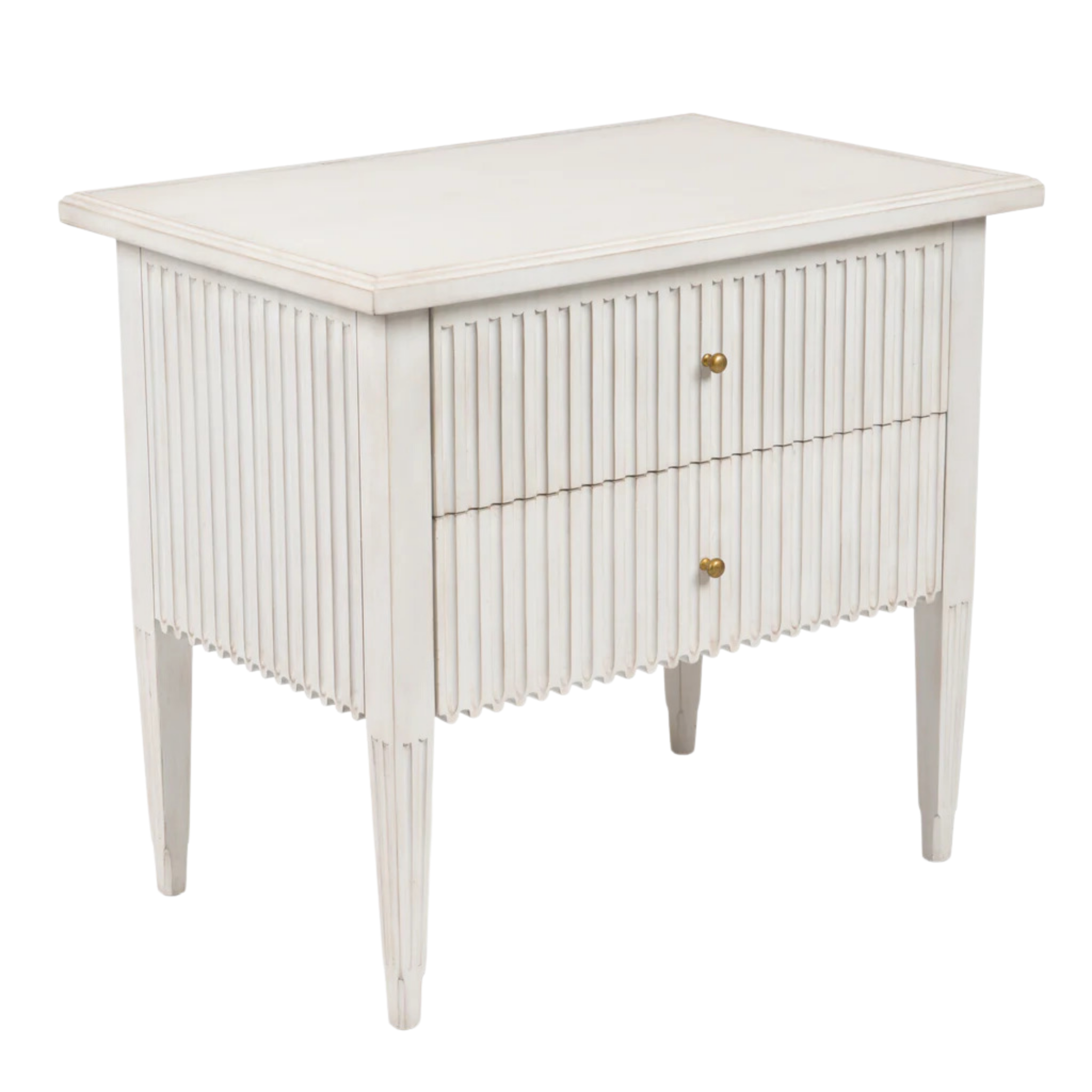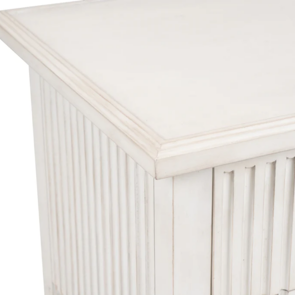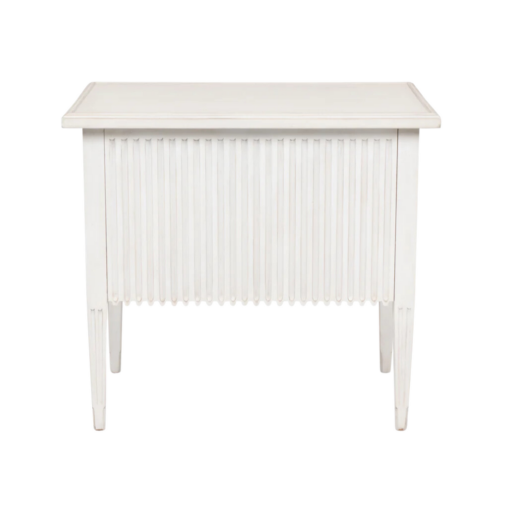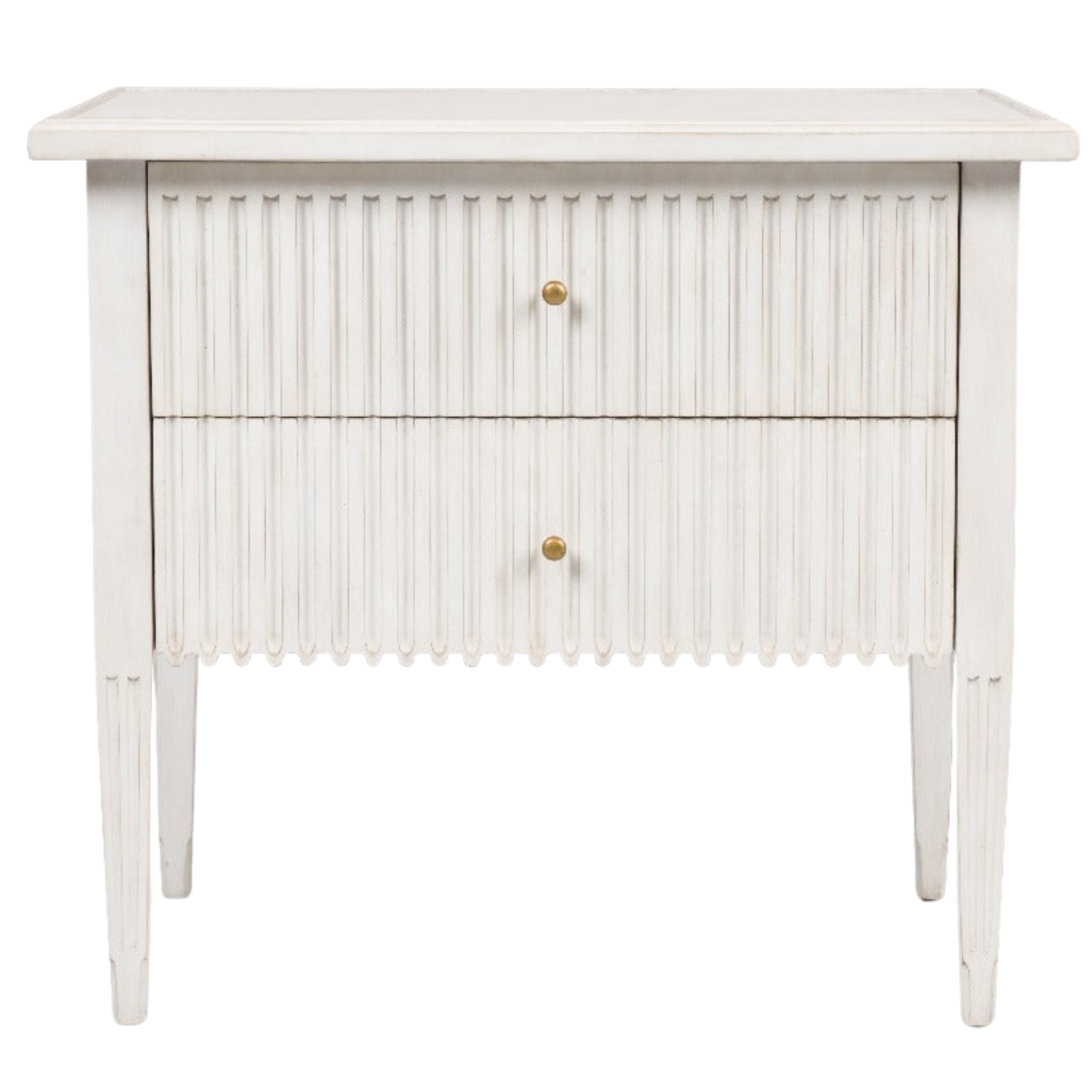 The Aldo chest has a classic white-washed painted finish applied across the full surface. Features a galleried top, fluting and pretty scalloped edge. This chest has tapered legs and brass pulls. Click images for greater detail.