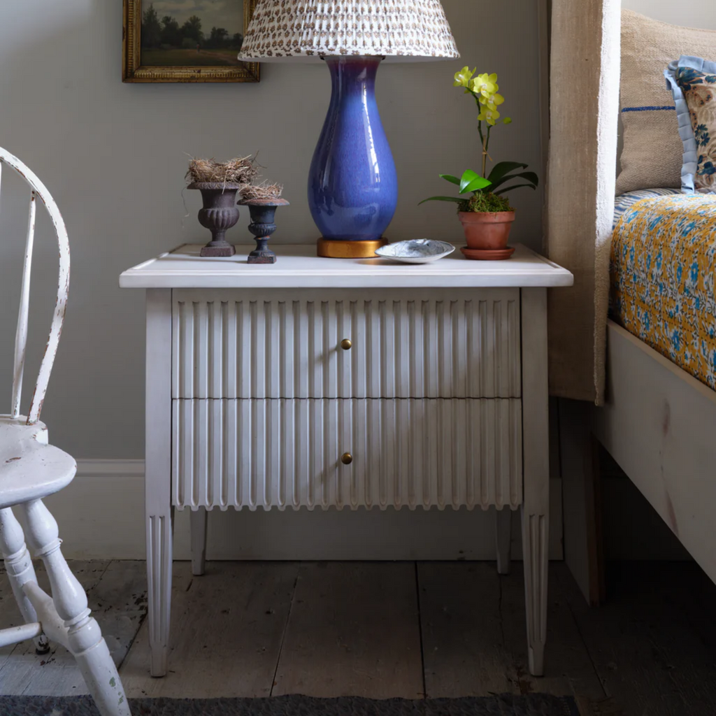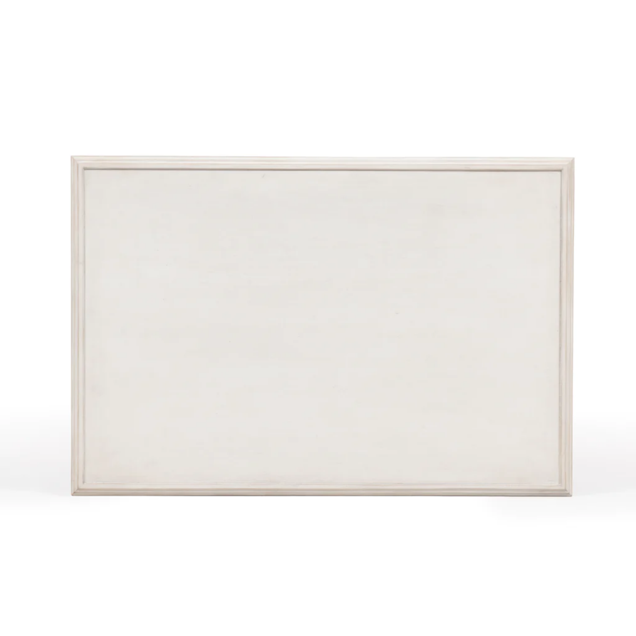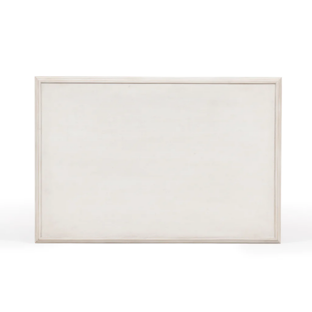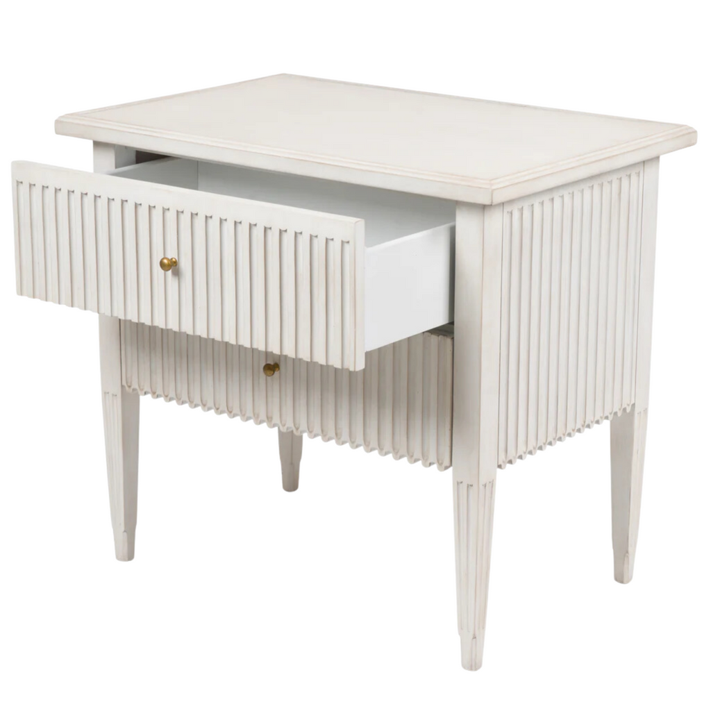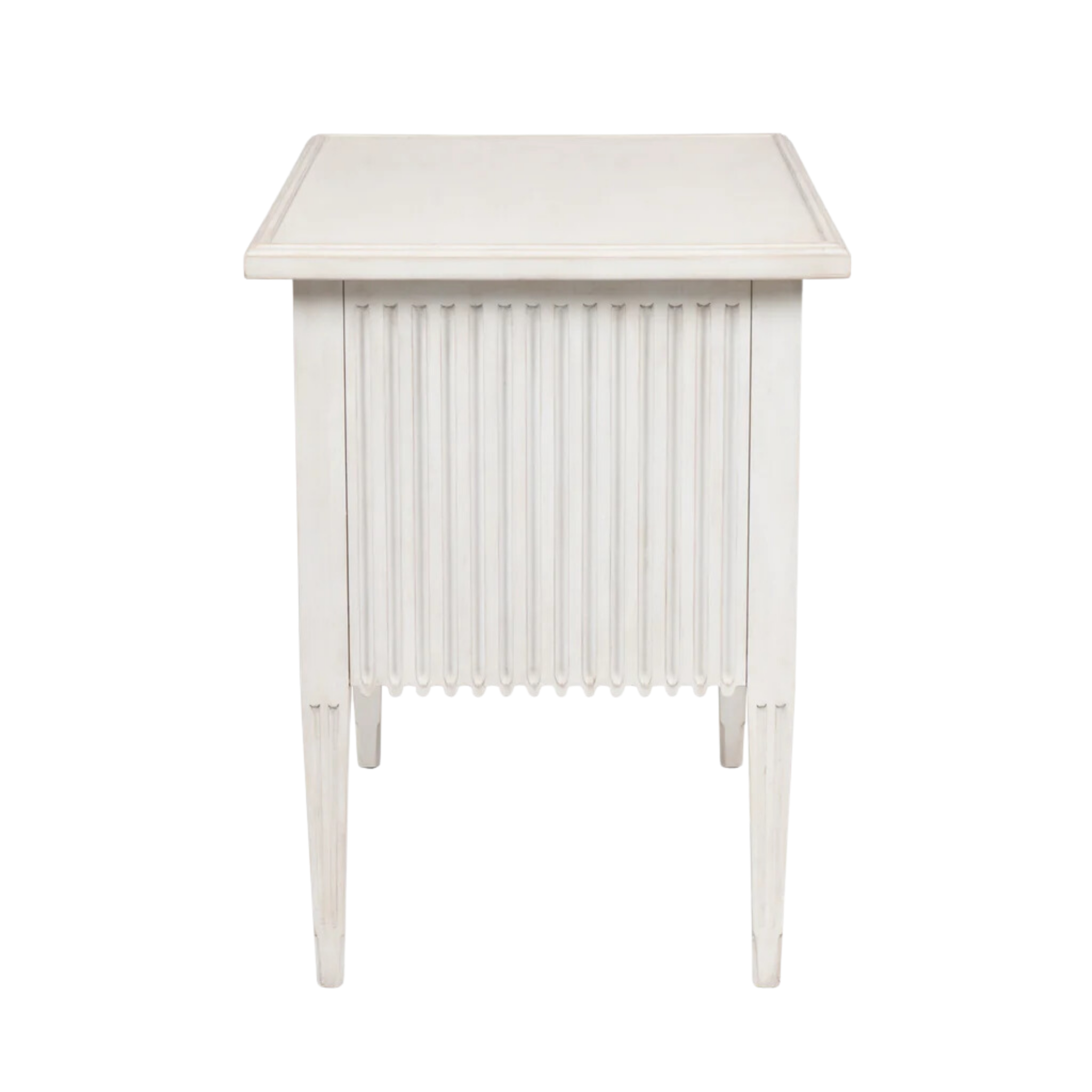The Aldo chest has a classic white-washed painted finish applied across the full surface. Features a galleried top, fluting and pretty scalloped edge. This chest has tapered legs and brass pulls. Click images for greater detail.