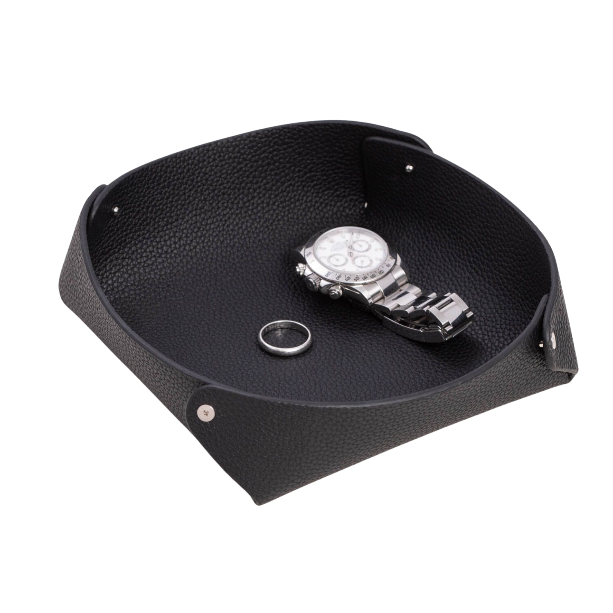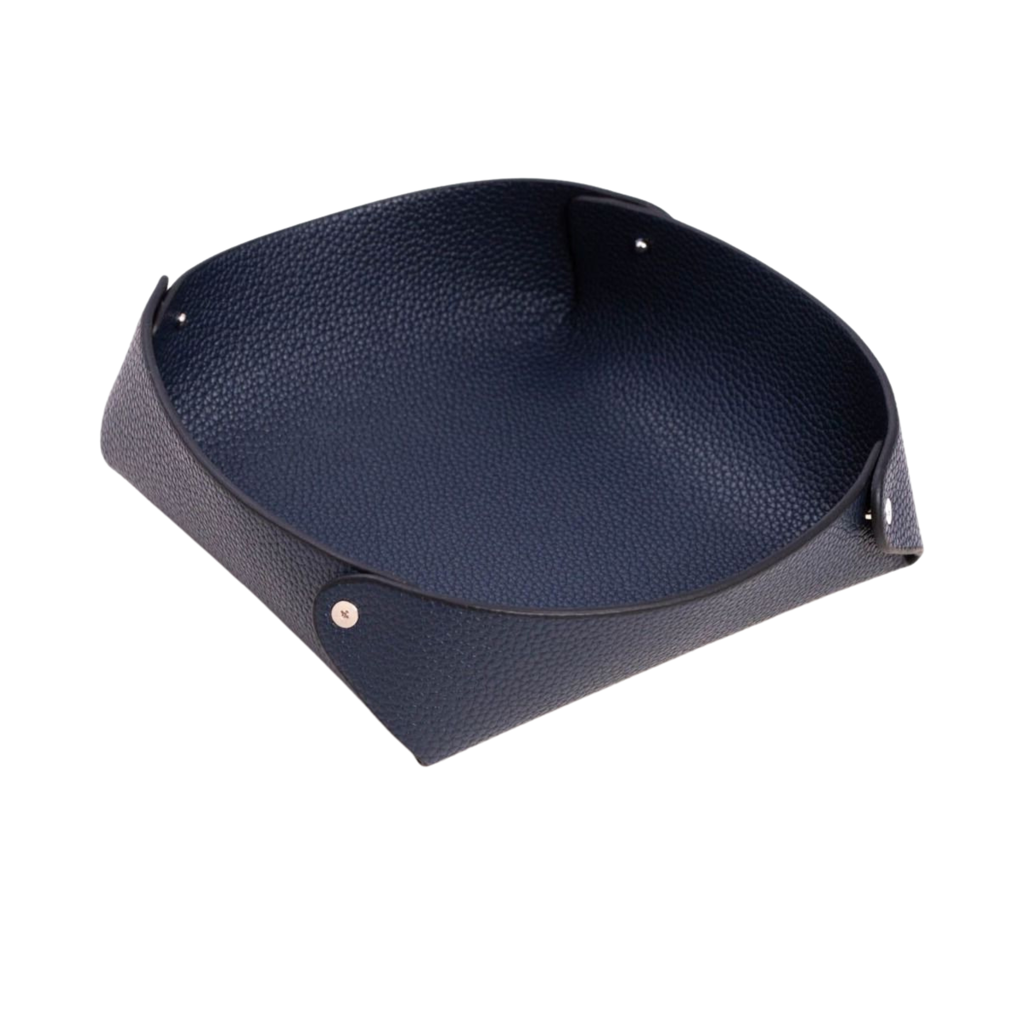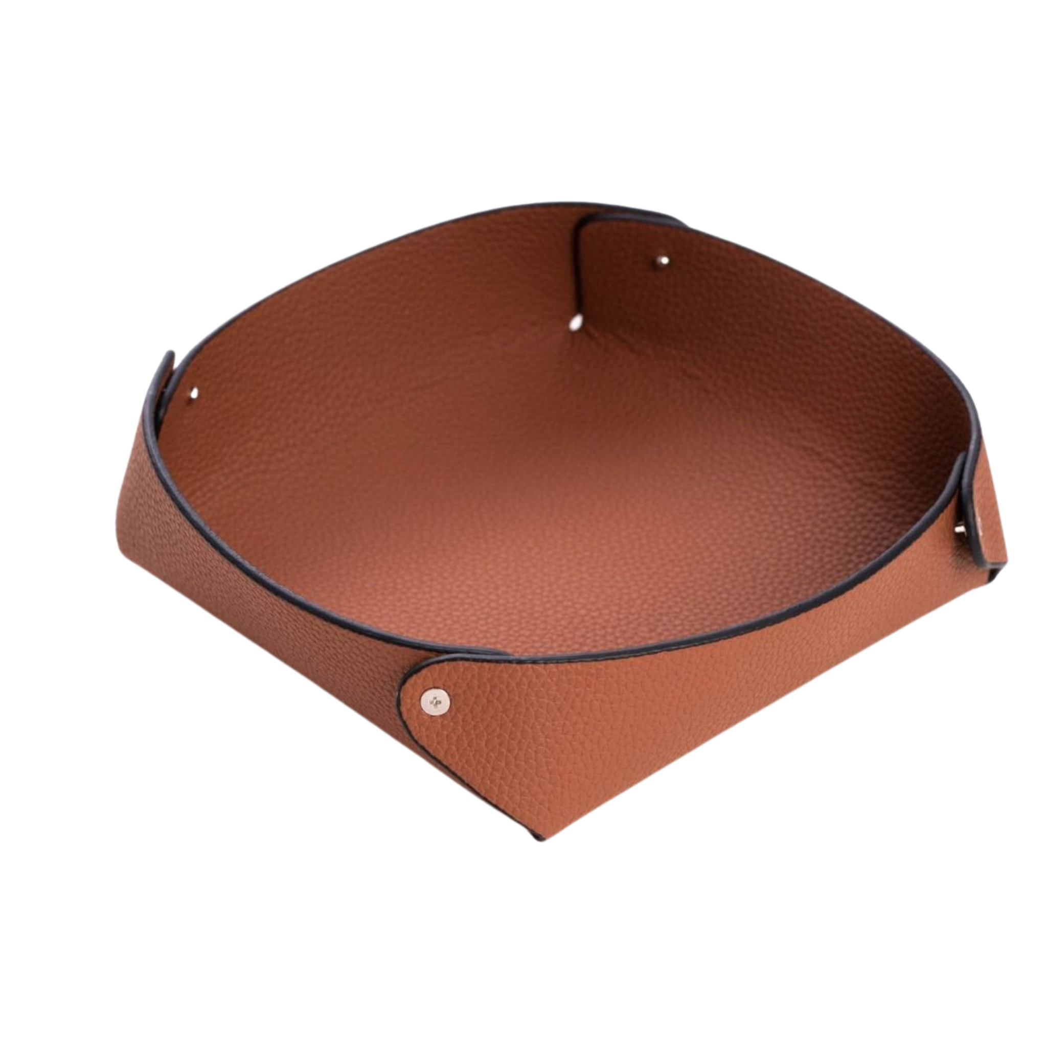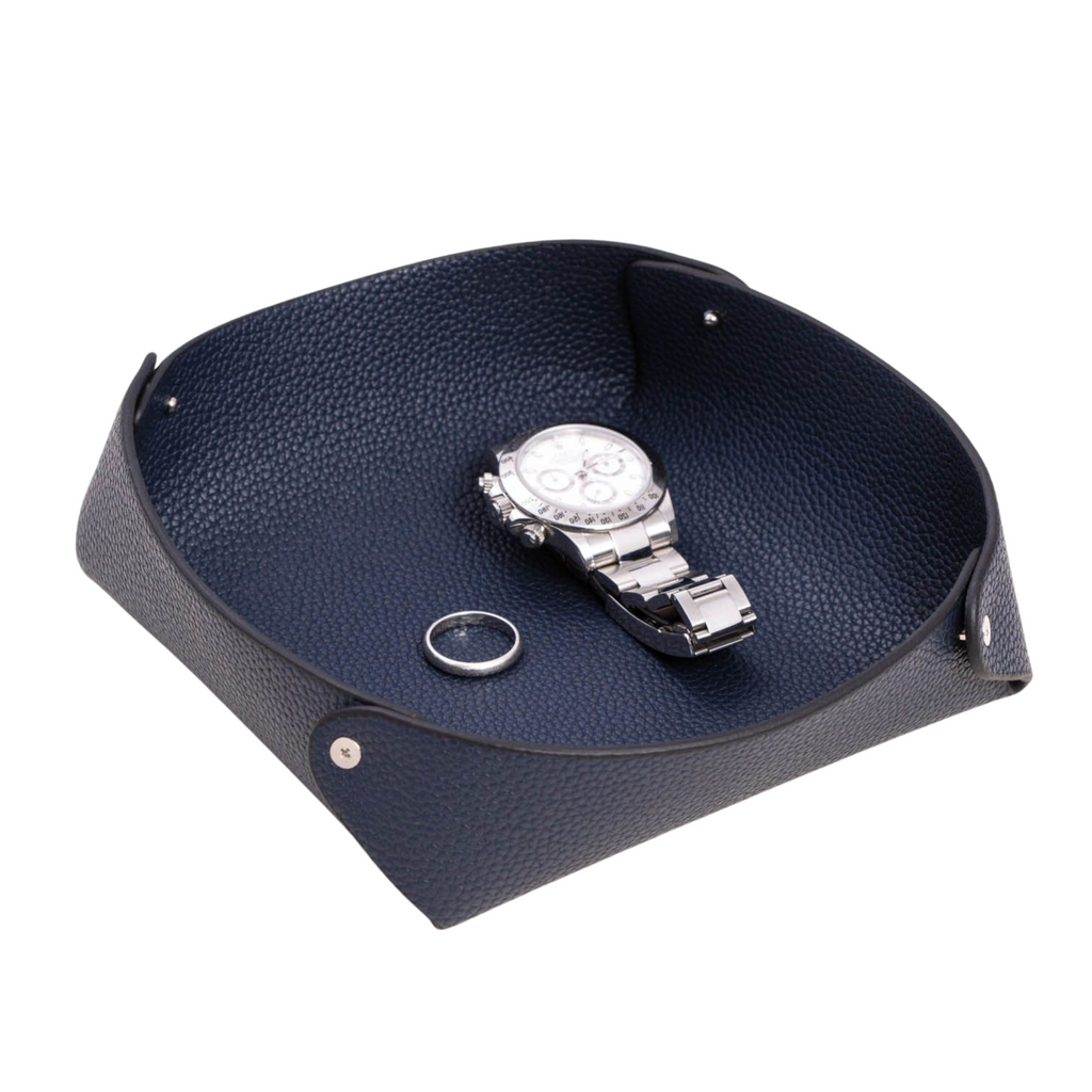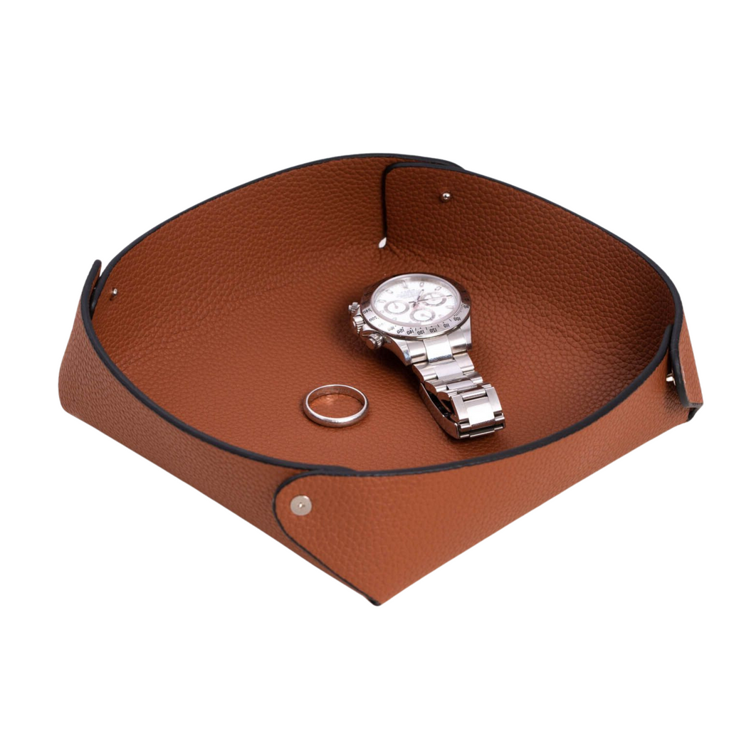 Keep your accessories readily accessible and neatly organized in our Alex leather valet tray. This leather tray sits handsomely on any nightstand, desk, dresser, or counter. The corner knuckle pins give our valet a sleek and easy way to lay flat and travel with. The perfect gift for the person who has it all! Click images for greater detail.