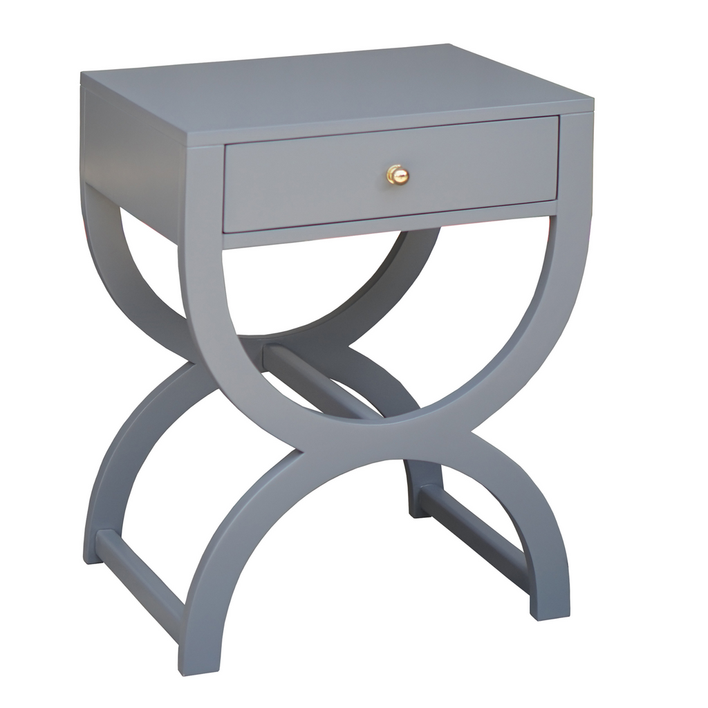 The graceful geometric legs on this one drawer side table complement a broad range of interior design styles. With a matte grey lacquer finish white lacquer finish and a delicate brass hardware pull, Alexis offers both storage and style.