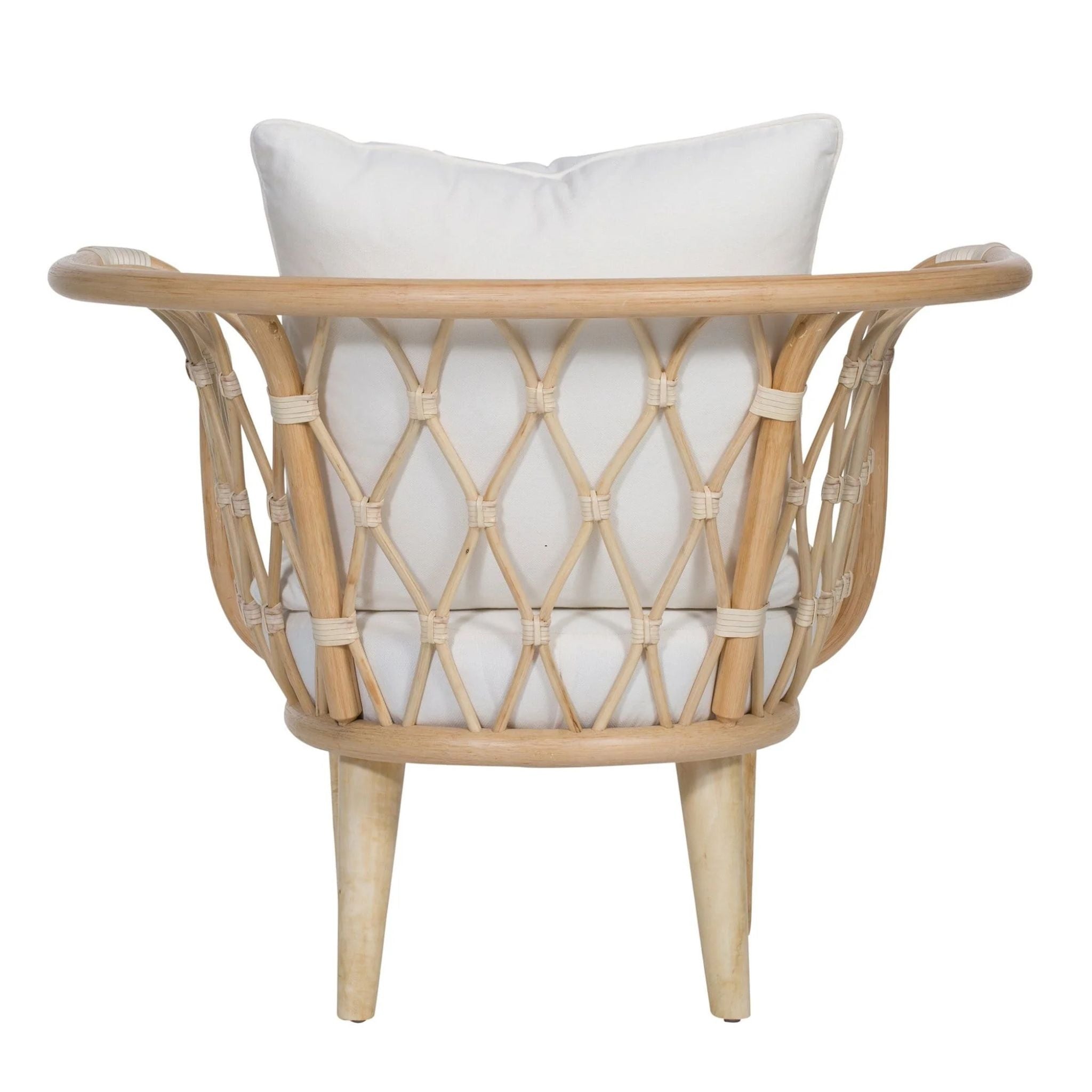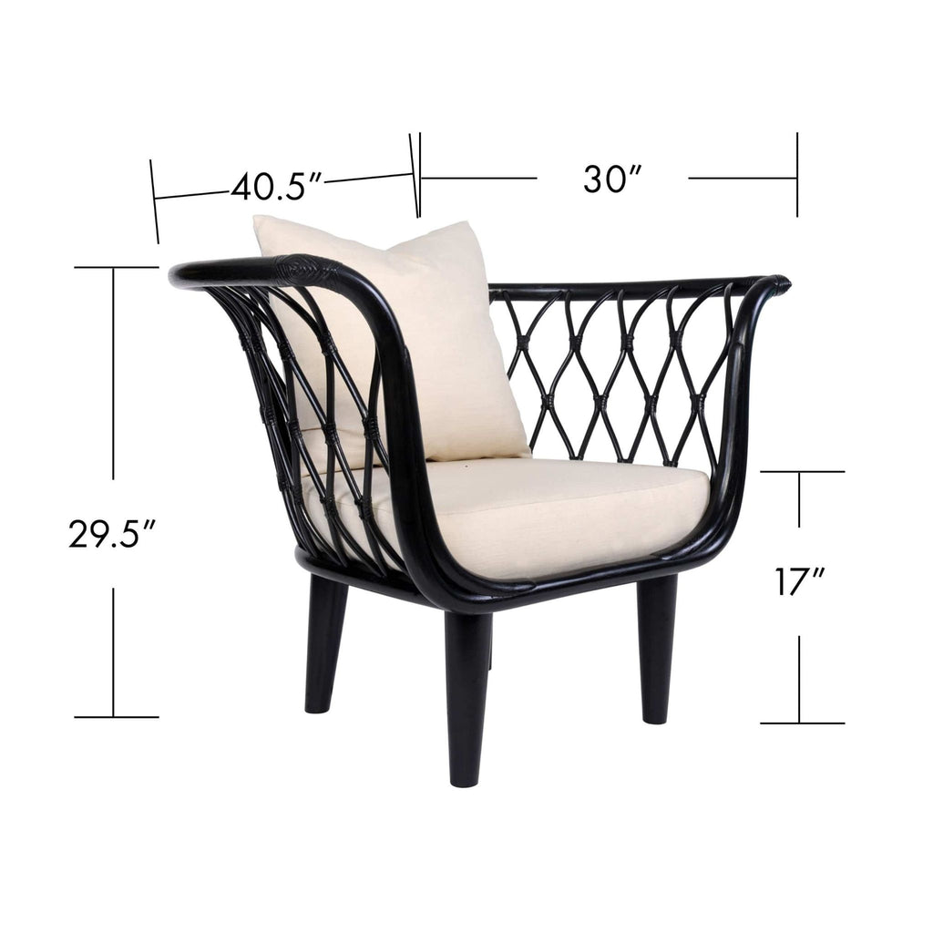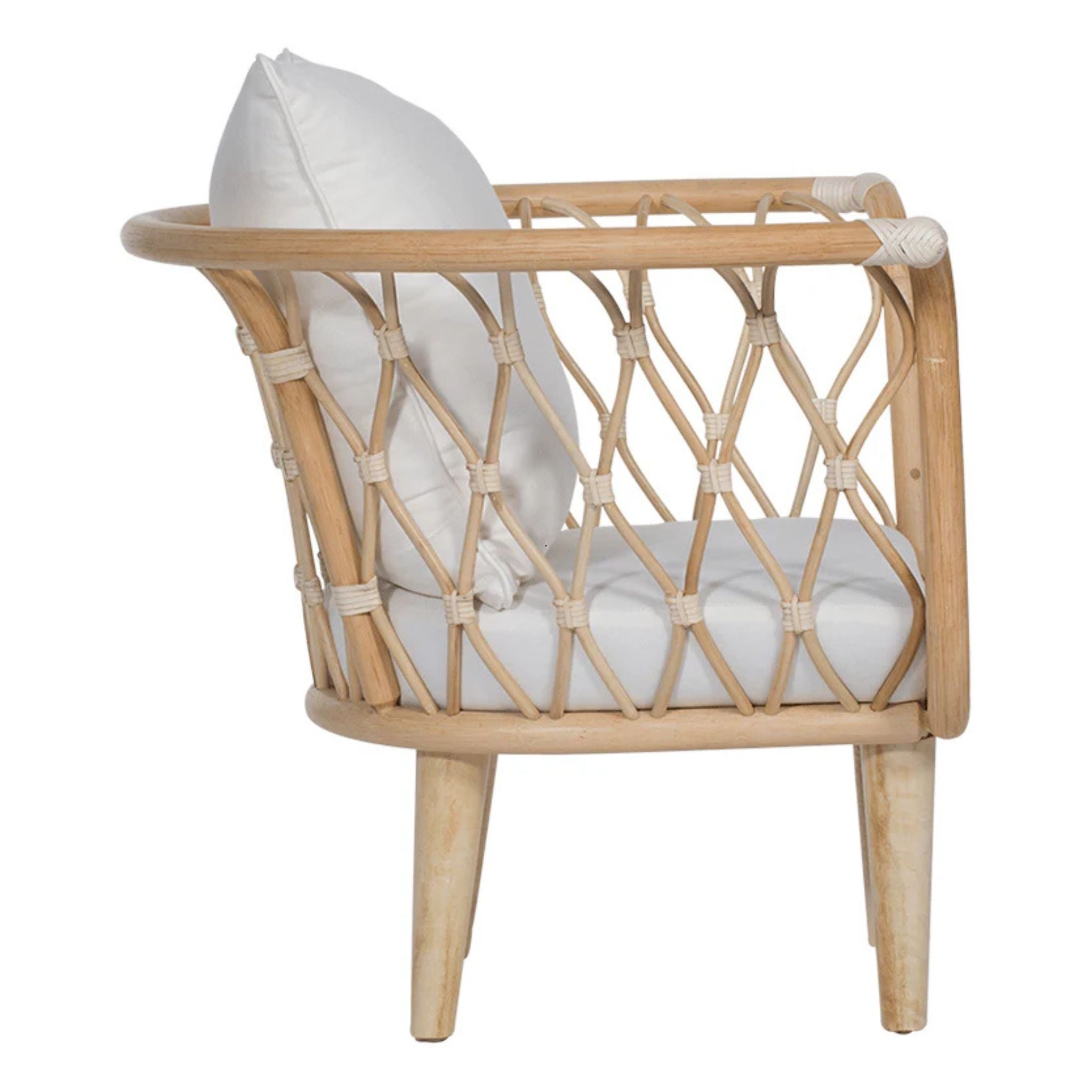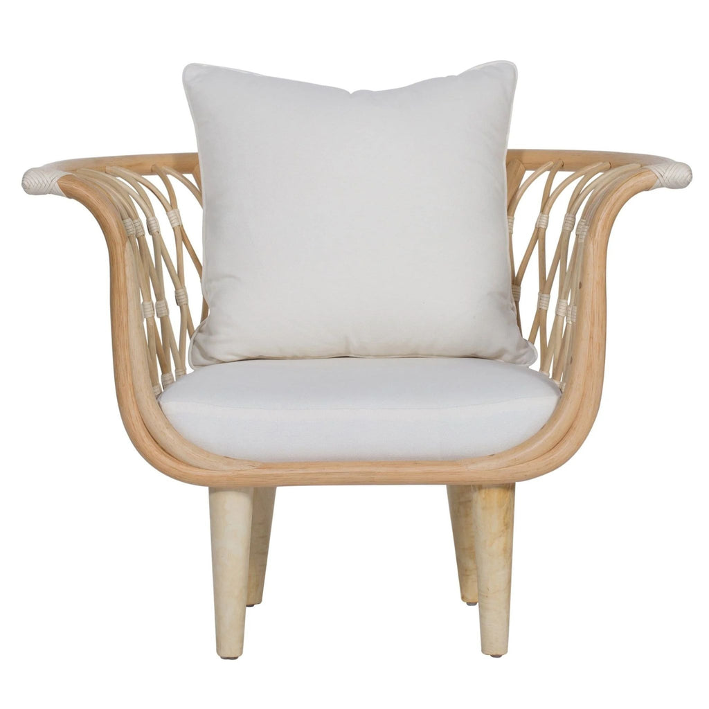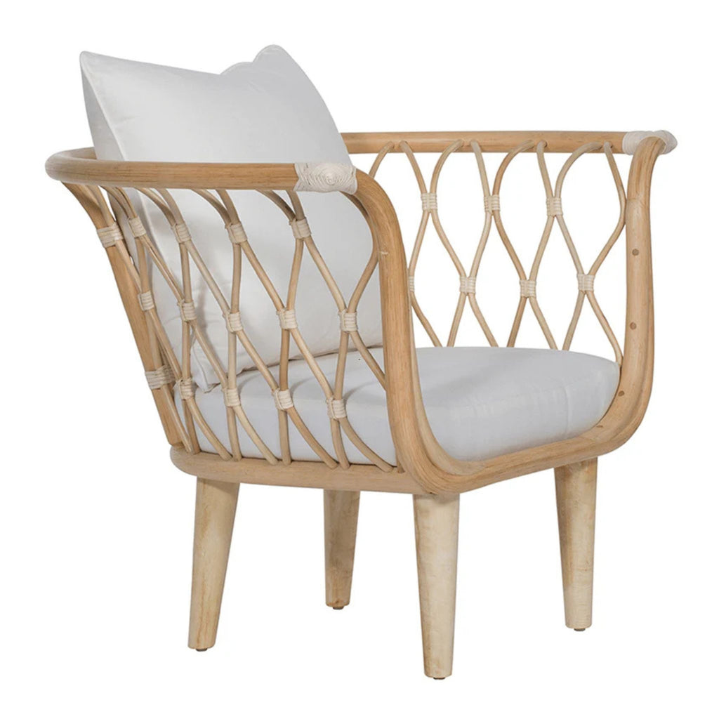 The Amsterdam Lounge Chair blends eco-friendly craftsmanship with modern comfort, featuring a rattan frame, rawhide bindings, and sturdy wood legs. Finished in Heirloom or Natural with Natural Performance fabric cushions and a matching throw pillow.