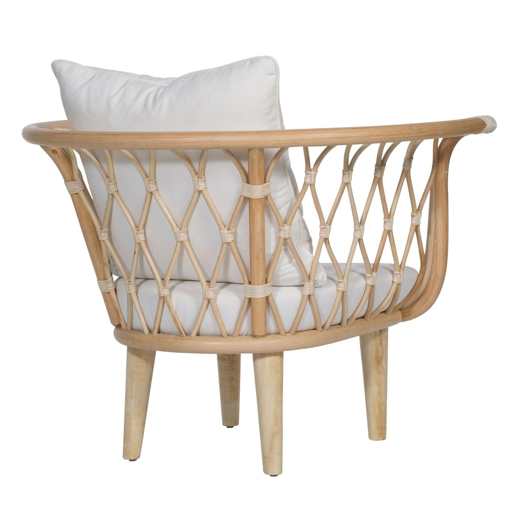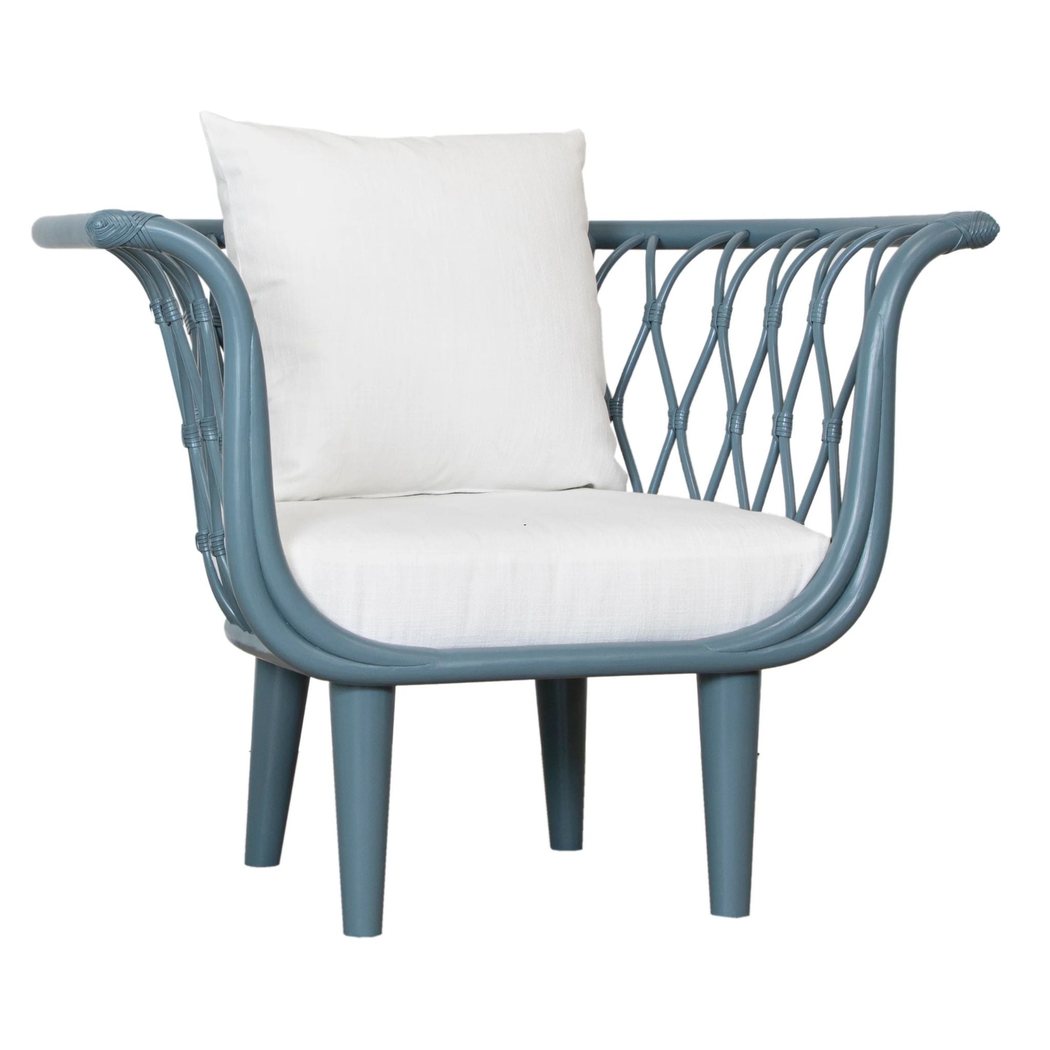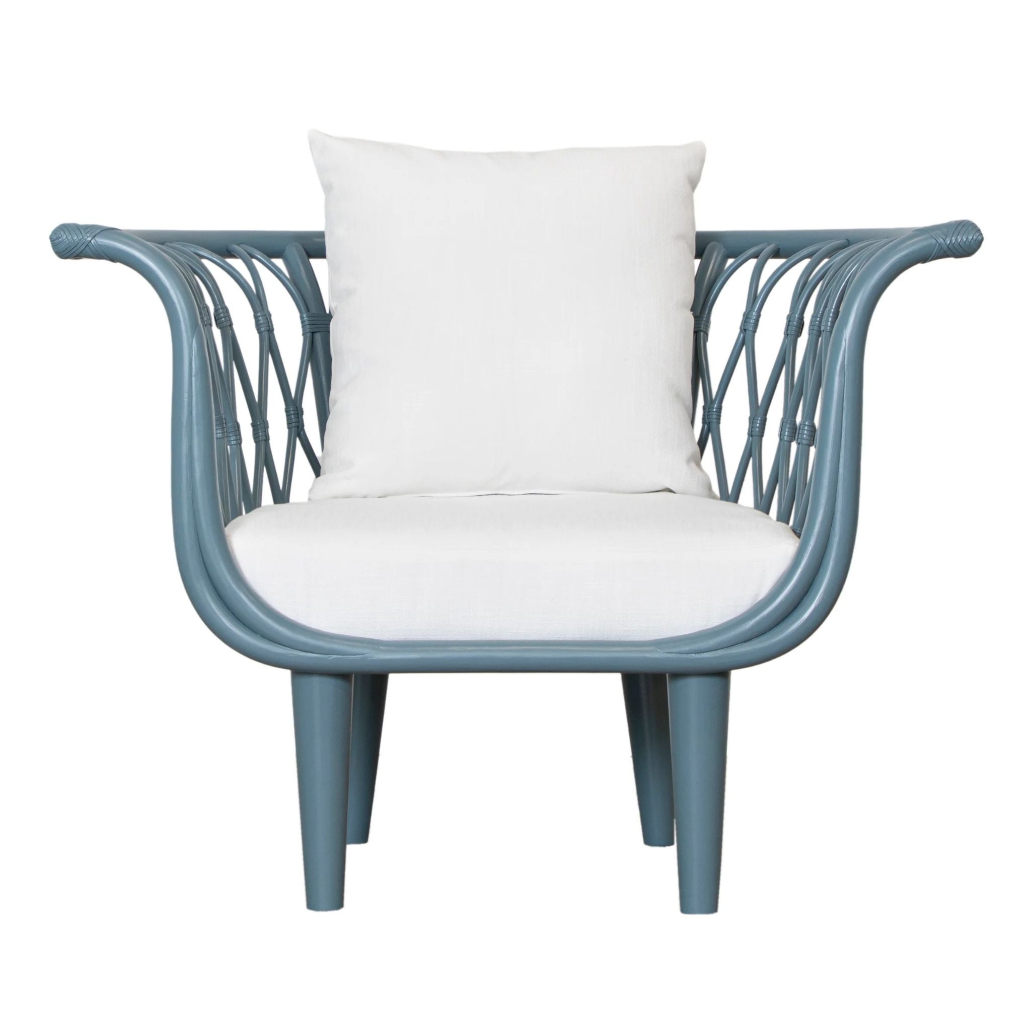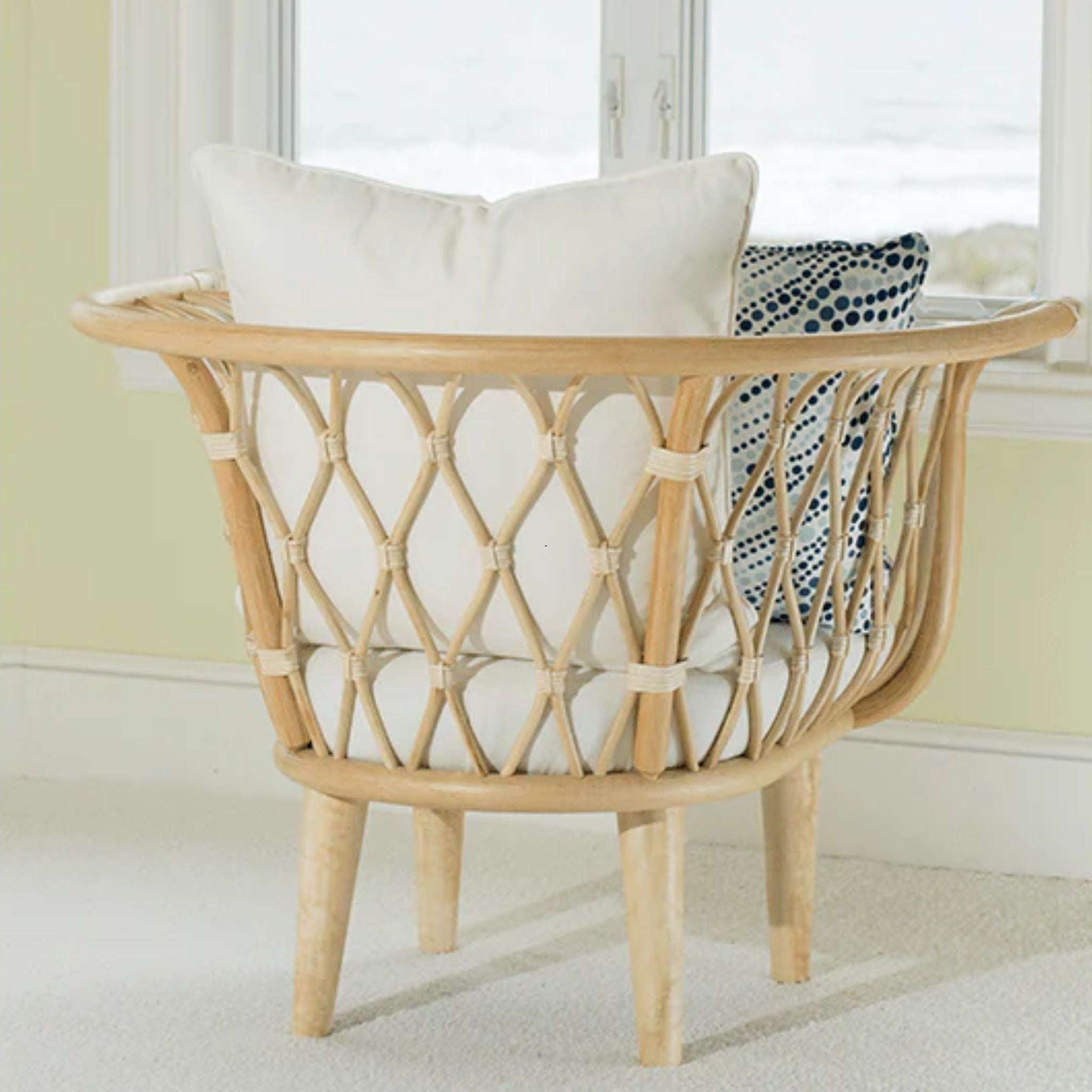 The Amsterdam Lounge Chair blends eco-friendly craftsmanship with modern comfort, featuring a rattan frame, rawhide bindings, and sturdy wood legs. Finished in Heirloom or Natural with Natural Performance fabric cushions and a matching throw pillow.