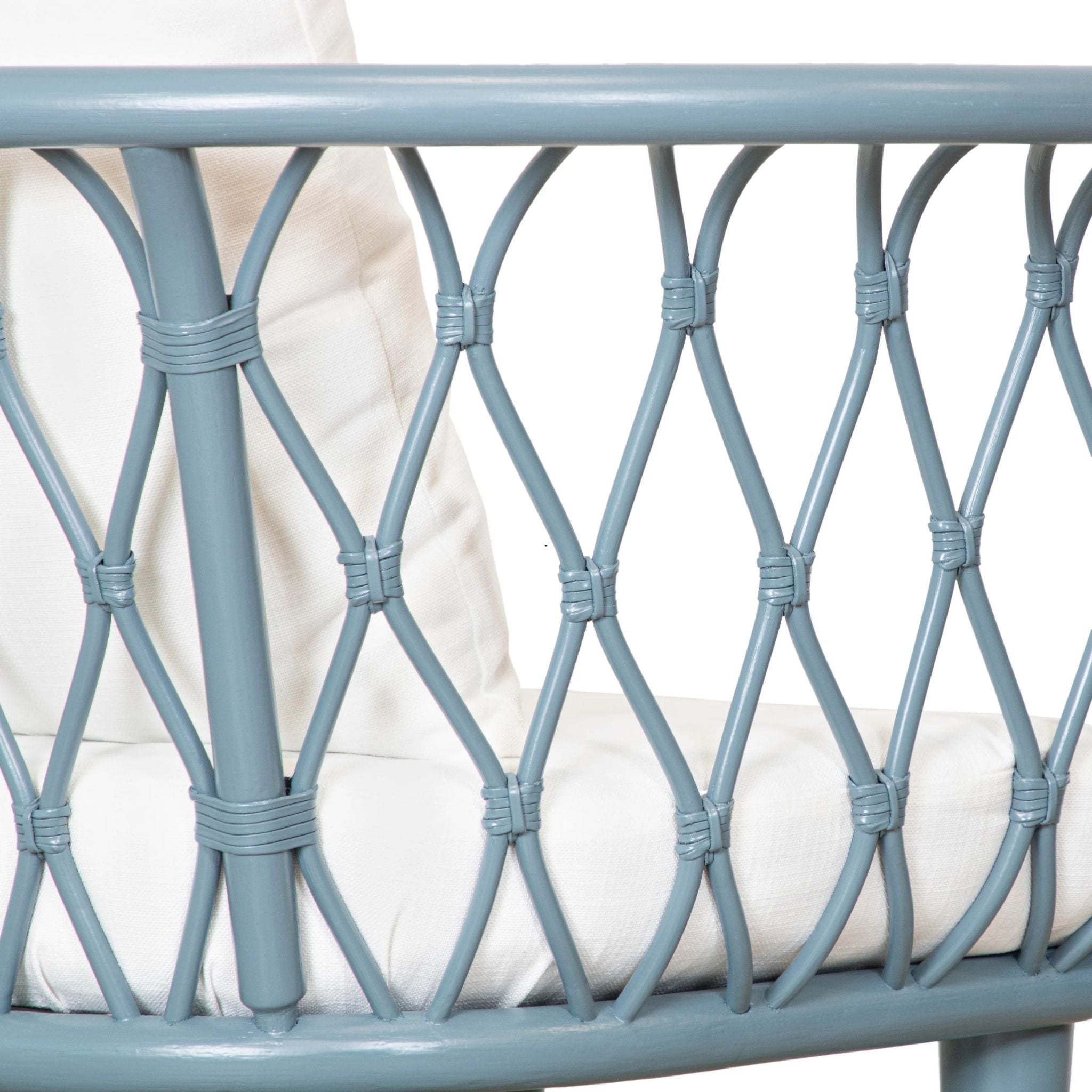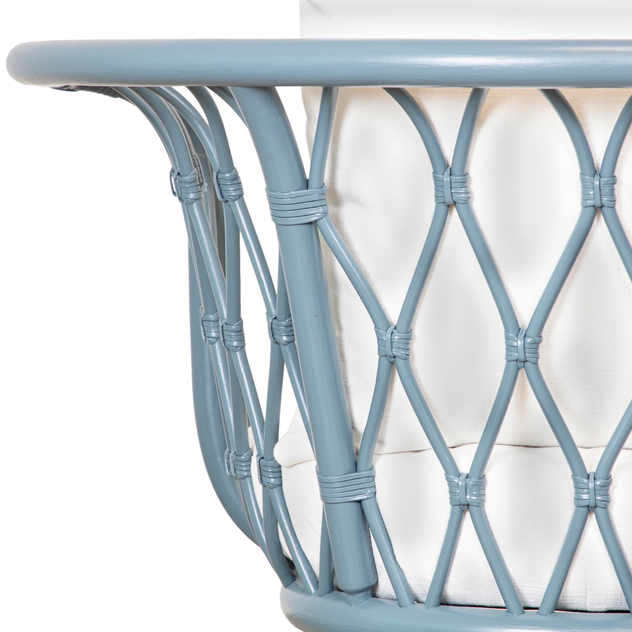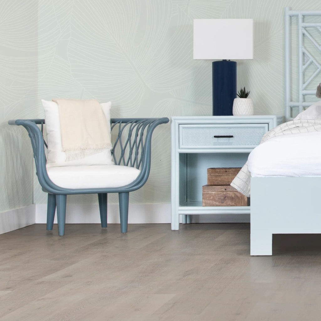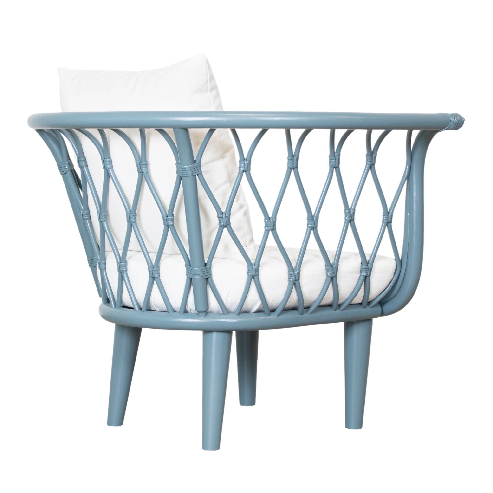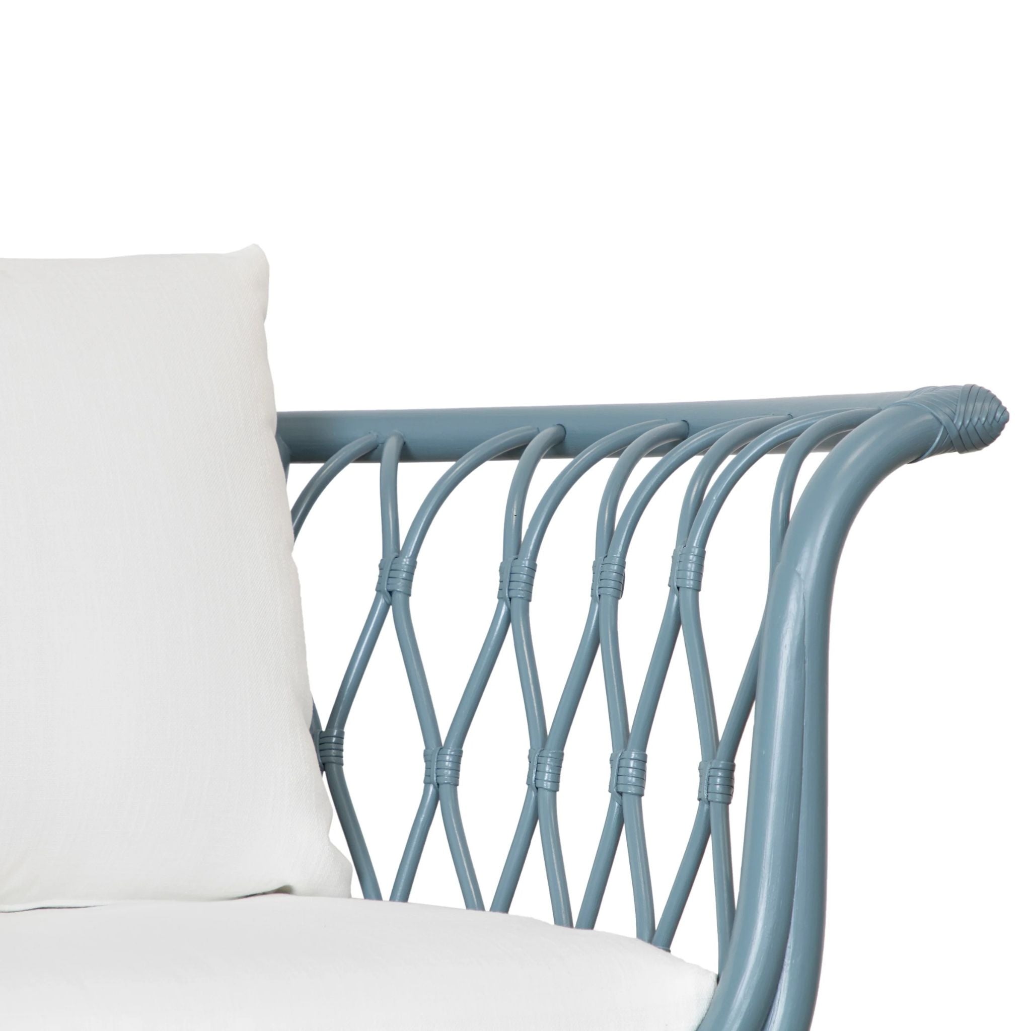 The Amsterdam Lounge Chair blends eco-friendly craftsmanship with modern comfort, featuring a rattan frame, rawhide bindings, and sturdy wood legs. Finished in Heirloom or Natural with Natural Performance fabric cushions and a matching throw pillow.