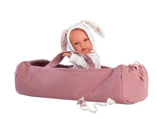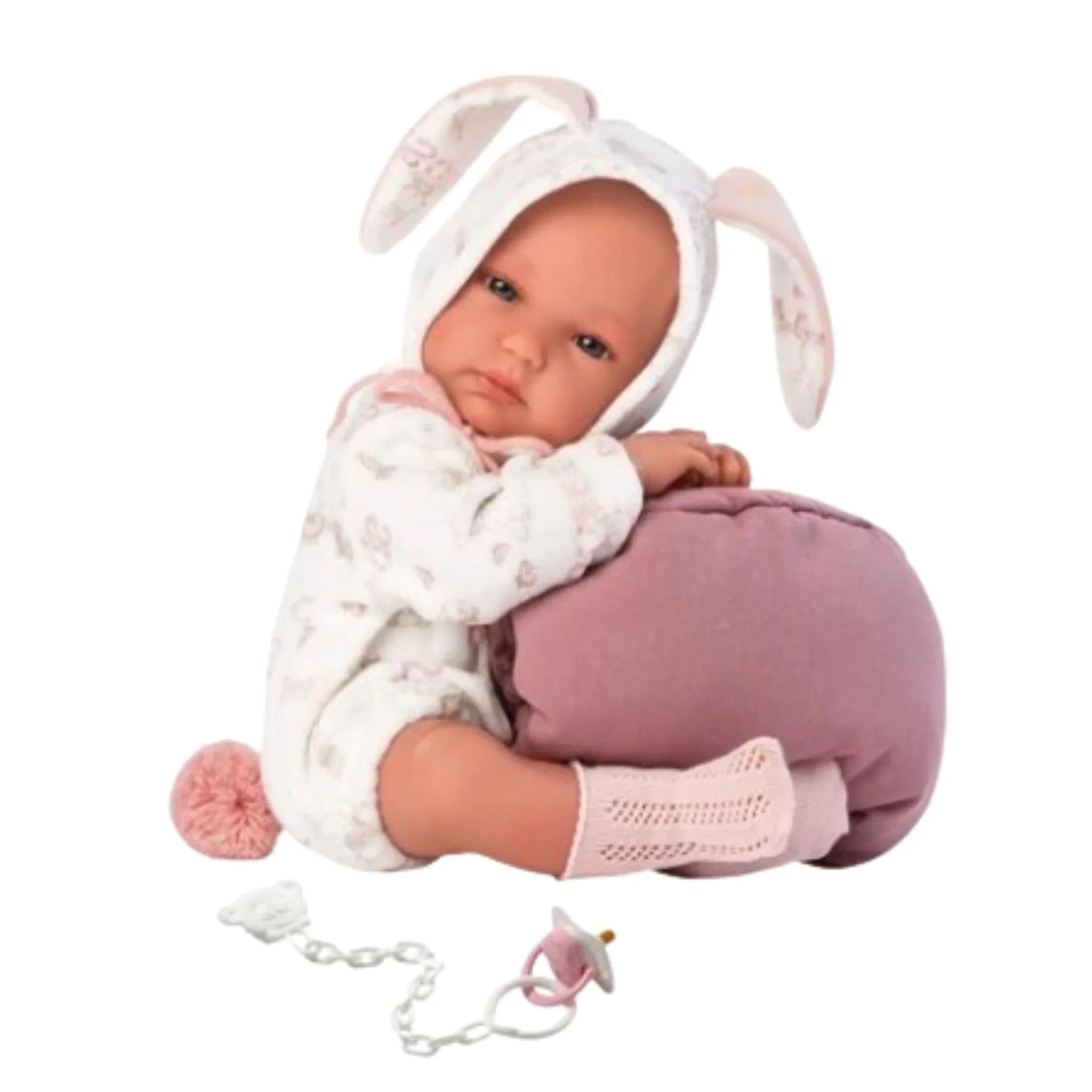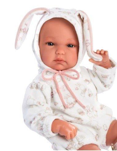 Anna is the perfect first baby doll. Her small size is perfect for toddlers to hold and cherish. She is dressed in an adorable long-sleeve onesie that includes a sweet hood with bunny ears. Bright blue eyes and a smooth baby complexion. Adorable baby fingers and toes, baby rolls on belly and legs.