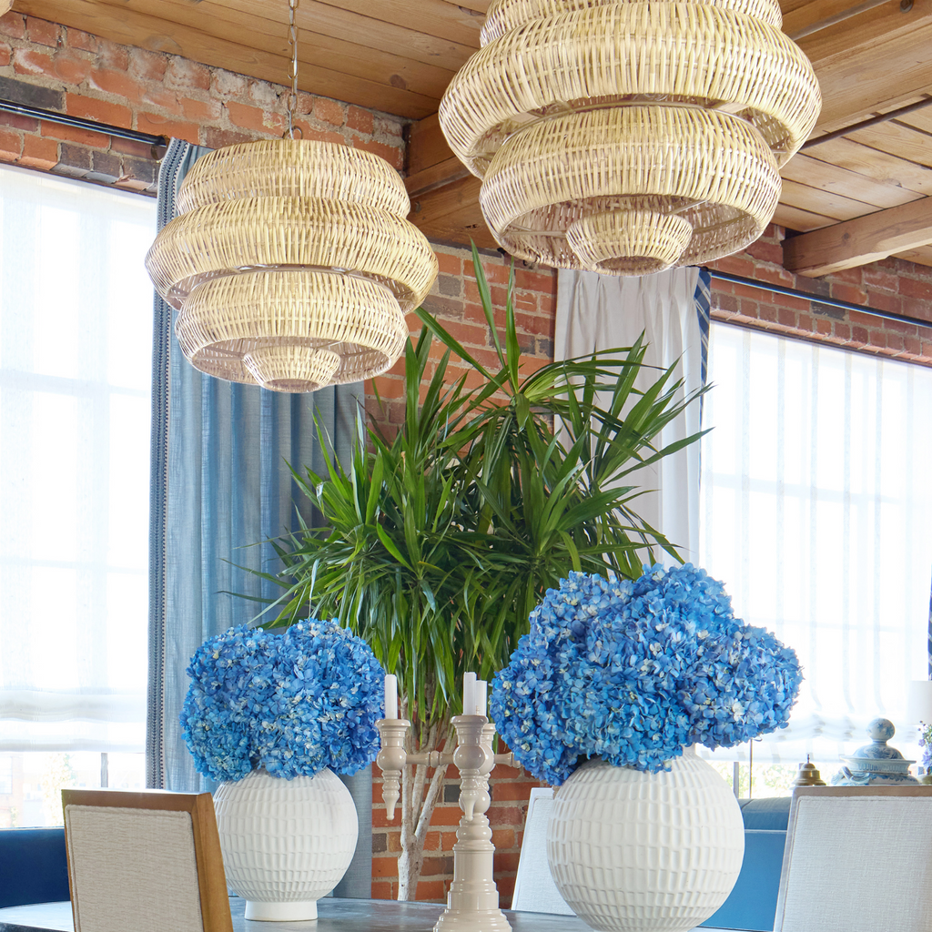 Painstakingly woven by artisans who use traditional techniques, the Antibes Grande White Chandelier is a marriage of artistry and high-quality construction. Natural bleached rattan forms the body of this geometric chandelier shaped by a wrought iron frame in a snow-white finish. This is a large chandelier at 48 inches in diameter. The 18 lights reflect through the tight weave to create subtle patterns when the chandelier is illuminated.