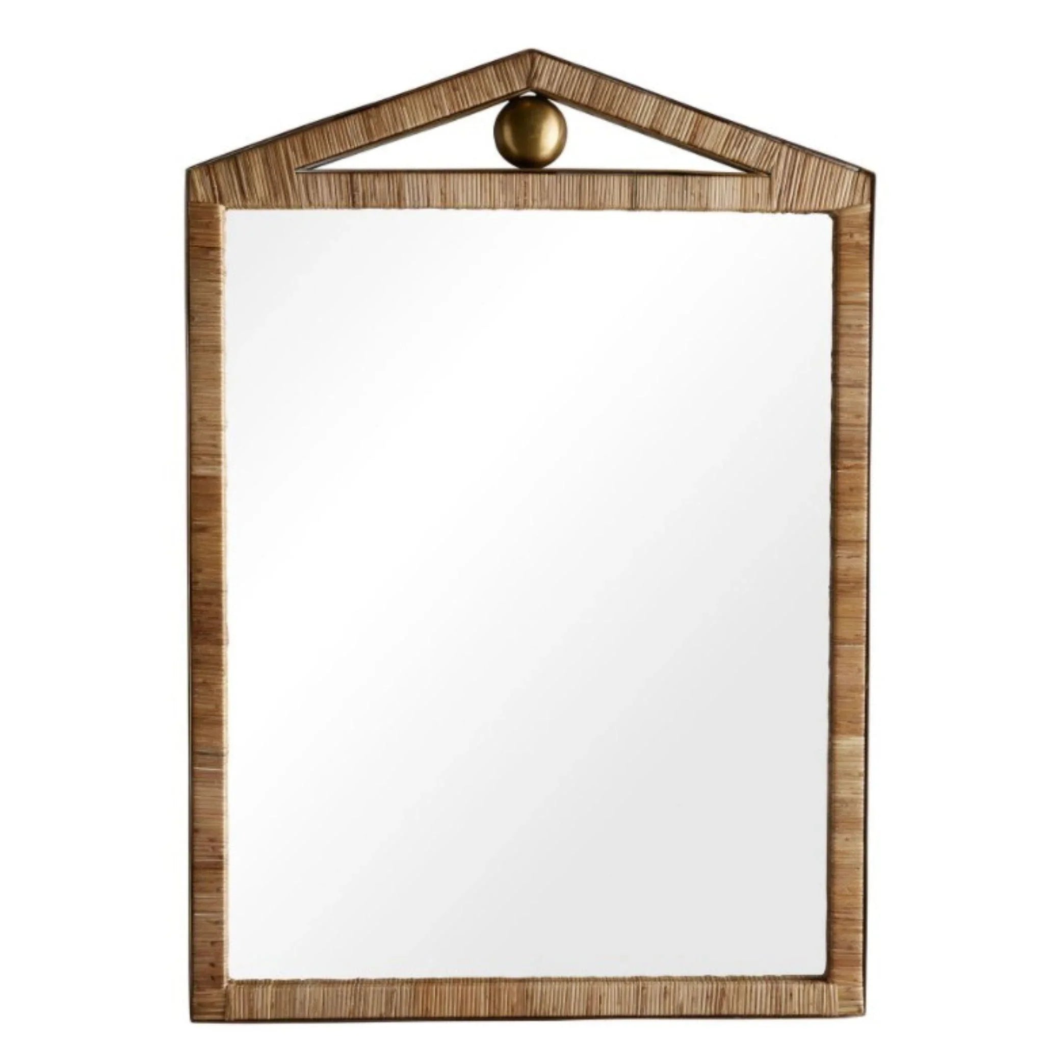 This classic Caribe Wall Mirror is framed in a natural rattan wrapping with a central antique brass sphere accent. Rattan will vary. Measures: 40.5"H x 28.5"W x 1.5"D.