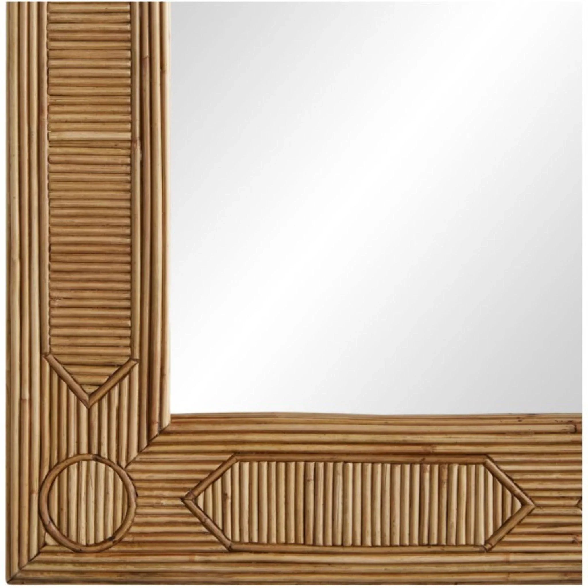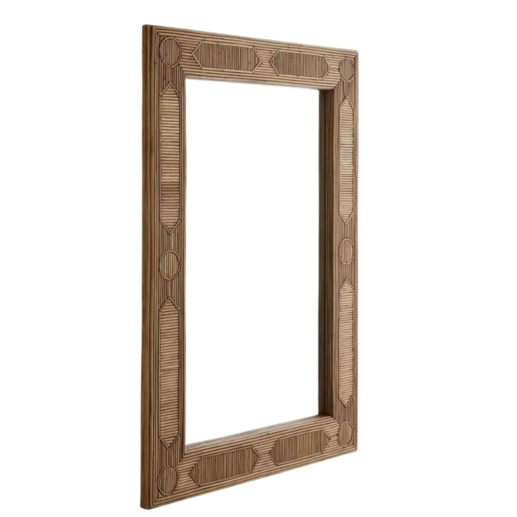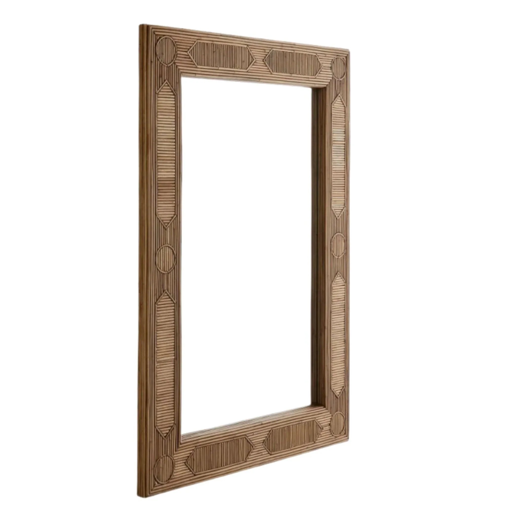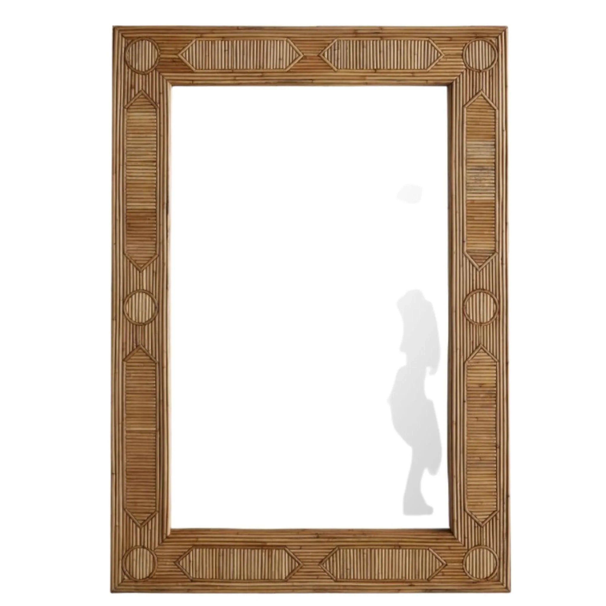 The geometric inlay of natural rattan creates a decorative patterned frame surrounding a plain rectangular mirror. Rattan will vary.
