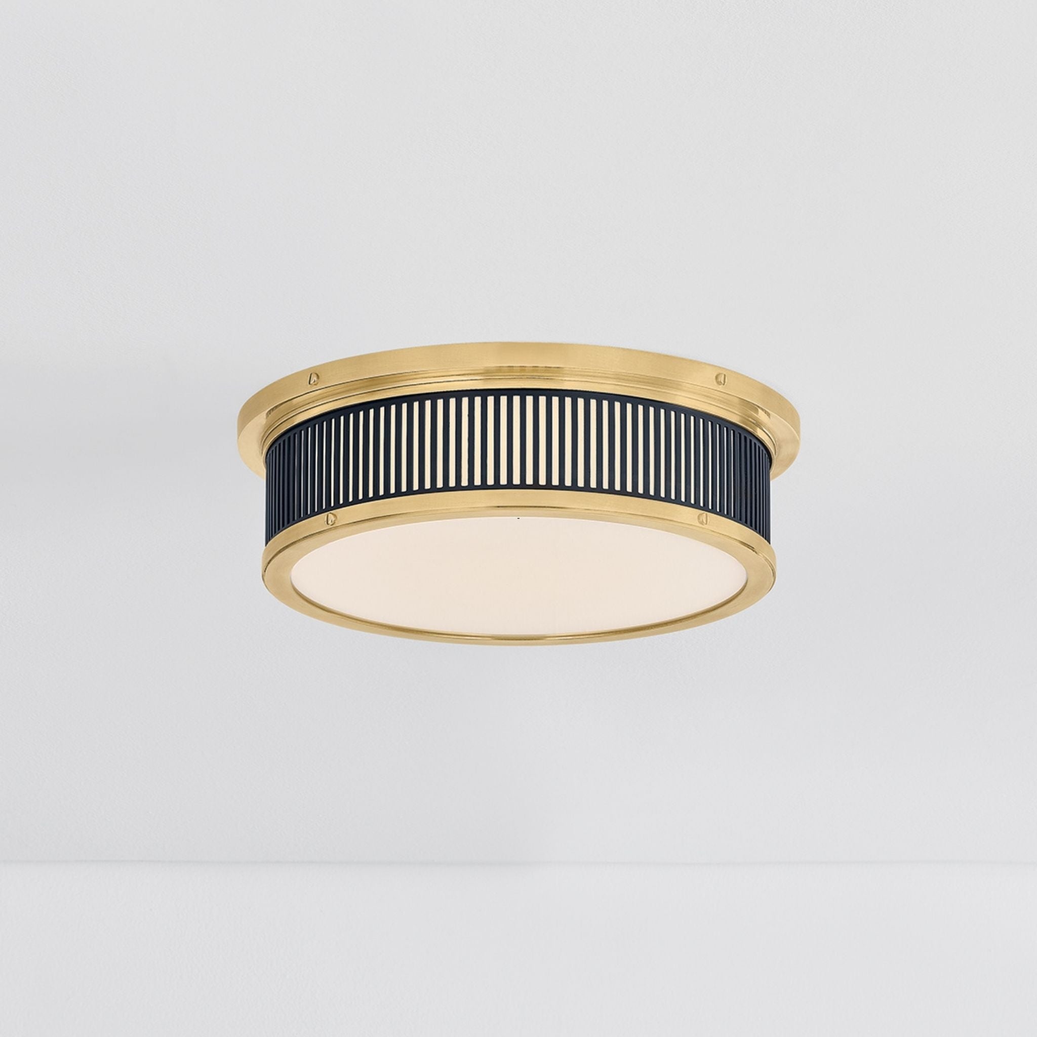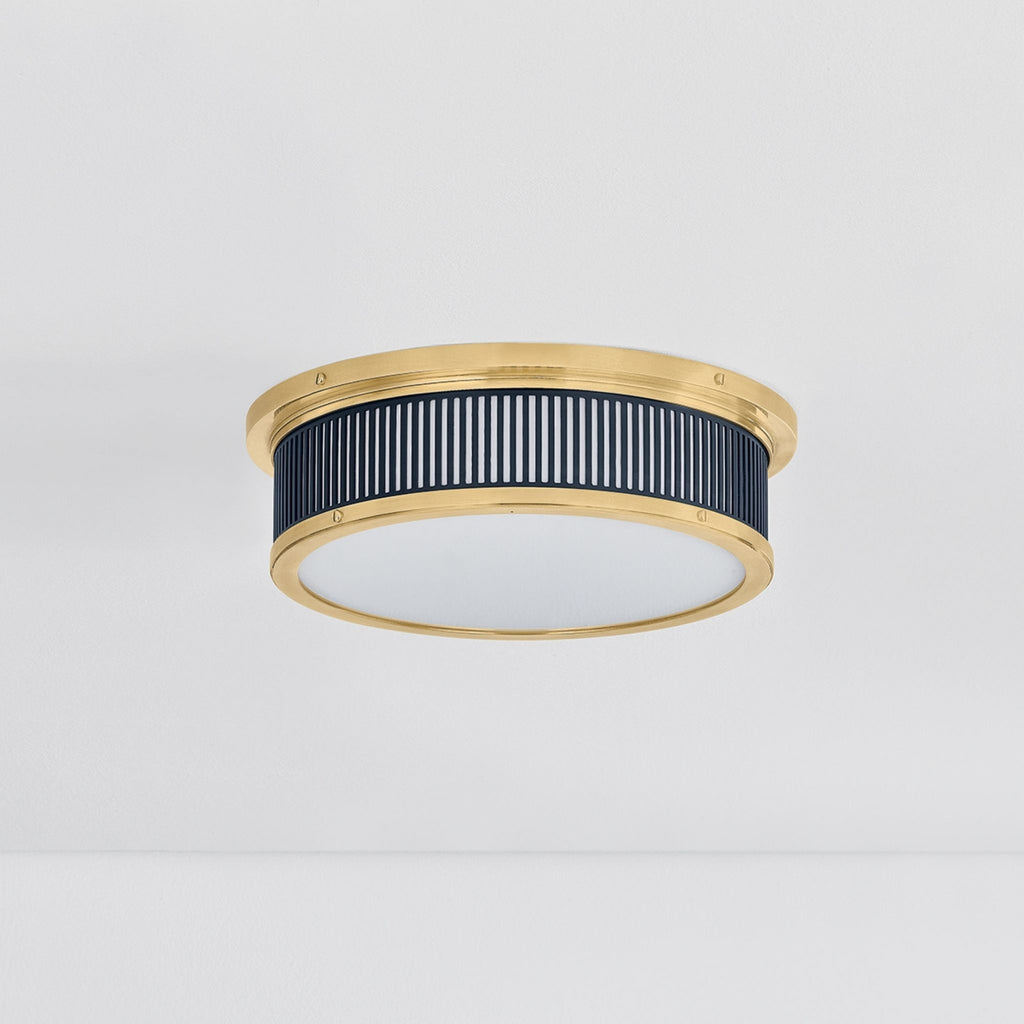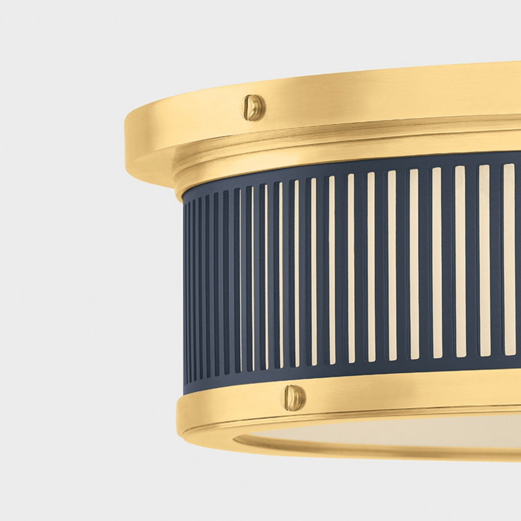By blending classic and contemporary elements, the Ashdown family offers a new take on sophisticated ceiling lighting. These flush mounts feature Mark D. Sikes' signature brass screw accents and a white glass shade. The distinctive geometric perforations on the frame provide another decorative detail.