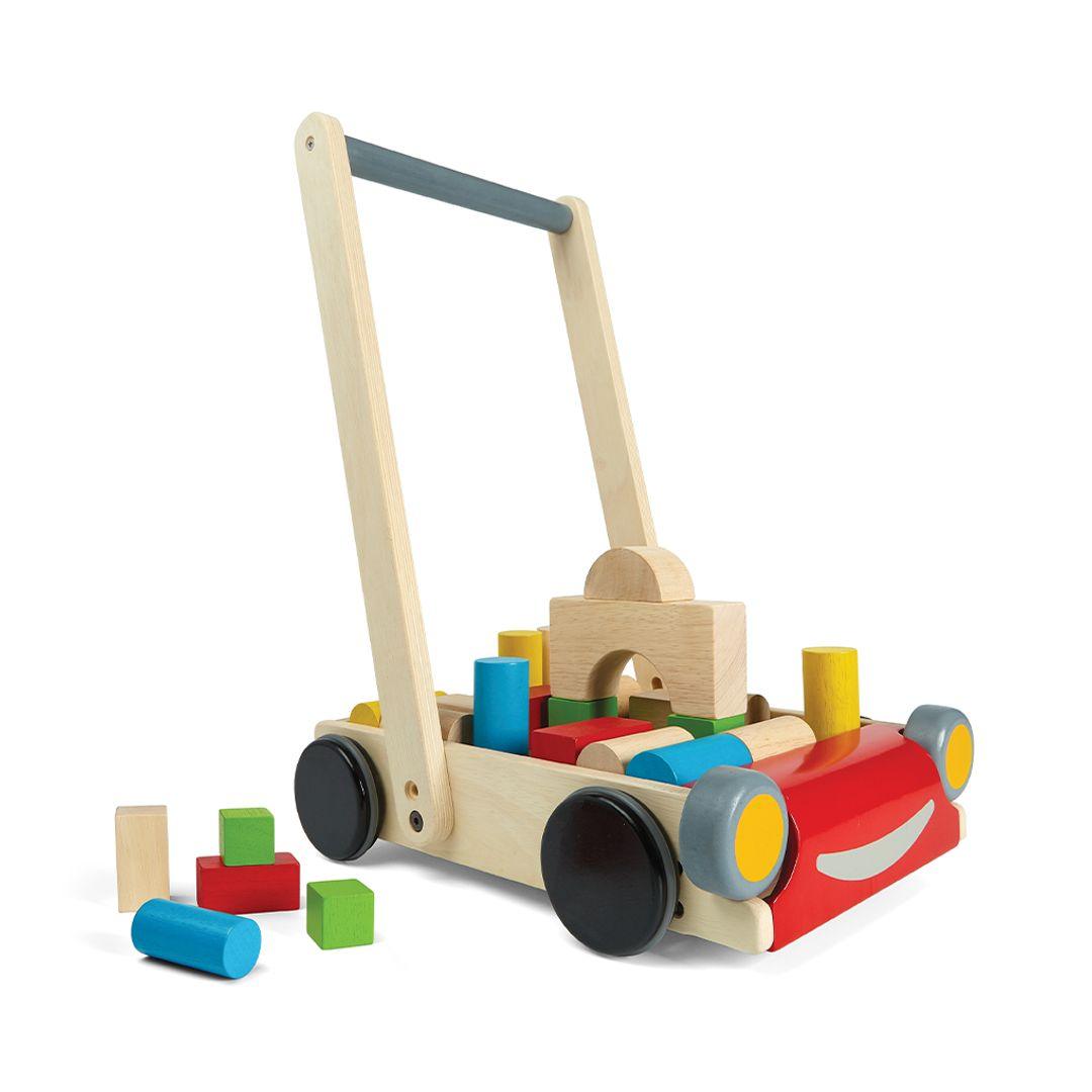 Cruise through early developmental stages with the PlanToys Baby Walker! This toy can help develop fine and gross motor skills while encouraging children to walk on their own two feet. The handle is adjustable to fit various heights. Plus, this Baby Walker comes with 13 colored and 11 natural wooden blocks so children can create and build things with their imagination.