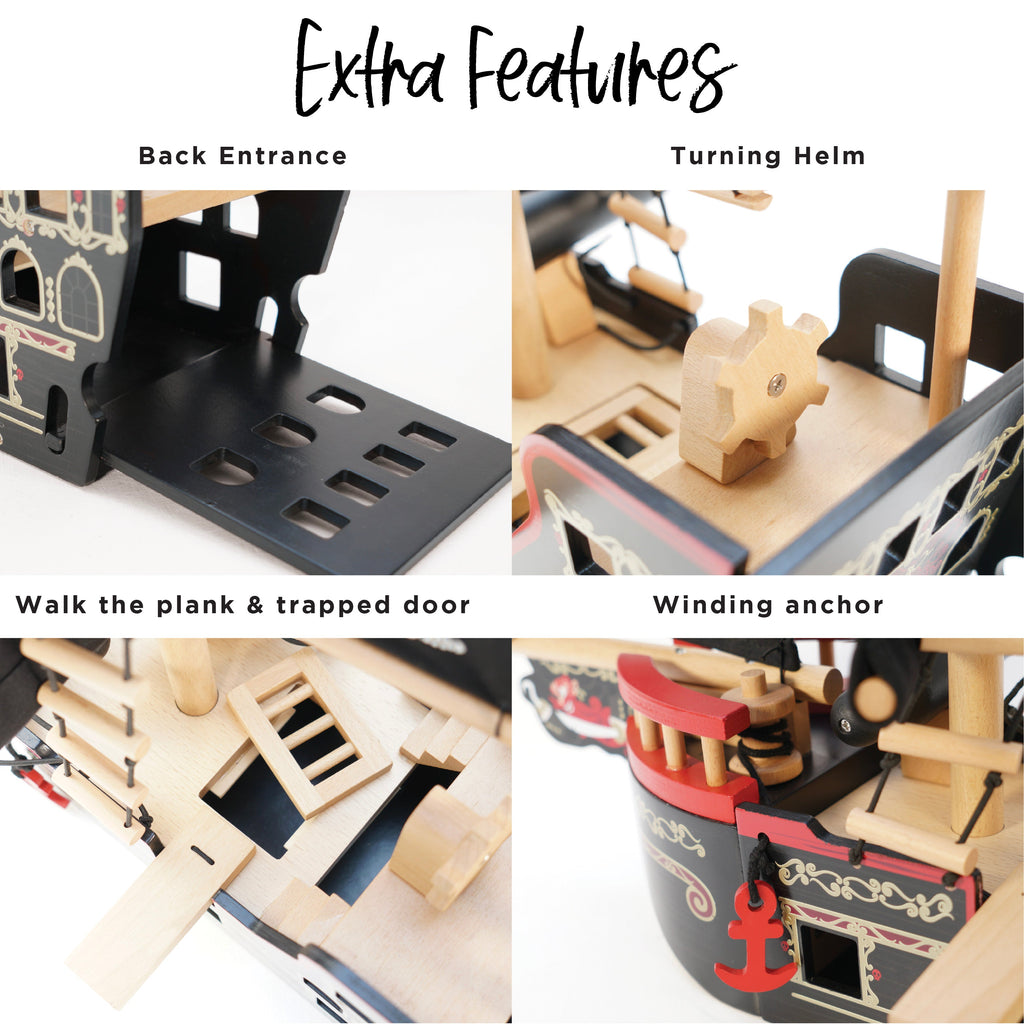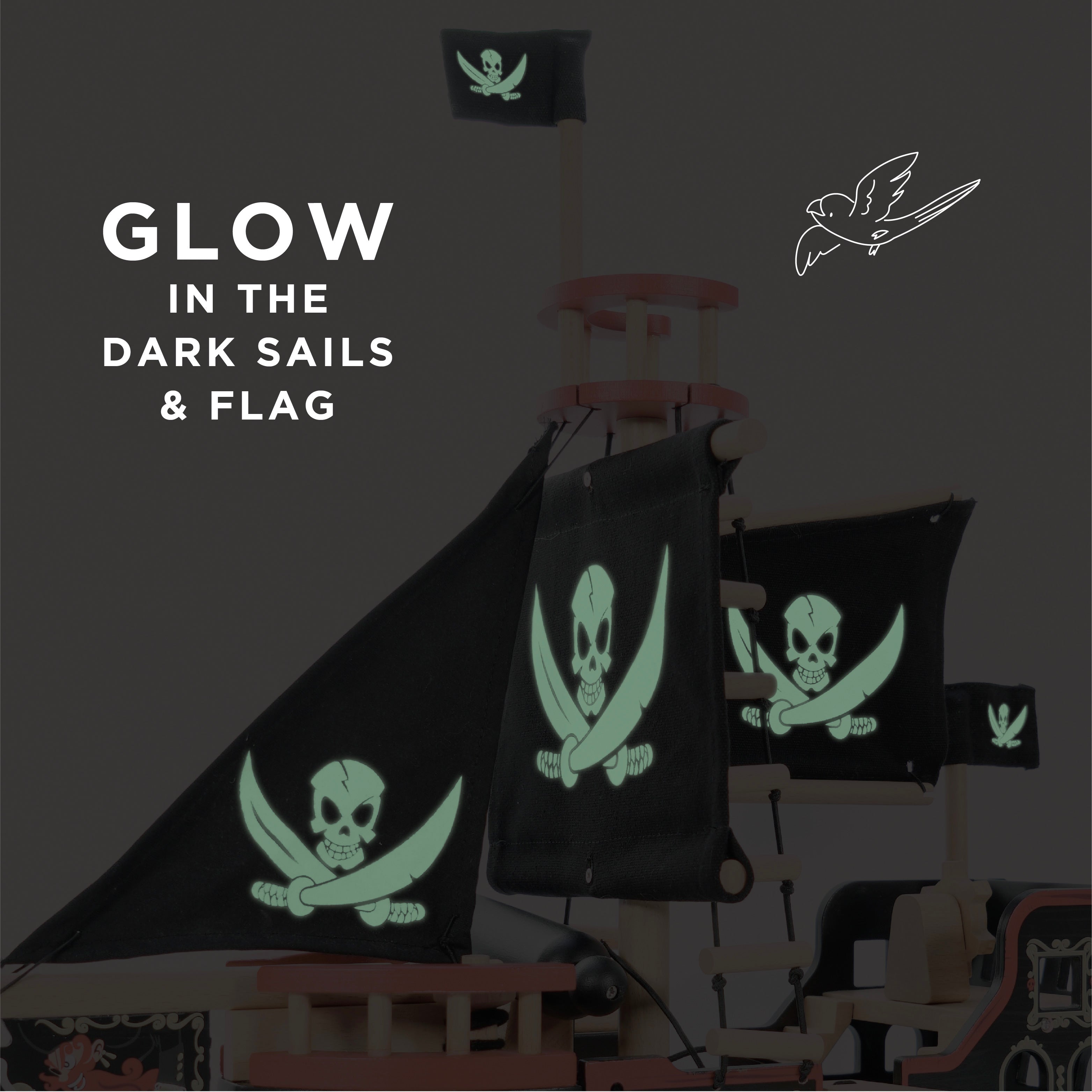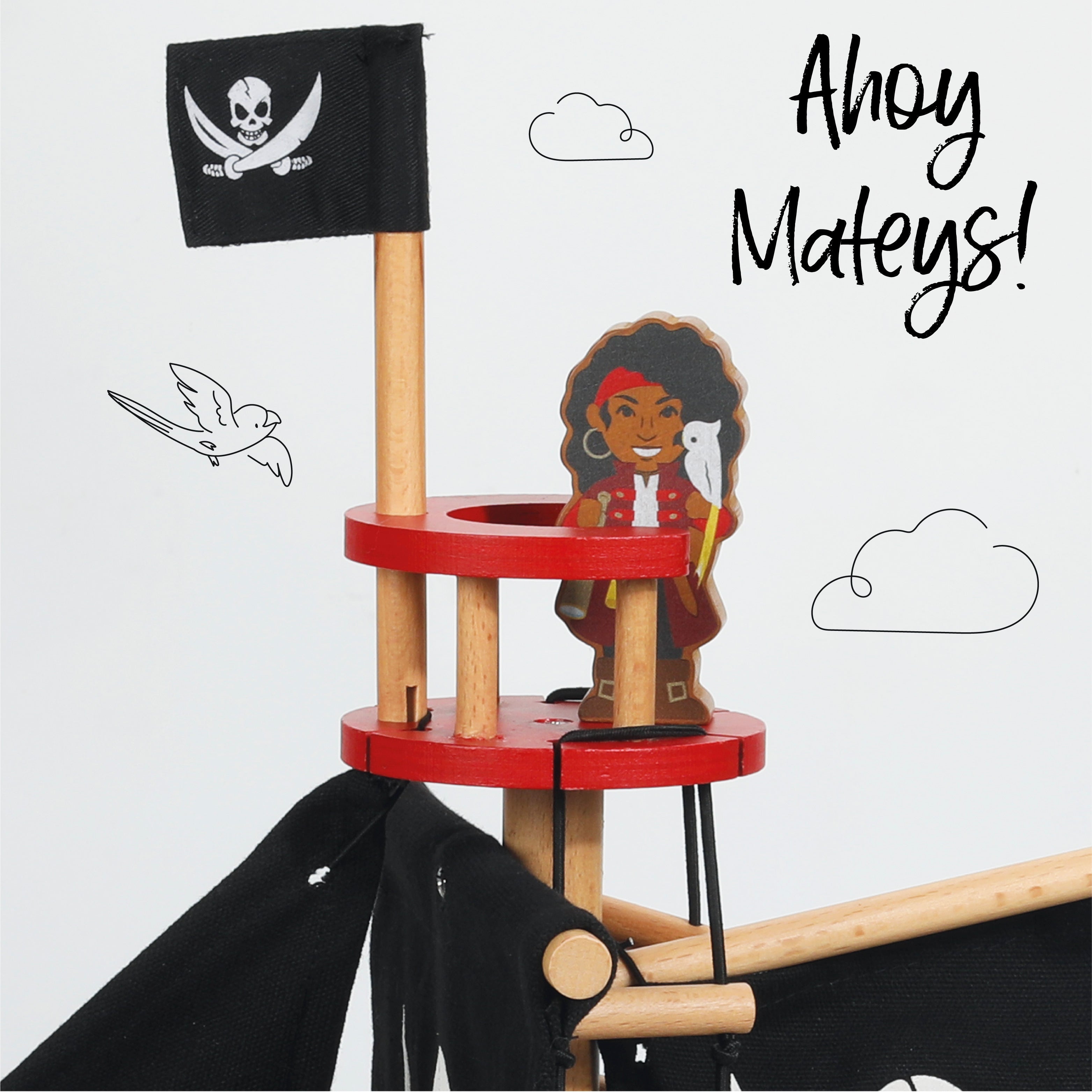 All aboard this classic, award winning wooden toy boat. Painted in striking black, with billowing fabric sails and adorned with a traditional skull and crossed swords motif for an authentic look and feel.