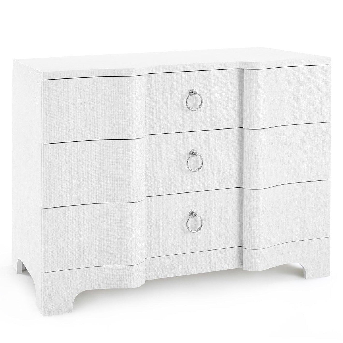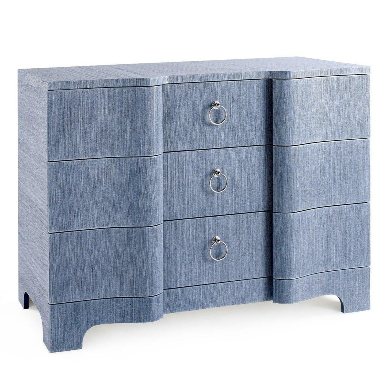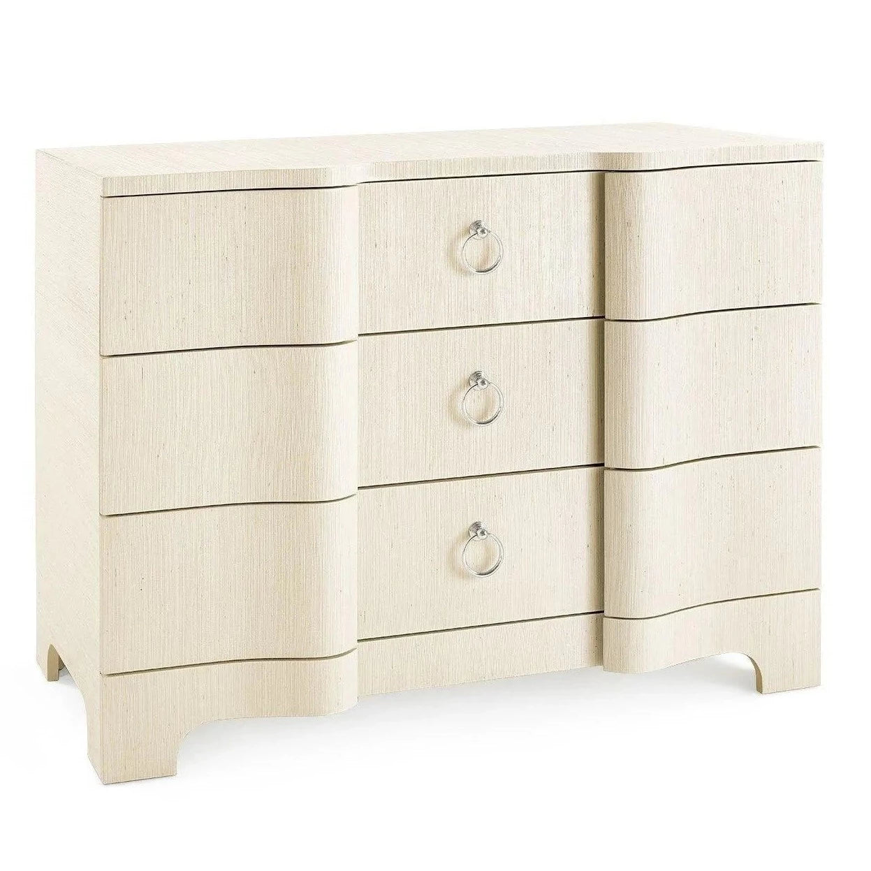 The Bardot Collection is a curvy, deco-inspired design that appeals to those who want polished, decorated rooms. The romantic, serpentine front profile is finished with lacquered grasscloth that resembles the look and texture of a painted strié finish.