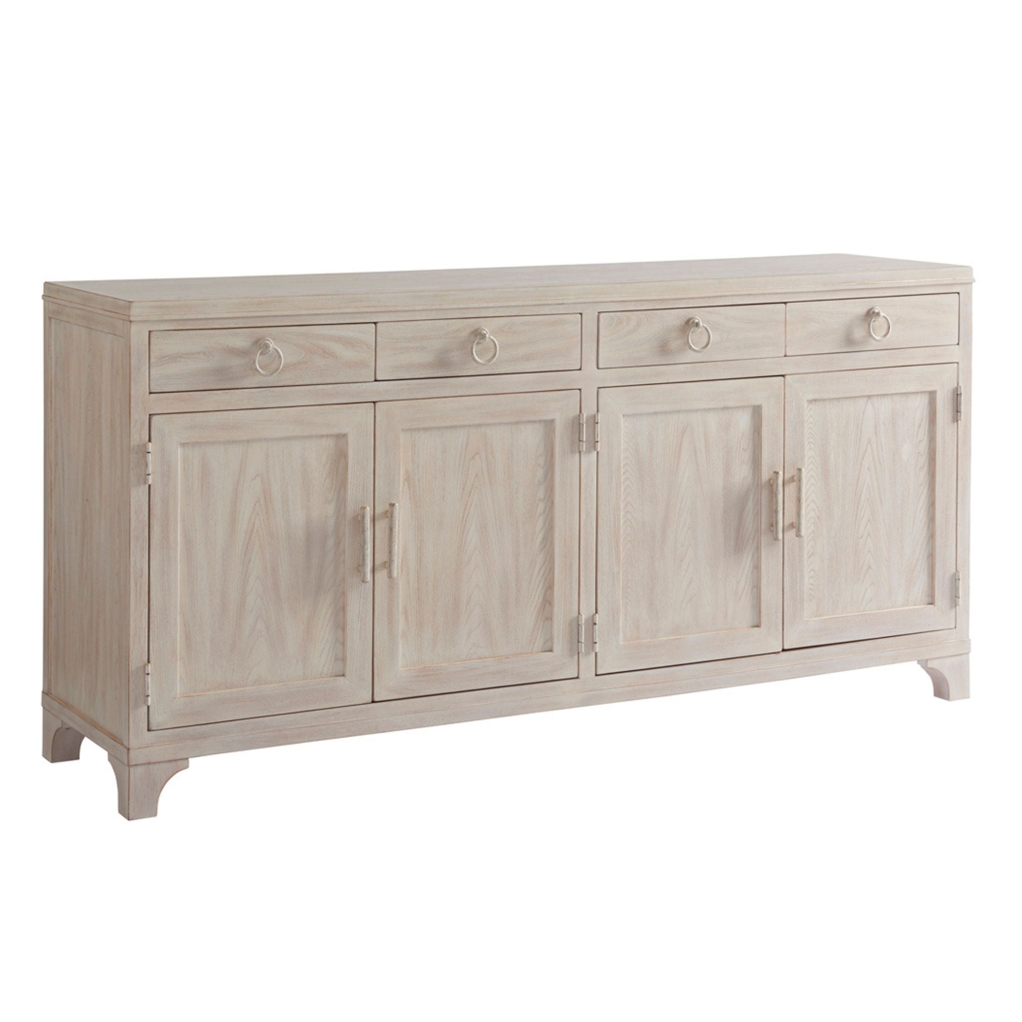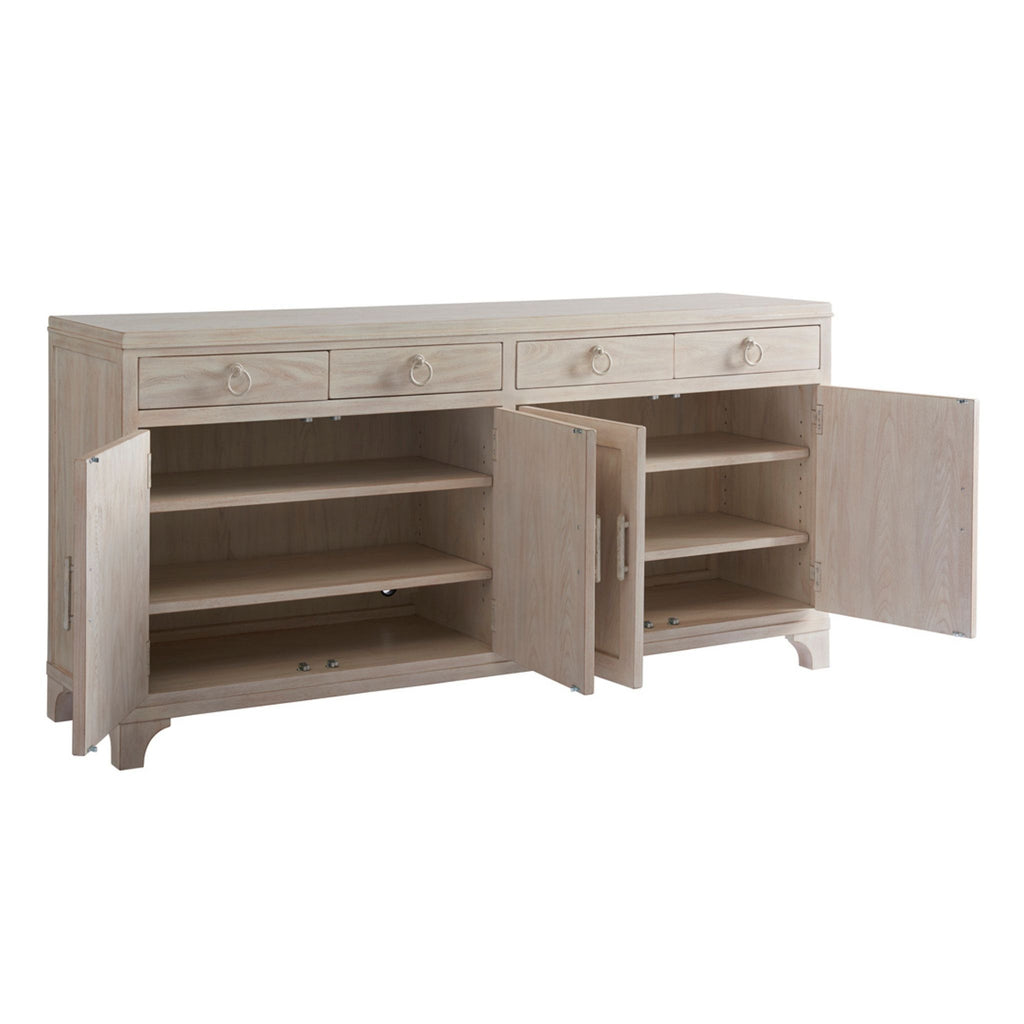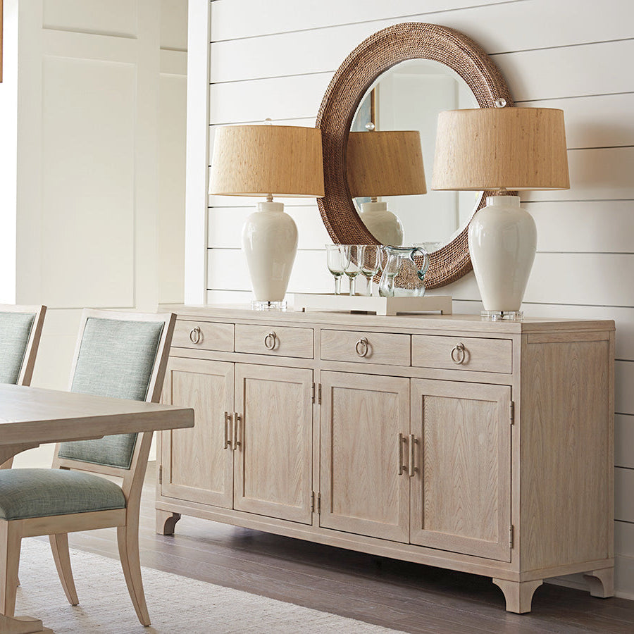 The Barclay Butera Newport Bayside Buffet offers a perfect blend of coastal elegance and functional storage. This spacious buffet features four full-extension self-closing drawers, felt-lined for delicate items, with one divided for silverware, plus two adjustable shelves behind each pair of doors. Finished in a crisp Sailcloth white with rubbed-through bronze patina hardware, it’s a timeless centerpiece ideal for dining rooms or entertaining spaces.