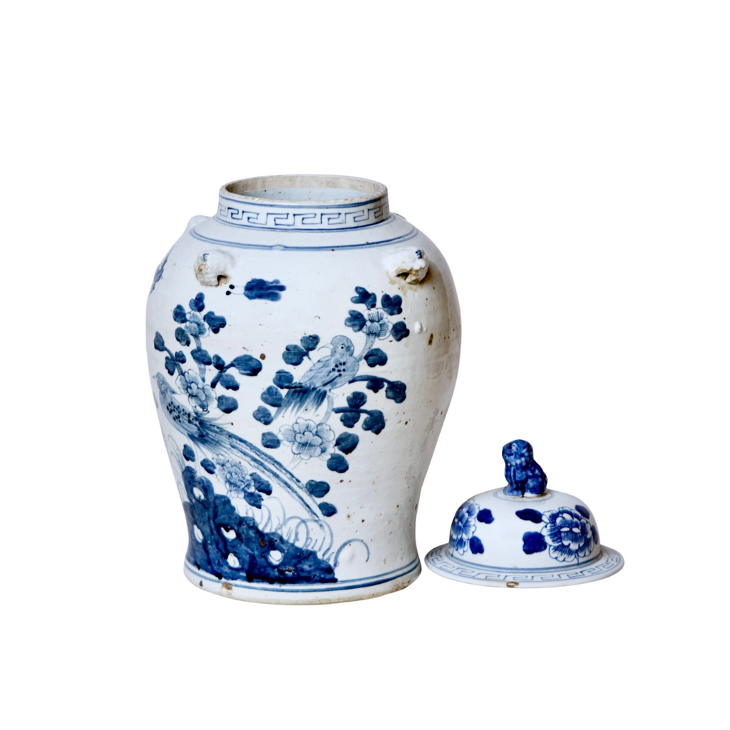 This blue and white porcelain vessel is a temple jar featuring a bird and floral motif. Remove the lid and add your favorite flowers. Shade and color variations are intrinsic to the beauty of handmade items and are not a product defect. Each product is unique, and the product photo shown represents one, but colors can vary.
