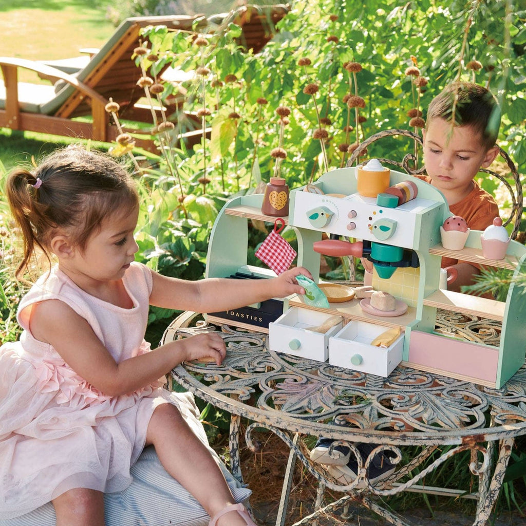 Encouraging language skills and manual dexterity, children can make a pretend Cappucino with various toppings, brew them a cup of tea, toast a panini, or serve their customers a variety of sandwiches and pastries.
