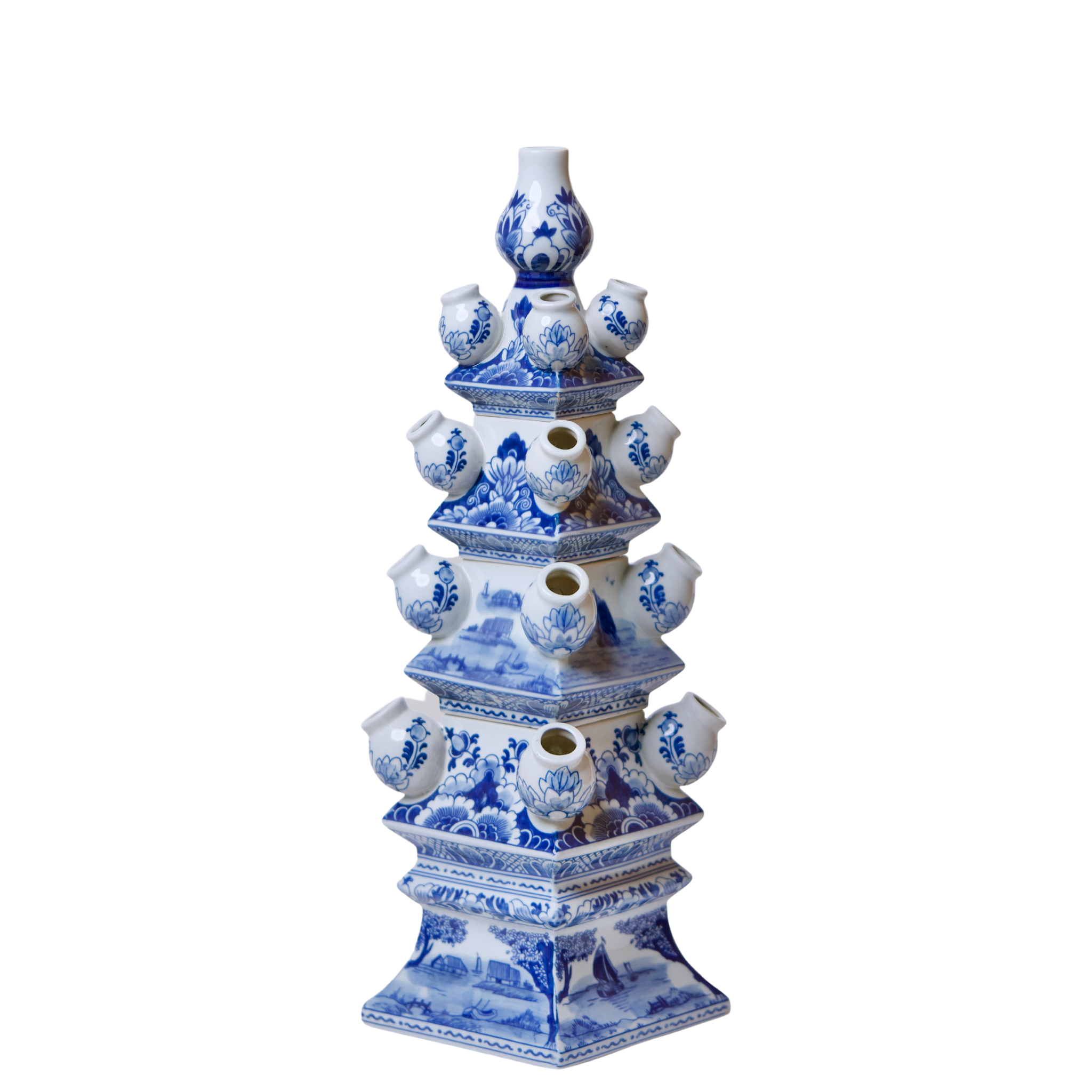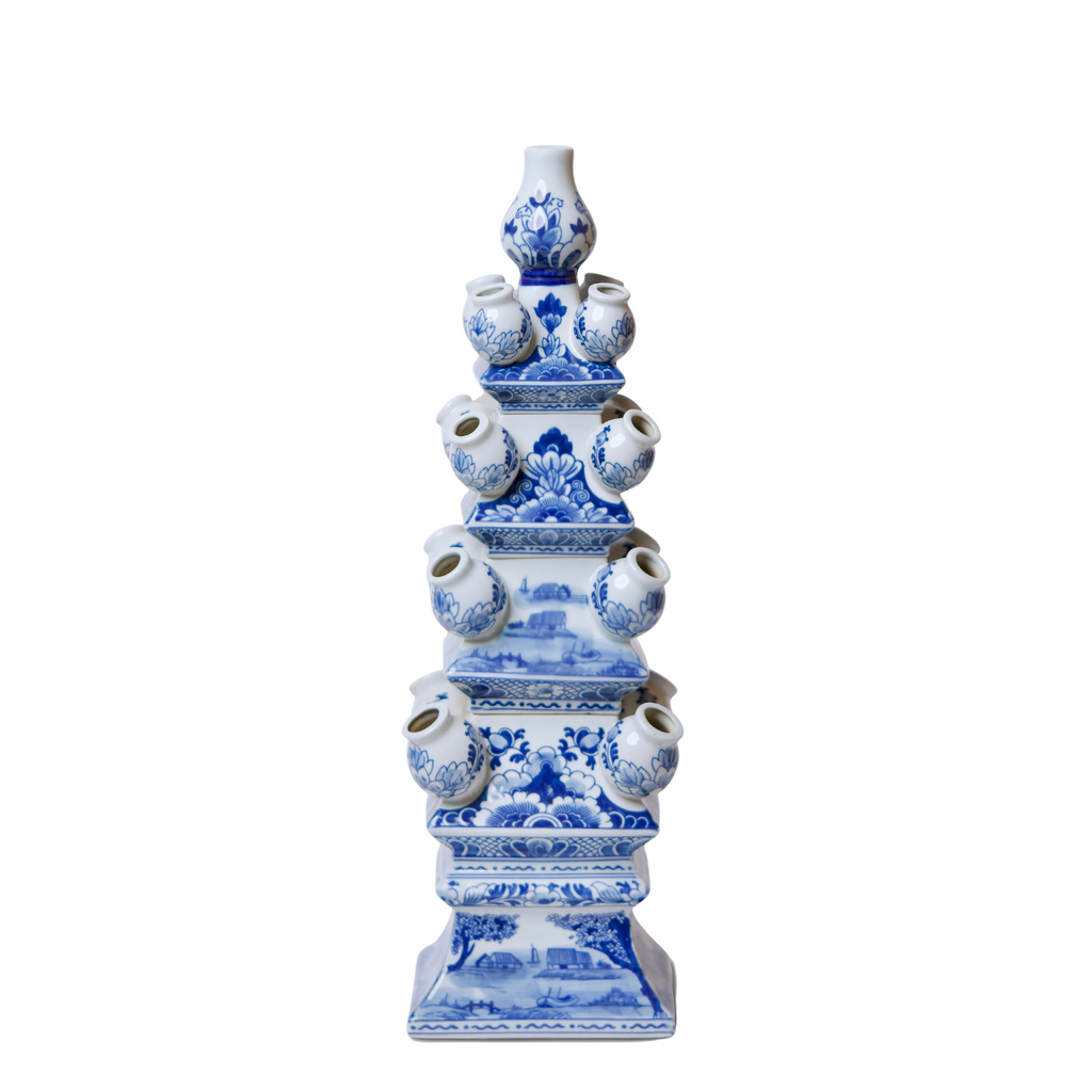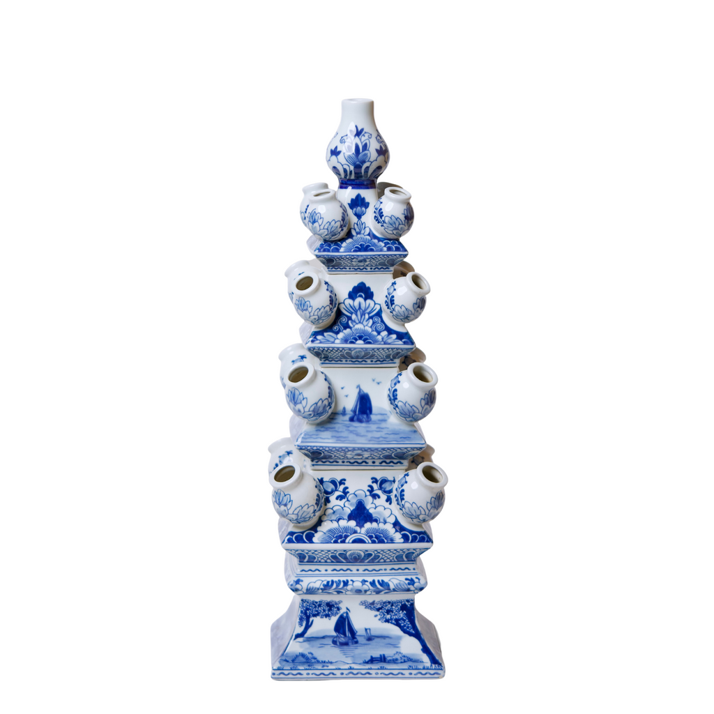This blue and white porcelain vessel is a multi-part tulipiere vase. Click images for greater detail.