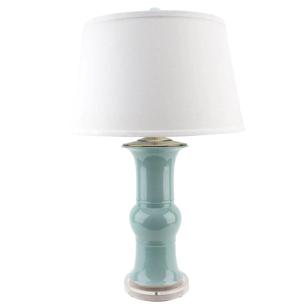 This lovely porcelain lamp features a blue celadon finish. The lamp features an acrylic base and comes with the lampshade as shown.