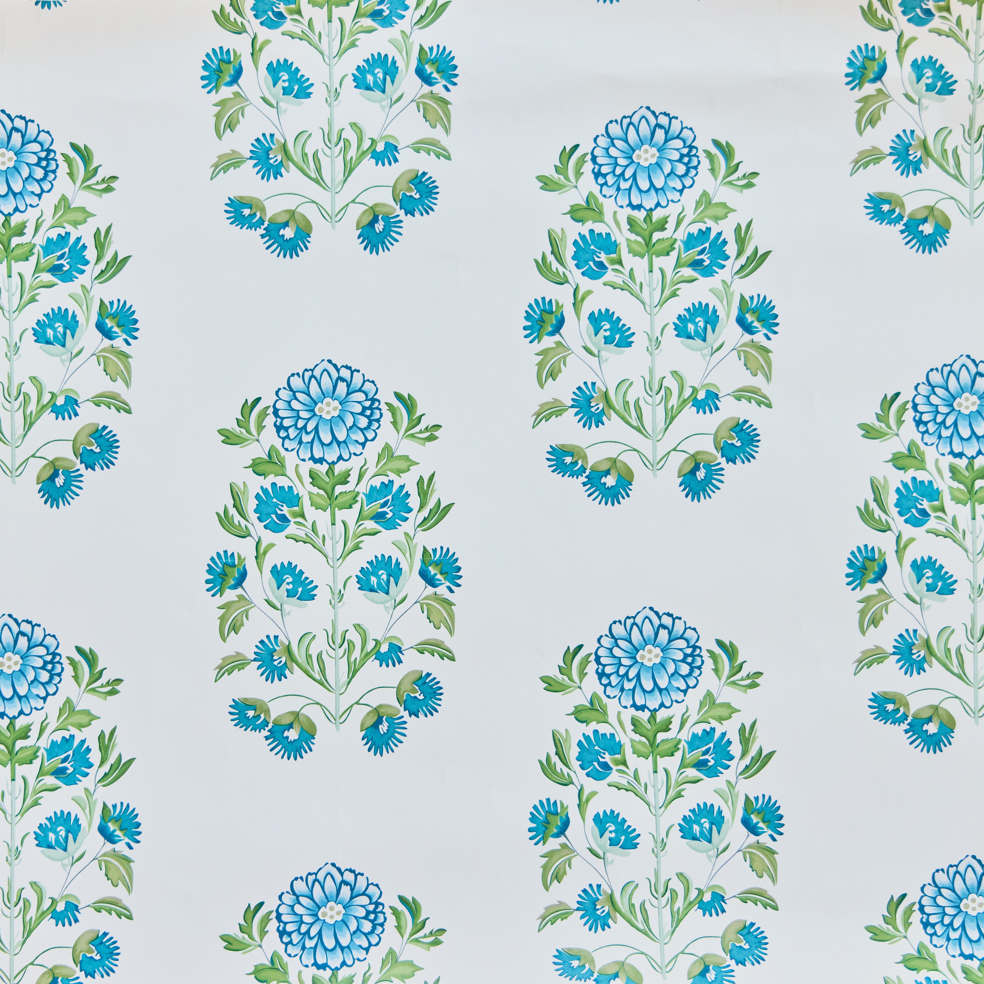 Inspired by classic block prints, this stylized floral design repeats with structure and charm. Its vibrant blue blooms and leafy green tendrils provide a tailored yet organic touch, making it a statement backdrop for elegant entryways or sitting rooms.