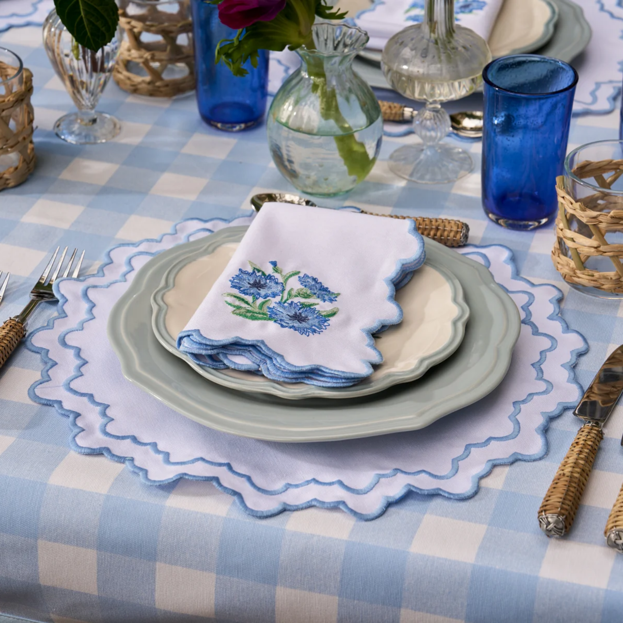Blue Lotus Flower Embroidered Placemat & Napkin Set