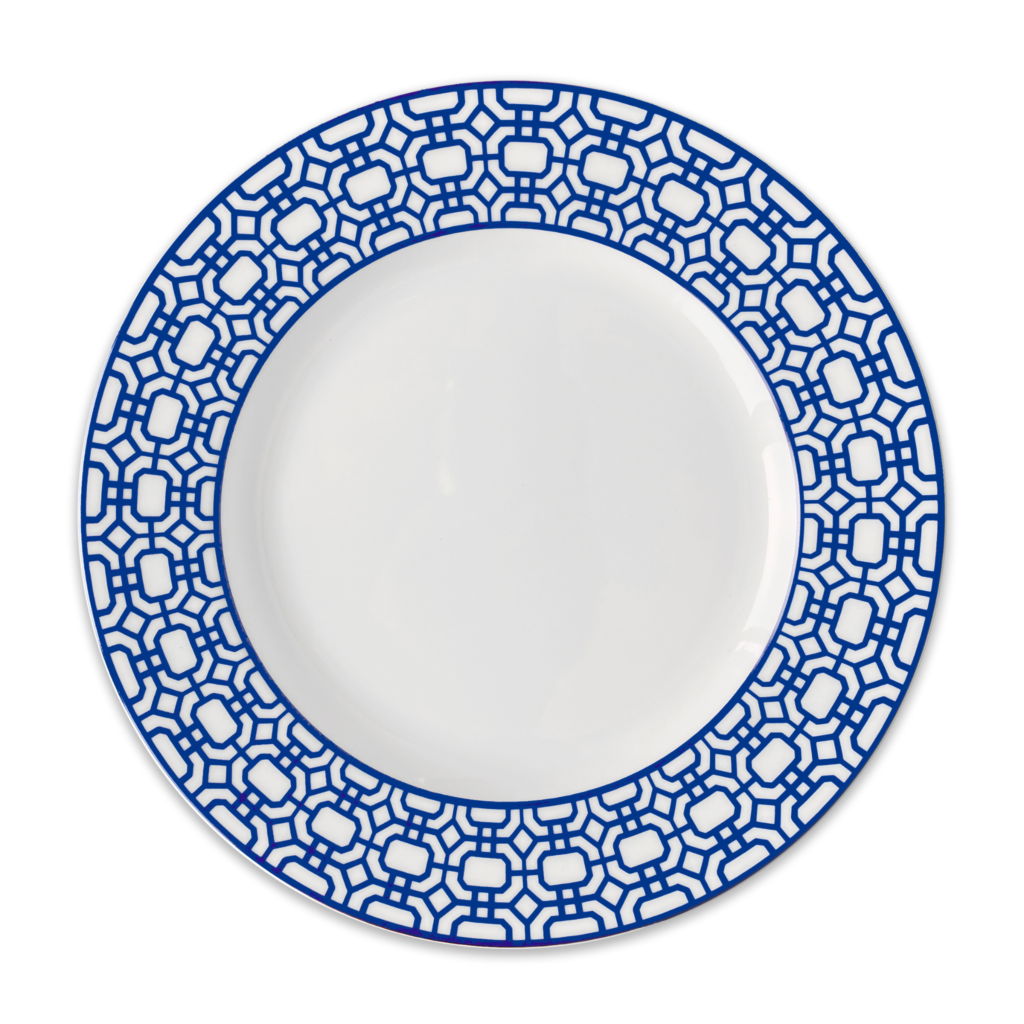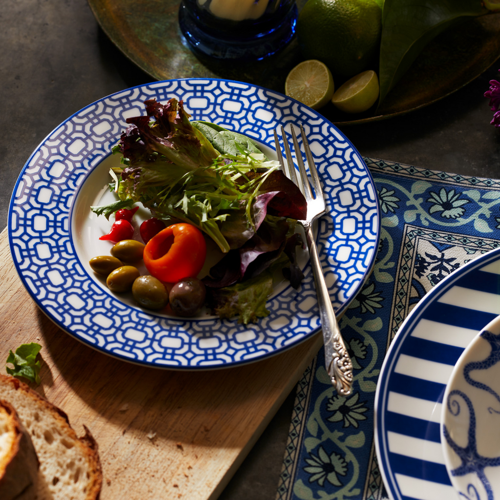 Newport Garden Gate features an interlocking lattice pattern in saturated color on creamy white premium porcelain, layering effortlessly to add a clean, contemporary note to any setting. Designed to be mixed with Newport Stripe, this pattern also plays well with both botanical and coastal collections.