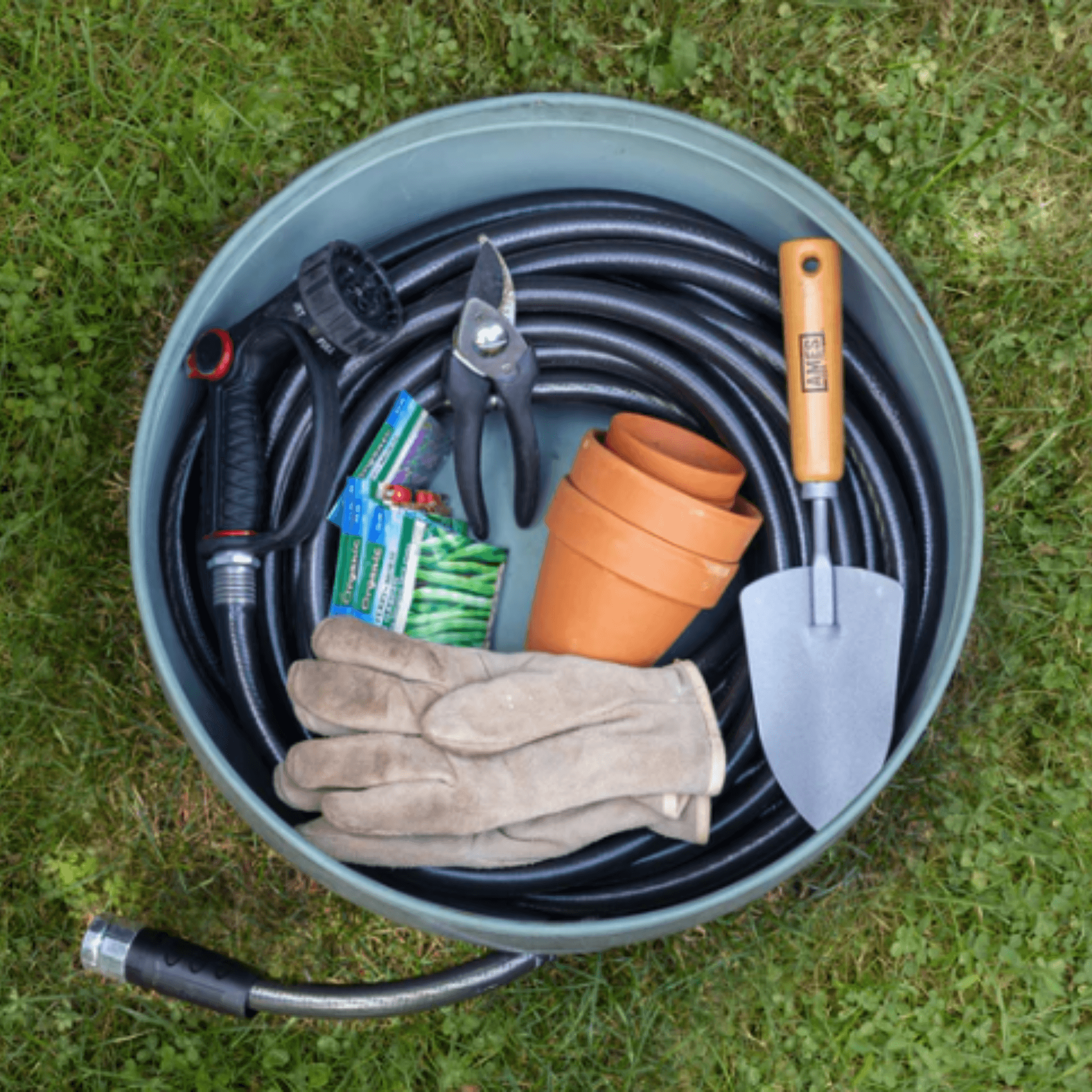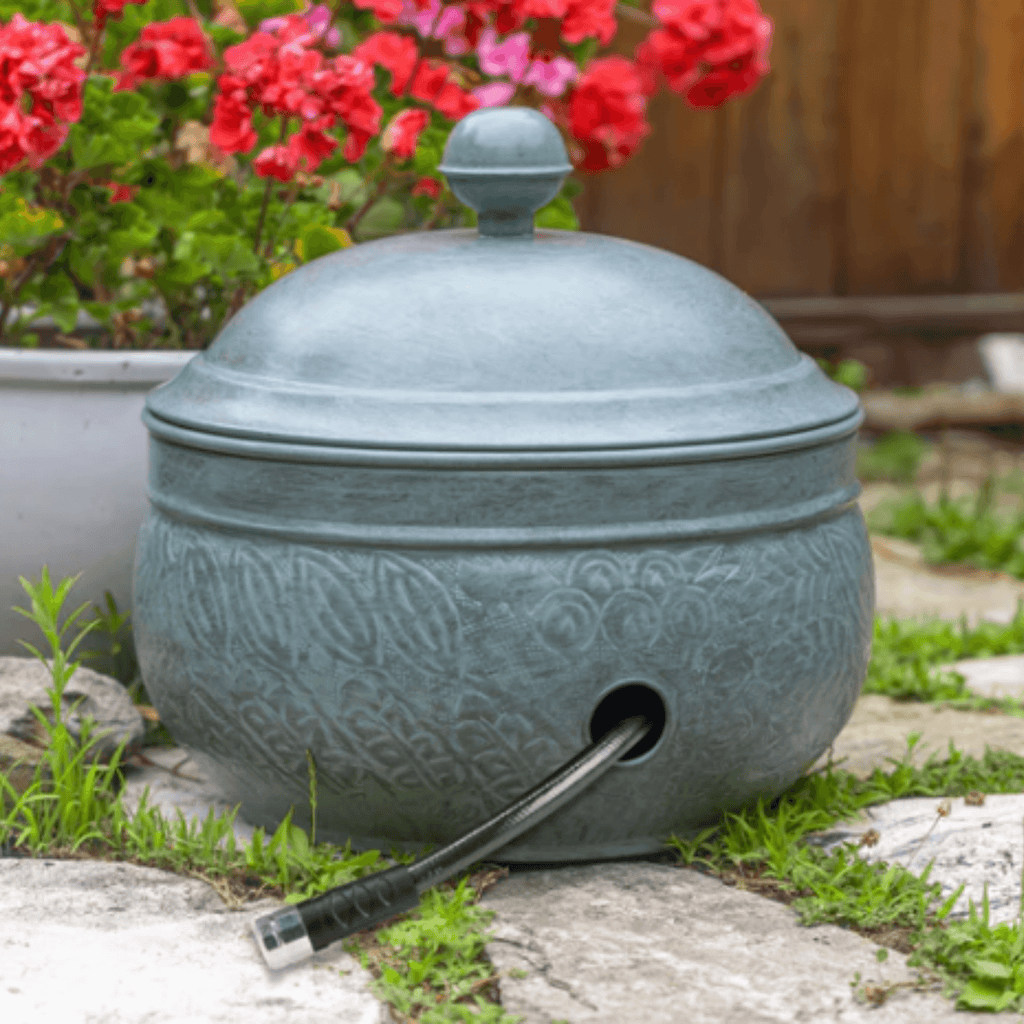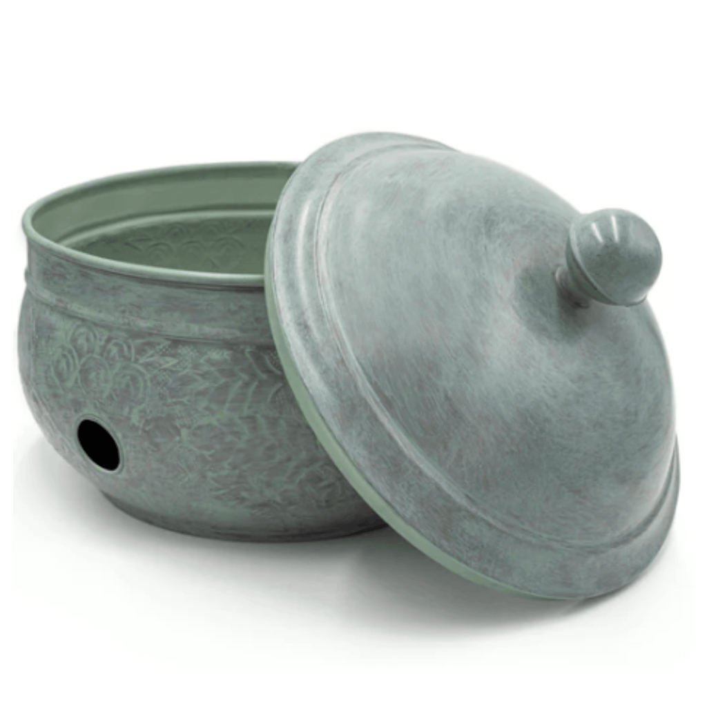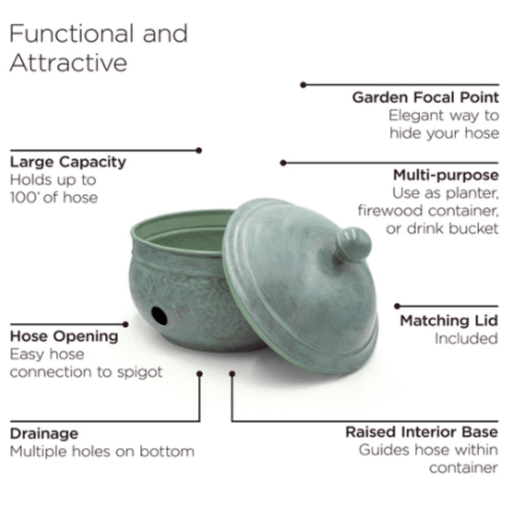 Posh, yet practical, this attractive hose pot and lid will enrich your yard and garden with its style and charm. A handsome hiding spot for up to 100 feet of unruly garden hose, each pot and lid is handmade using Old World techniques with modern innovation to create an attractive and practical outdoor accent. A raised interior base helps guide the hose within the container, while multiple drainage holes eliminate excess water. An ample 2" side hole allows the hose to be easily connected to an outdoor faucet. This versatile container can also be used as graceful planter, firewood container, or impressive drink bucket sure to strike up conversation. Dimensions: 17.5"L x 17.5"W x 17"H. Easy to Move – made from high quality steel, this hose pot is light enough to easily move around your house. Click images for greater detail.