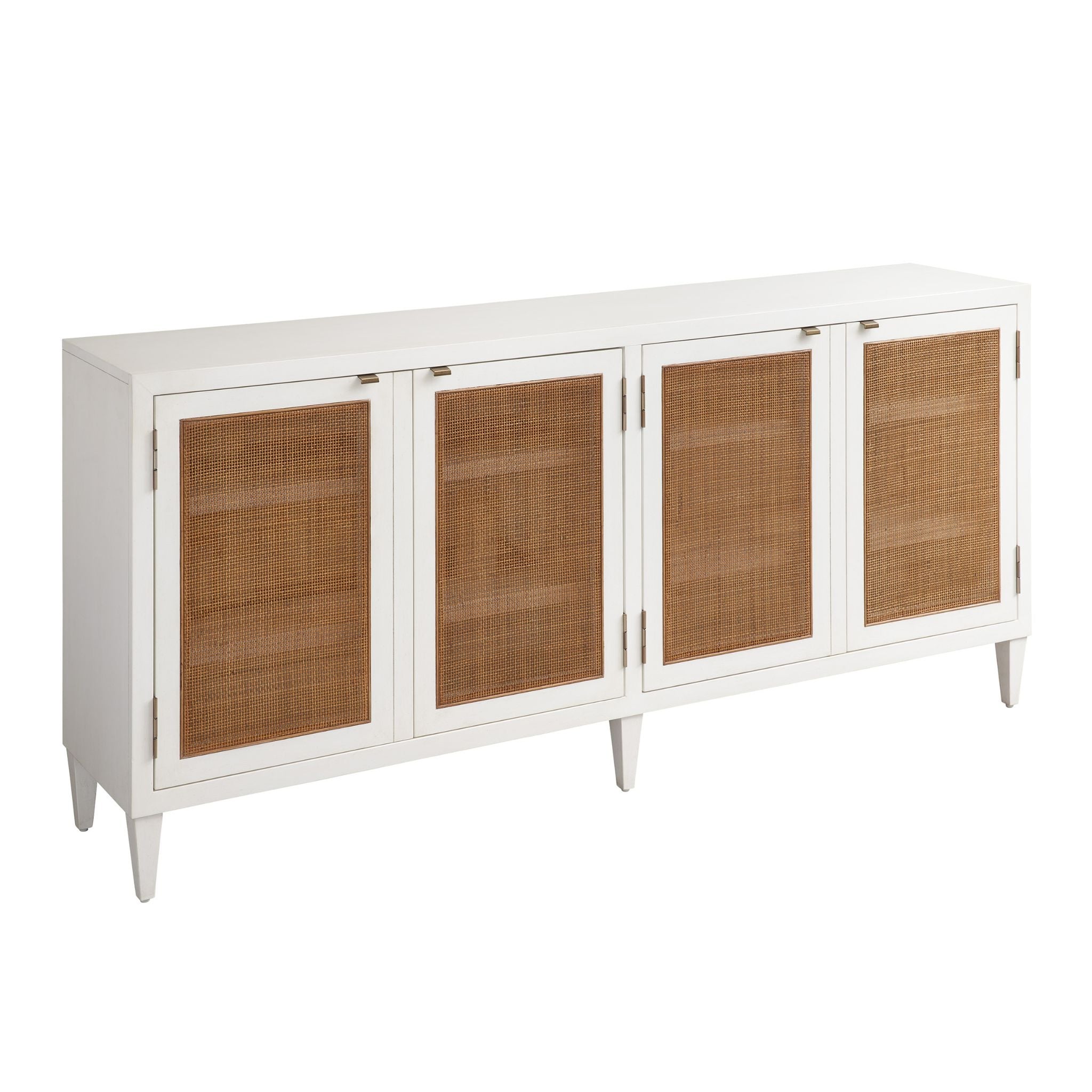 - Includes 4 doors with woven cane panels, 4 adjustable shelves and grommets for cord management.