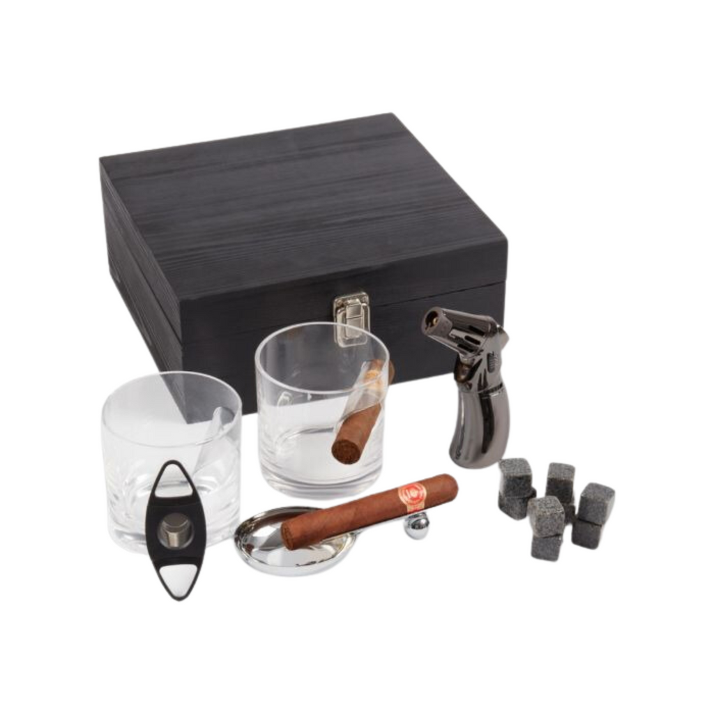 This carefully curated collection combines elegance, relaxation, and indulgence, including everything you need to savor your favorite whiskey in style, along with a touch of sophistication. The centerpiece of this set is 2 premium crystal whiskey glasses that are designed to enhance your tasting experience. The set comes with whiskey stones, a cigar torch, a precision cigar cutter, and a sleek stainless steel ashtray, for those moments when you want to pair your whiskey with a fine smoke .