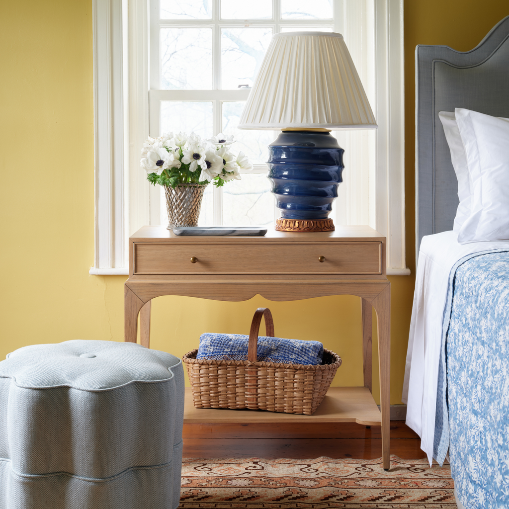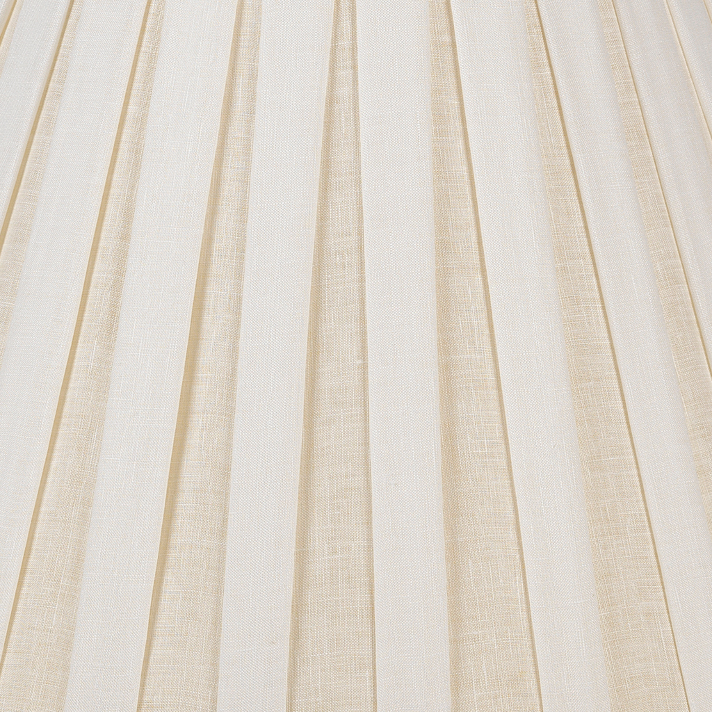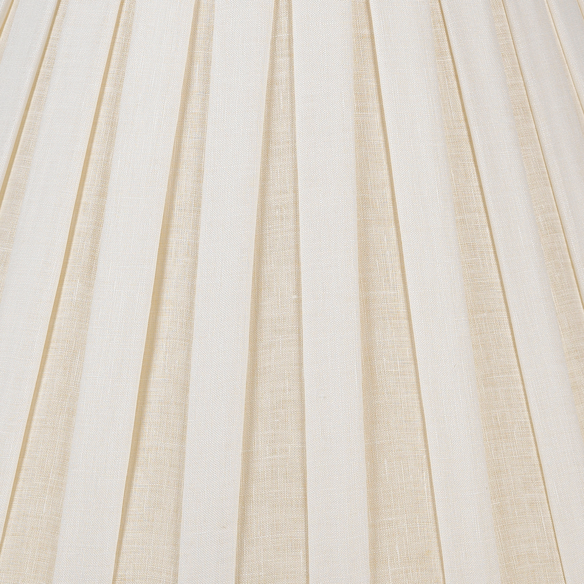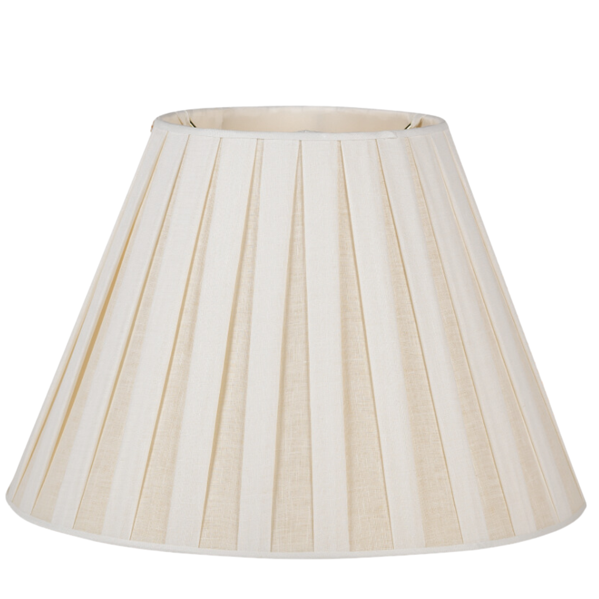 An off-white linen box pleat shade with interlining and self-trim at the top and bottom. It’s a classic style that adds understated texture and a charming glow when lit - warming any alcove it sits in. Scaled to work on nearly all of the Bunny Williams Home table lamps.