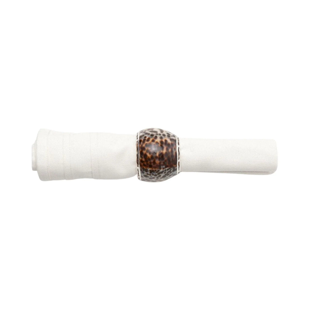 Wide tiger cowrie shell napkin ring with silver details. Natural variation is to be expected.