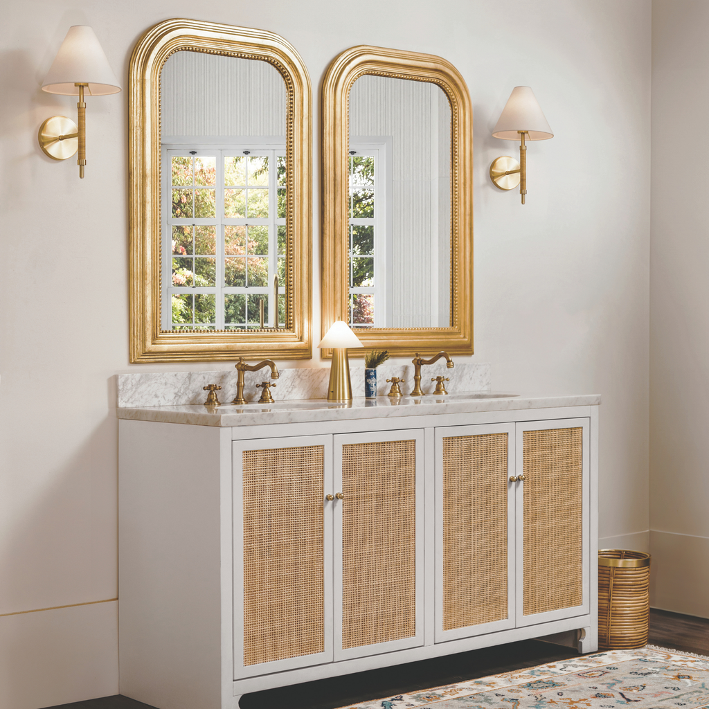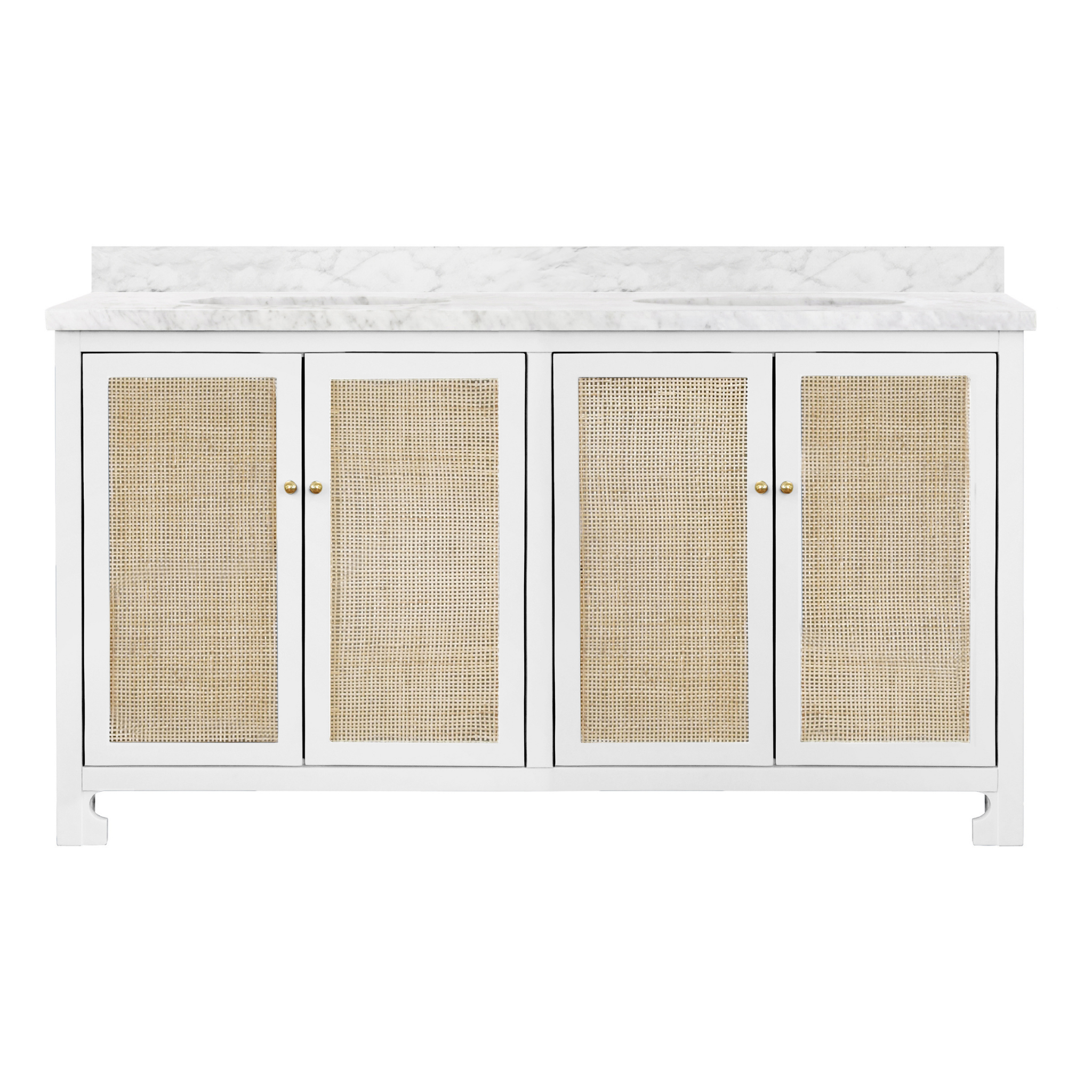 Bath vanity in matte white lacquer with cane front doors, white and grey marble top, double porcelain sinks, and polished brass knobs, 60" wide.