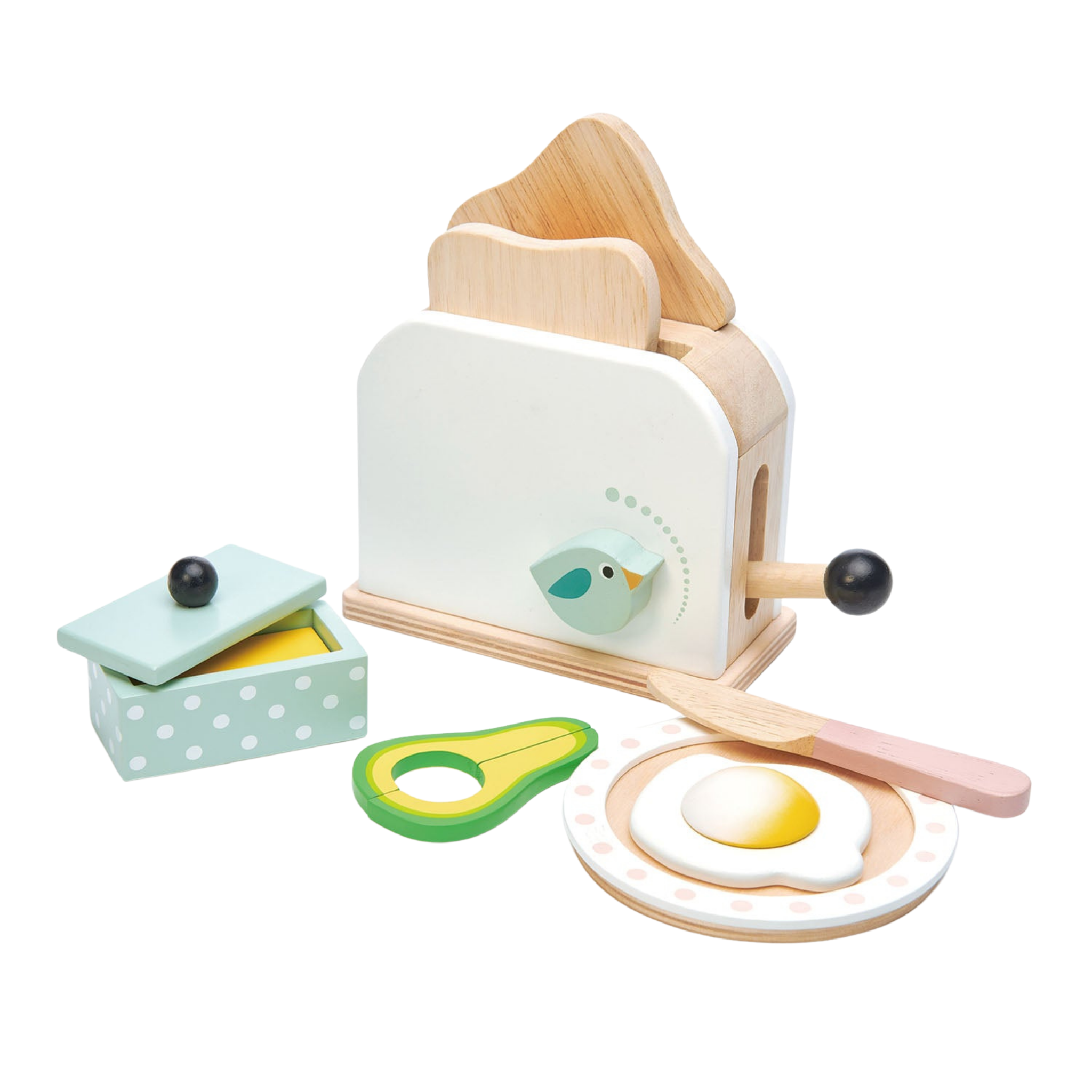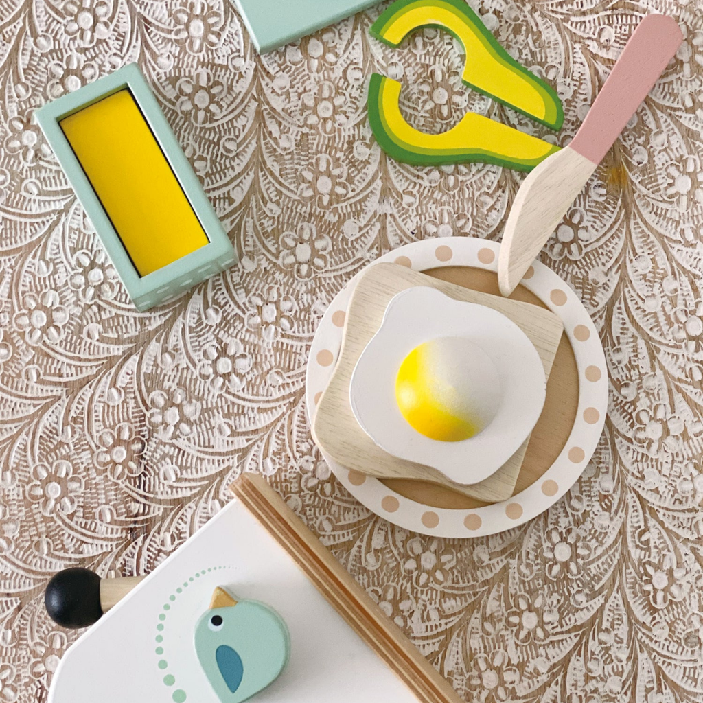 Toast your 2 slices of bread, turn the birdie dial to hot, pop them up when they are ready, butter the toast with the wooden knife, and top with a poached egg and 2 slices of avocado.