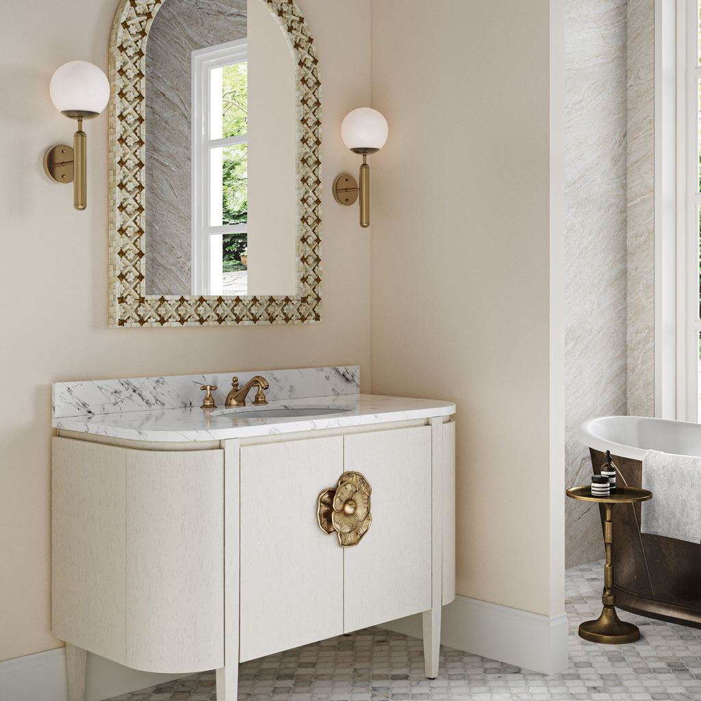 The Briallen 48" White Vanity with Undermount Sink brings an elegant and sophisticated vibe to a designer bathroom or powder room. This new freestanding vanity, inspired by our longtime best-selling cabinet, is made of white oak solids and veneers, with a white Carrara marble top and backsplash, and our signature cast brass door pull. The pre-installed oval porcelain sink is by TOTO.