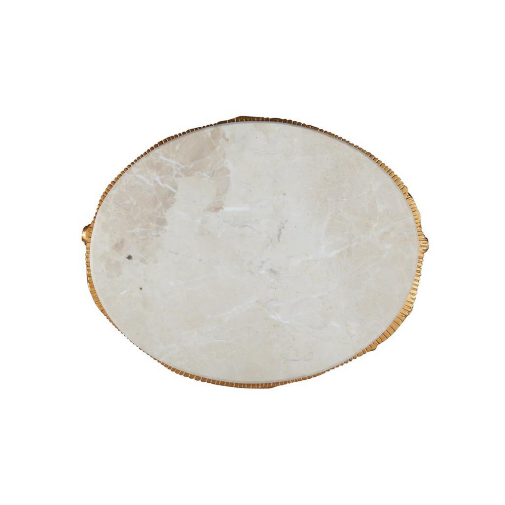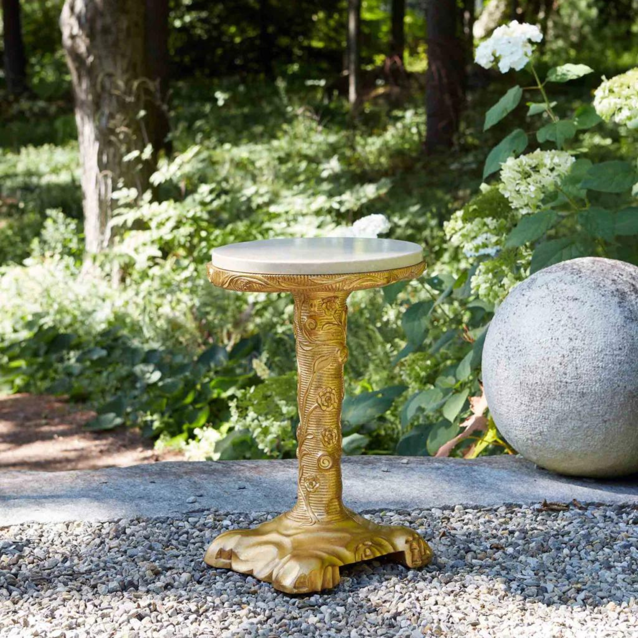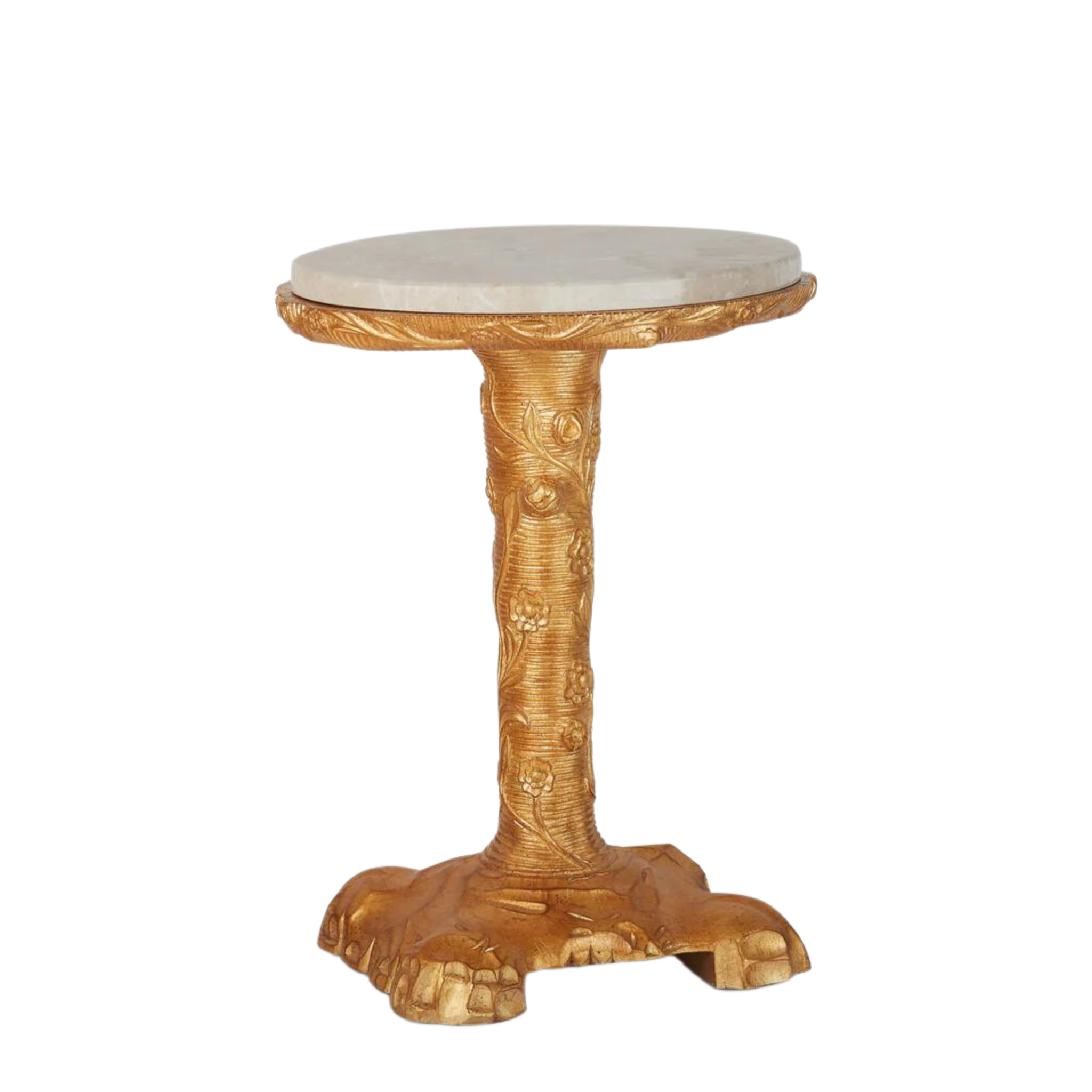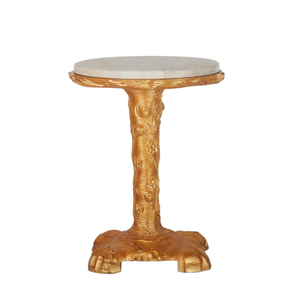 This magical little table is inspired by the 18th-century Rococo art movement and truly embodies the joyful decorative nature of the time. Stylized vines, twigs, and rock-like motifs gleam with a lustrous hand-gilded finish. The smooth marble top adds beautiful contrast. The perfect addition to a living room, it sits at the right height to hold a drink and only takes up the space it needs.