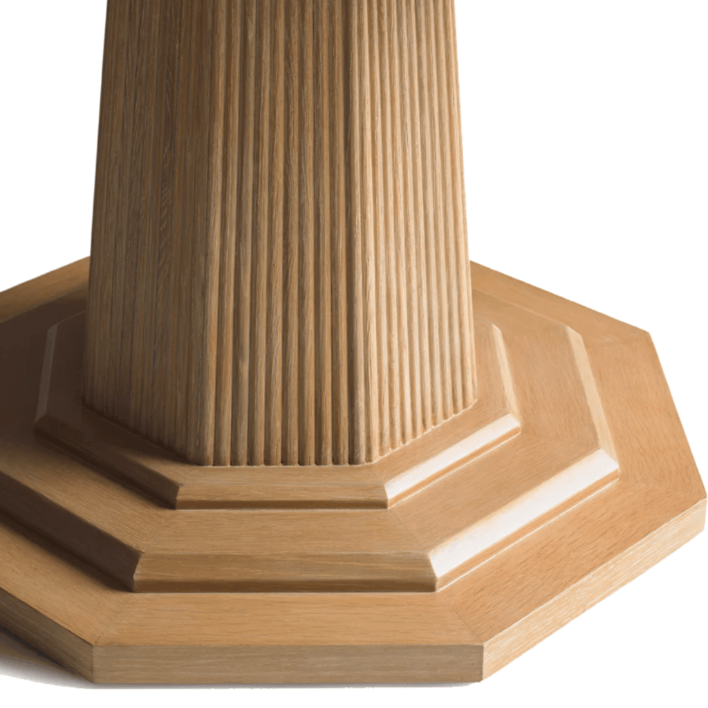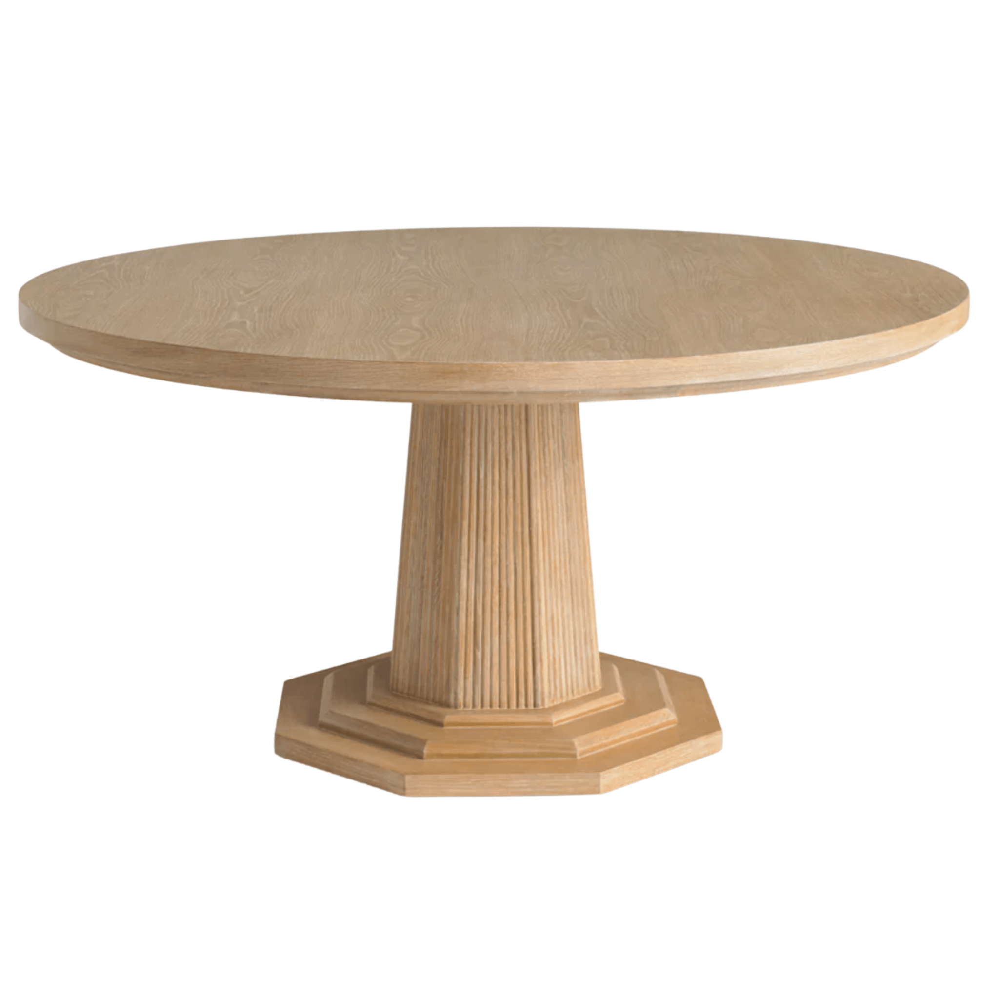 This large-scale 60” diameter dining table has a top and base finished in cerused oak. The pedestal base is reeded and octagonal in shape. This piece is made for people to live around - it anchors a room and will comfortably seat a houseful of visitors for Sunday lunch while adding a regal element to your room.