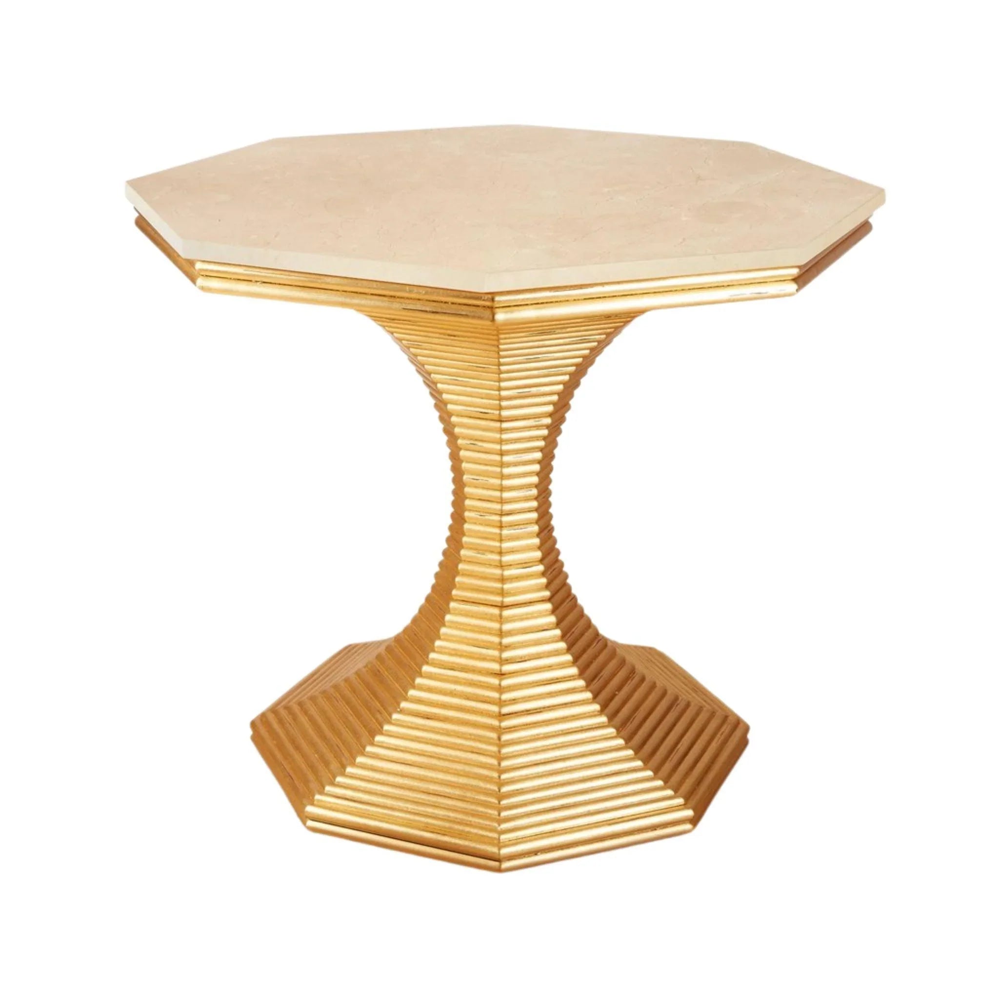 A best-seller that melts into countless styles - the cool marble round rests on an octagonal pedestal base of hand-applied reeded wood with shimmering antiqued gold or silver. Compact and sturdy, it makes a stylish staging area for an arrangement of books, photographs, or decorative objects. Or, do as Bunny would and try it as a bedside table.