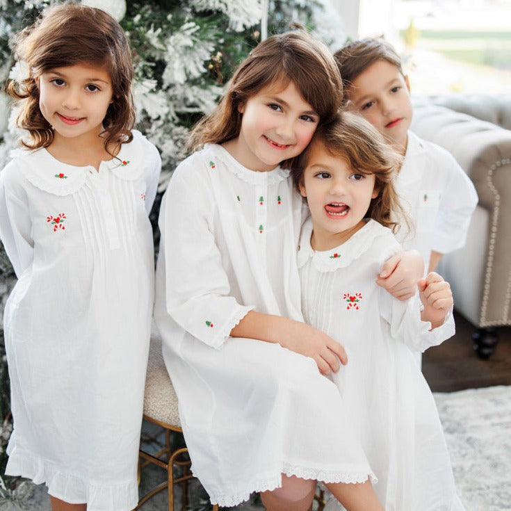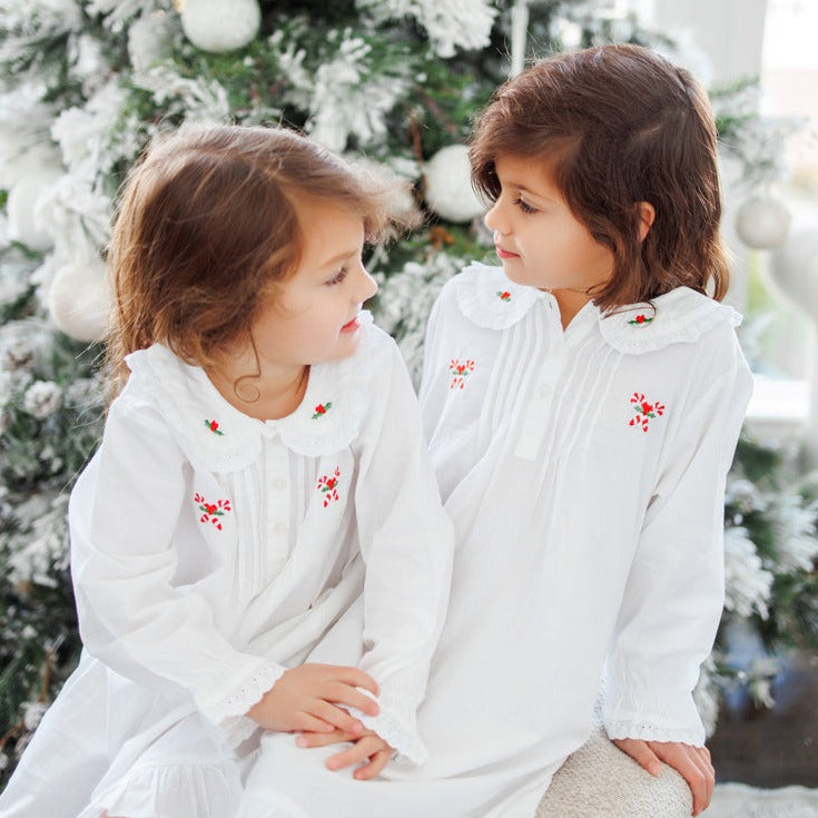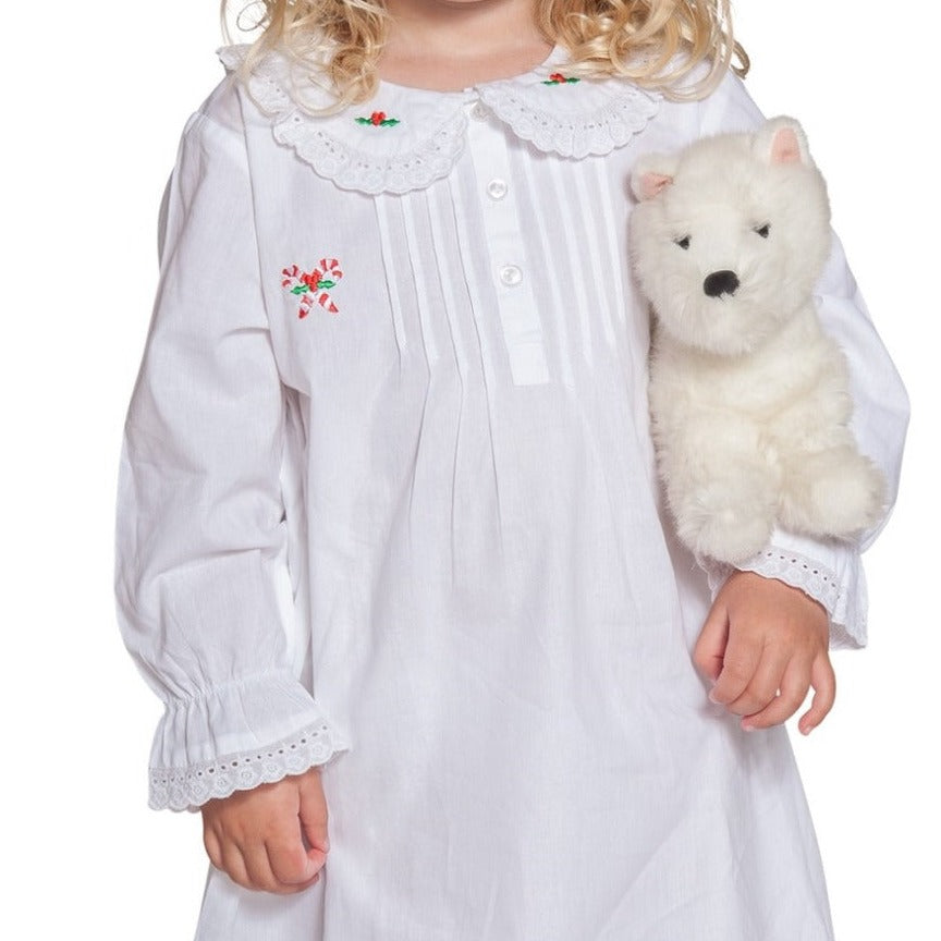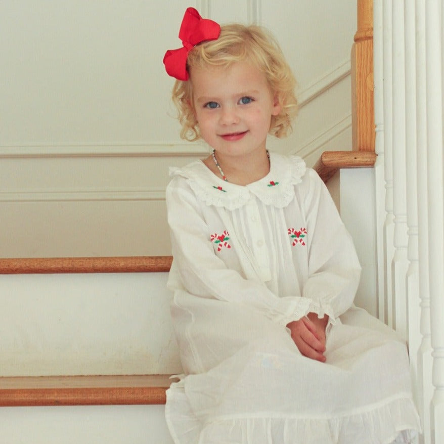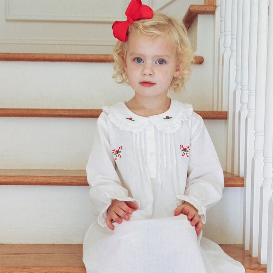 This darling little girl's white cotton Candy Cane dress is perfect for the holidays. Dress your little girl in this long sleeve embroidered Candy Cane & Holly dress with ruffle hem and your little one will be warm enough to play outside (with tights!) and in. This dress is perfect for a holiday dinner party or worn with little slippers by the fire at home. All our little girl's white cotton dresses are for play time, girl time, story time or twirl time!