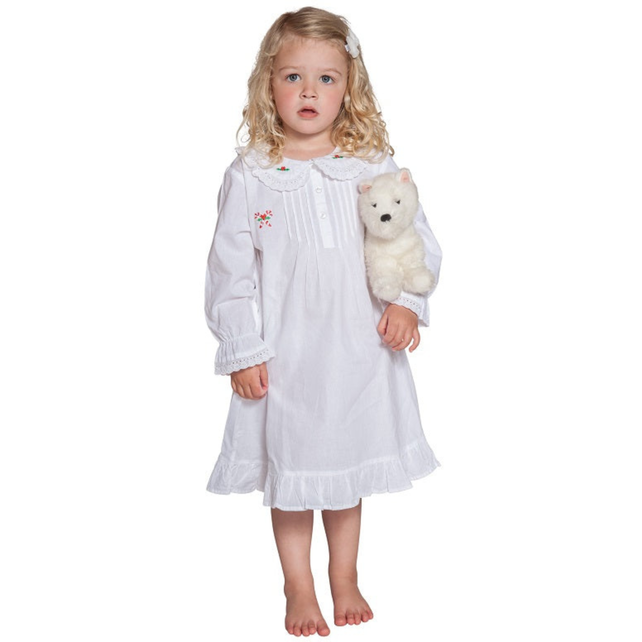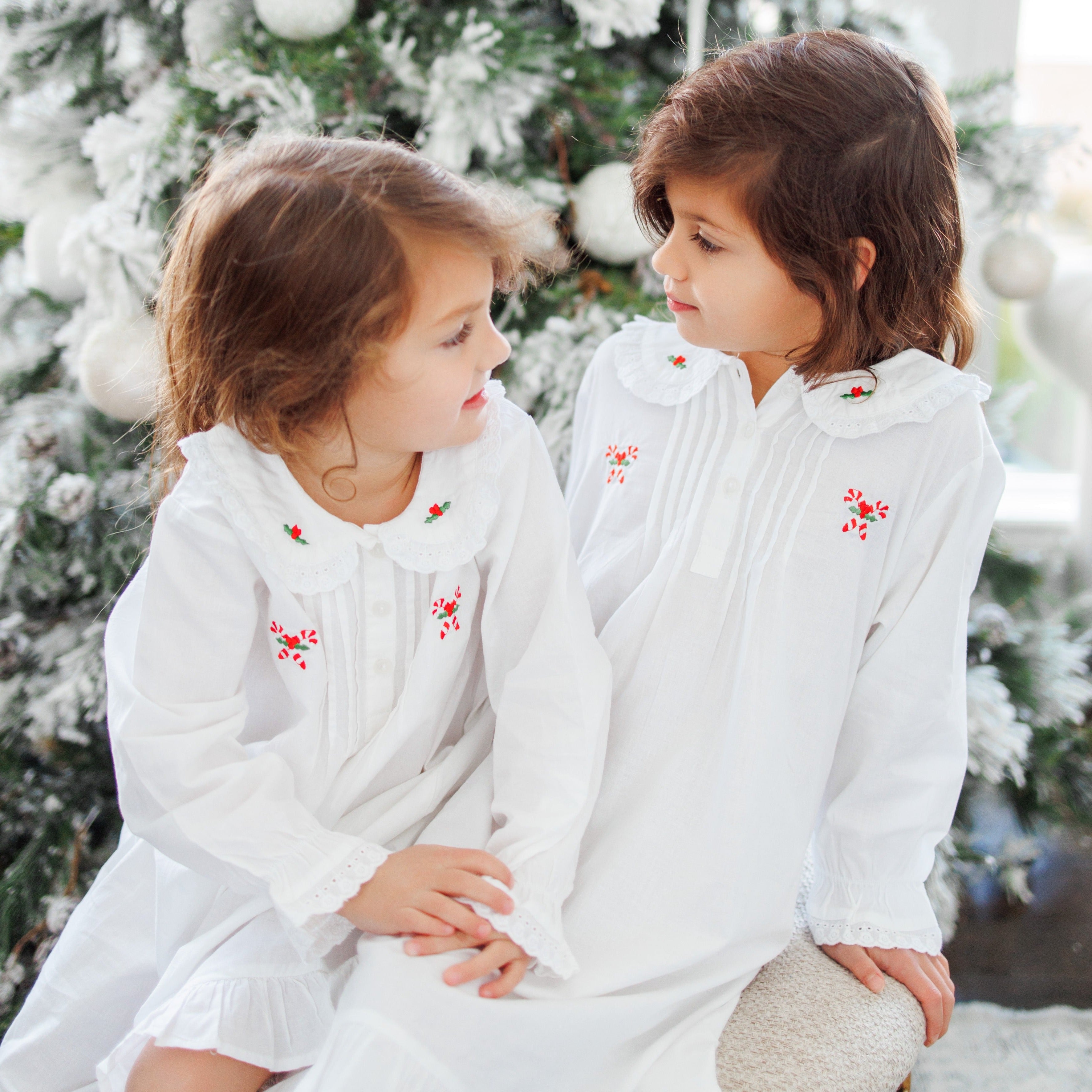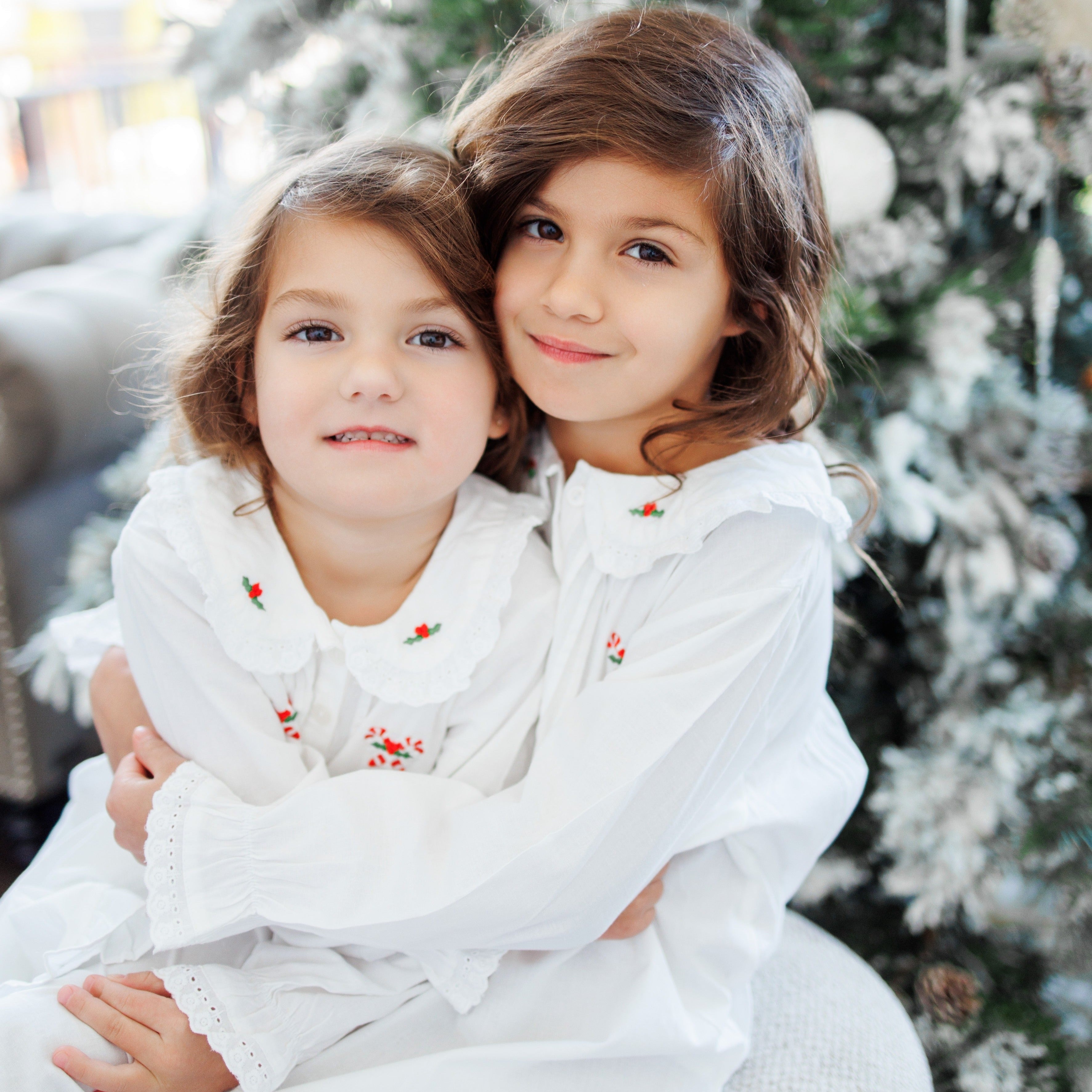 This darling little girl's white cotton Candy Cane dress is perfect for the holidays. Dress your little girl in this long sleeve embroidered Candy Cane & Holly dress with ruffle hem and your little one will be warm enough to play outside (with tights!) and in. This dress is perfect for a holiday dinner party or worn with little slippers by the fire at home. All our little girl's white cotton dresses are for play time, girl time, story time or twirl time!