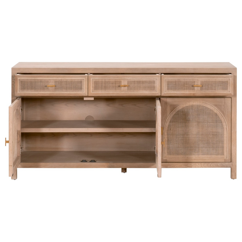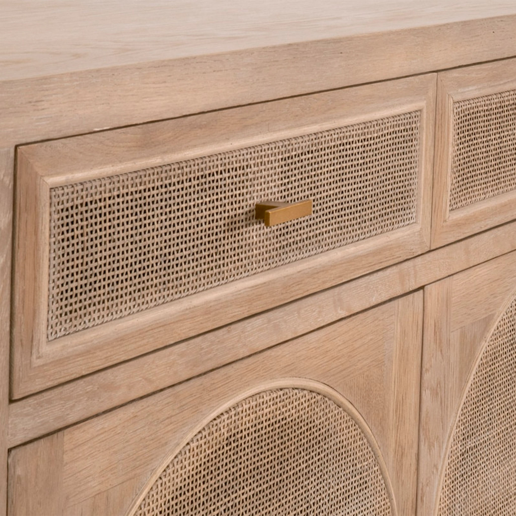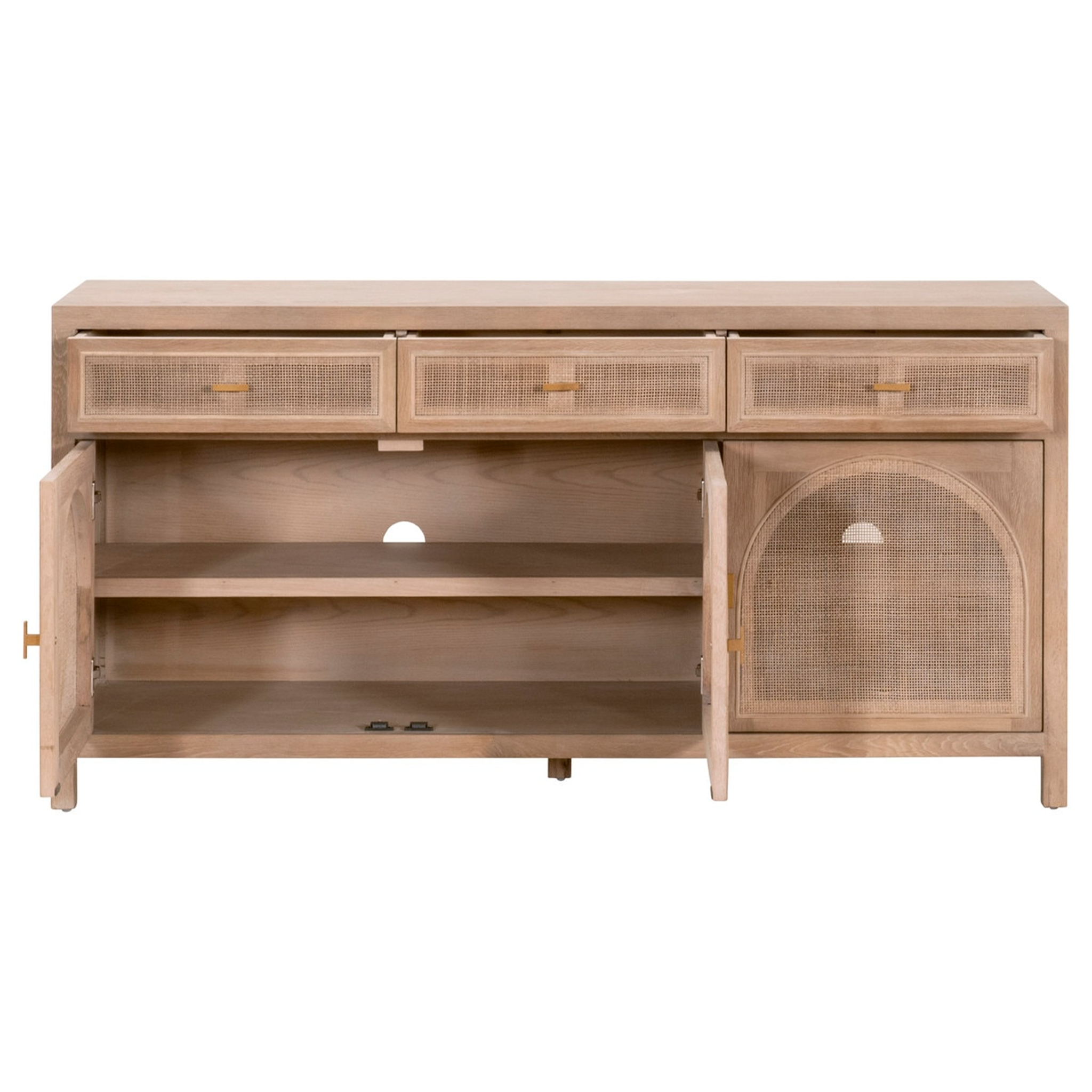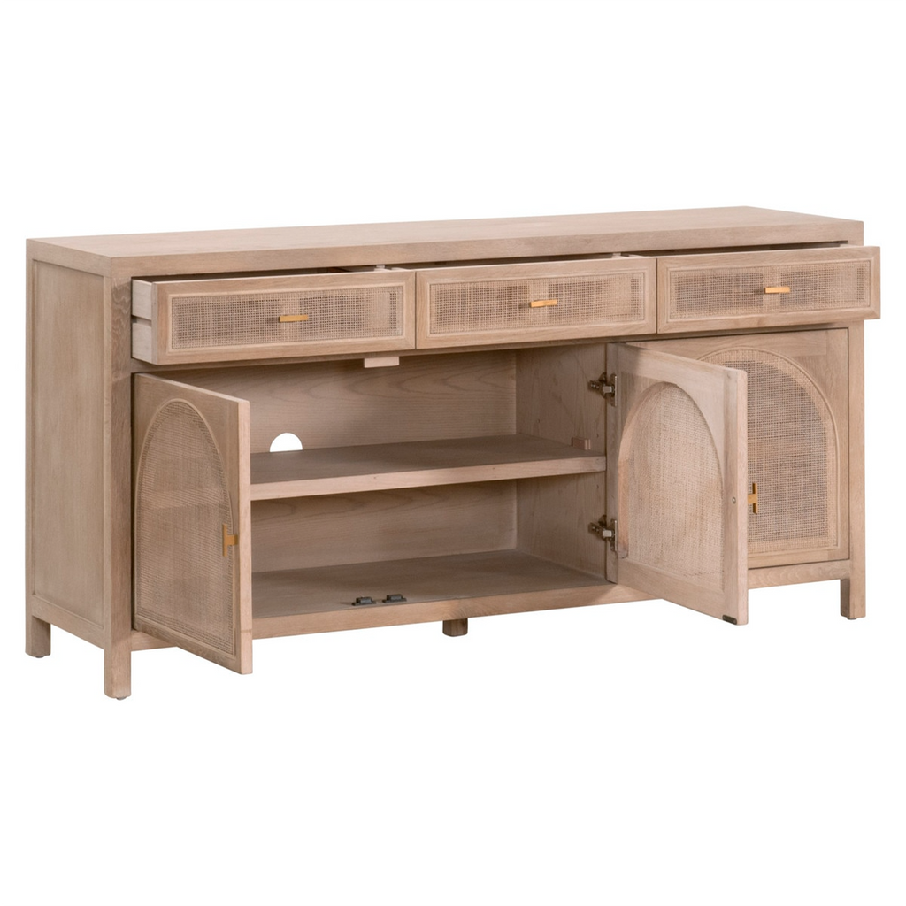 This bohemian-style Cane Media Sideboard exudes rustic charm. It features muted smoke gray tones and a natural appearance. Constructed with oak wood the cabinet doors and drawers have a beautiful front-facing cane inlay with wood border and brushed gold handles. Conveniently, the cabinet contains lots of storage space with its three storage drawers and large cabinet space with removable and adjustable shelves. It also contains dual cord management holes for media and electronic components.