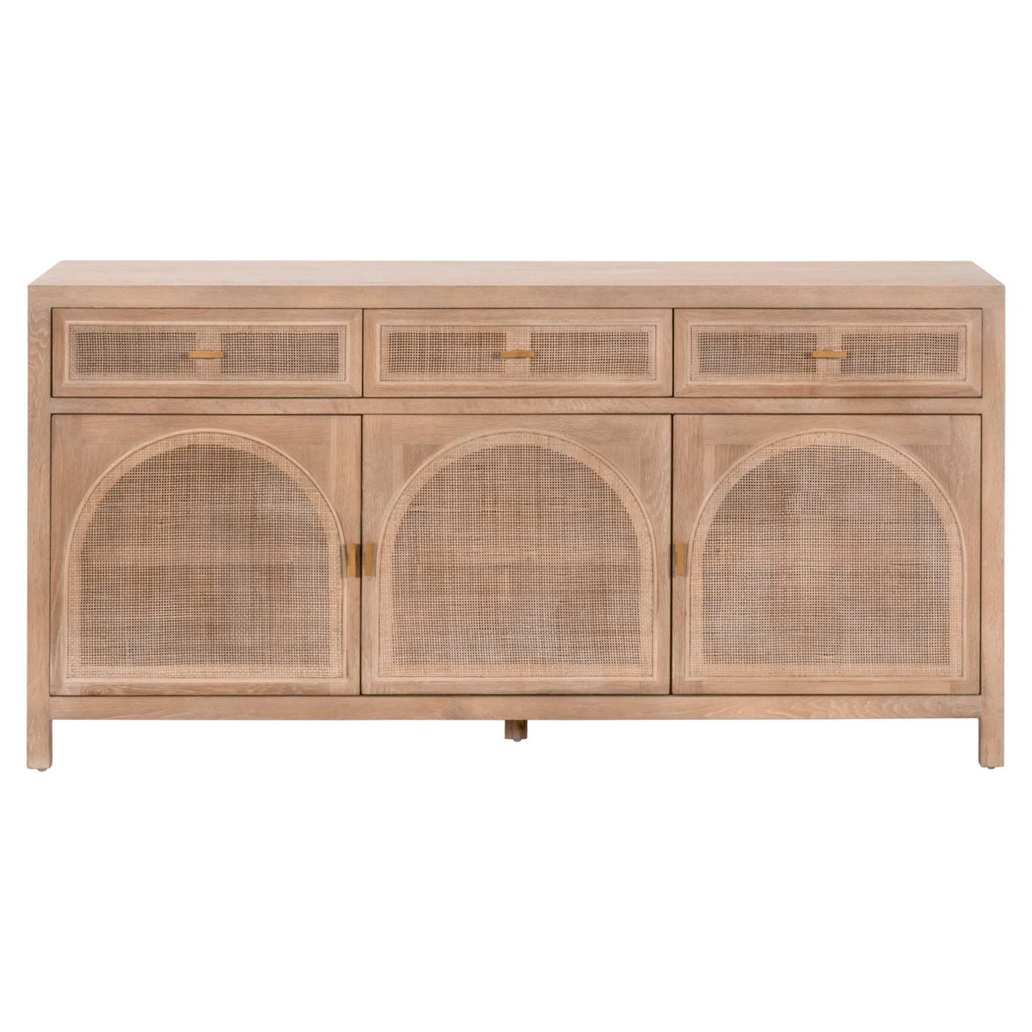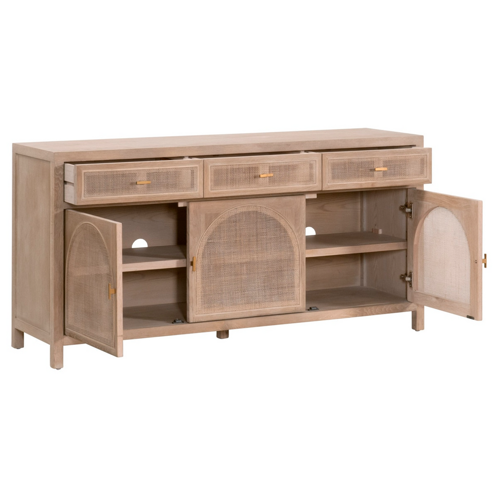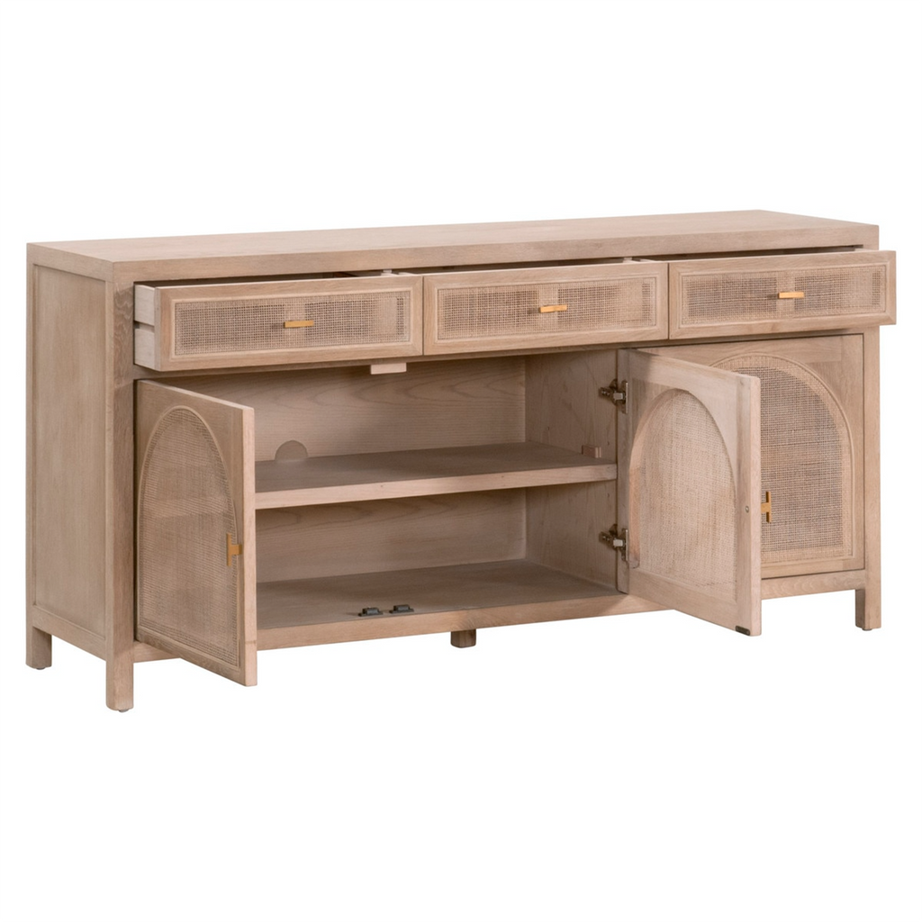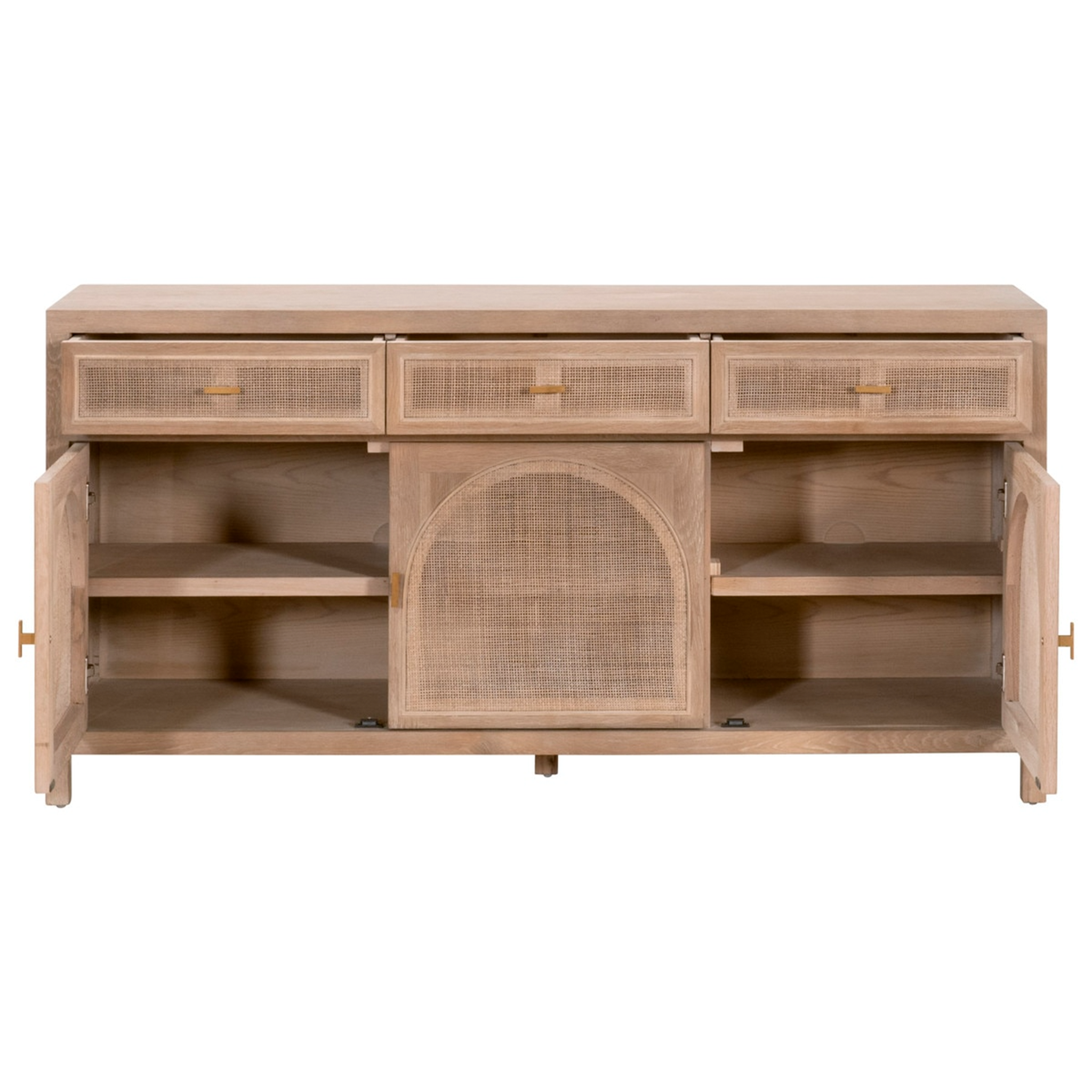 This bohemian-style Cane Media Sideboard exudes rustic charm. It features muted smoke gray tones and a natural appearance. Constructed with oak wood the cabinet doors and drawers have a beautiful front-facing cane inlay with wood border and brushed gold handles. Conveniently, the cabinet contains lots of storage space with its three storage drawers and large cabinet space with removable and adjustable shelves. It also contains dual cord management holes for media and electronic components.