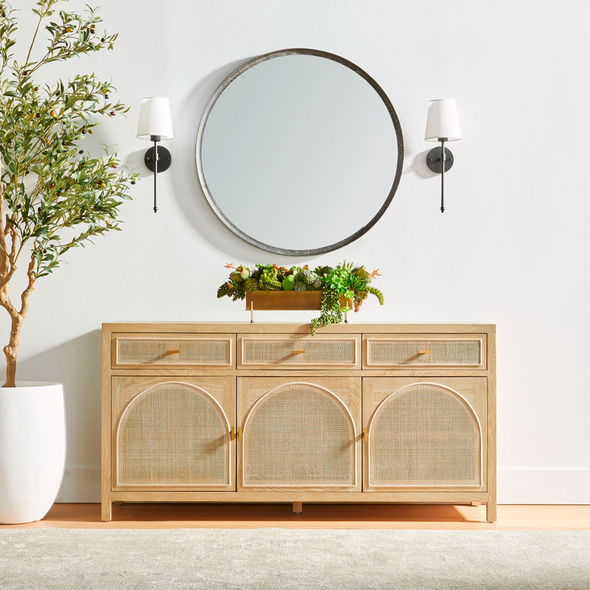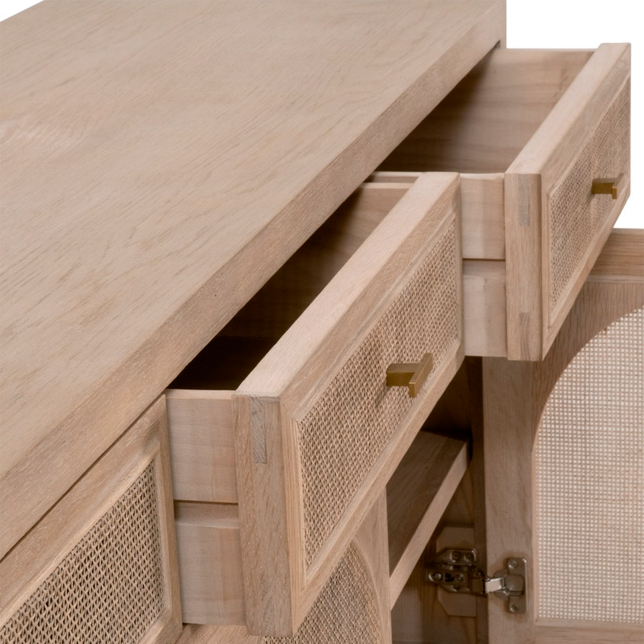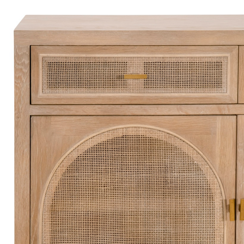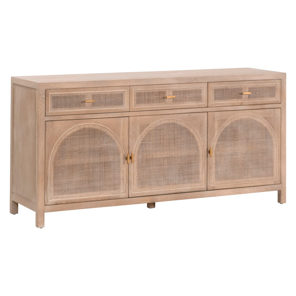 This bohemian-style Cane Media Sideboard exudes rustic charm. It features muted smoke gray tones and a natural appearance. Constructed with oak wood the cabinet doors and drawers have a beautiful front-facing cane inlay with wood border and brushed gold handles. Conveniently, the cabinet contains lots of storage space with its three storage drawers and large cabinet space with removable and adjustable shelves. It also contains dual cord management holes for media and electronic components.