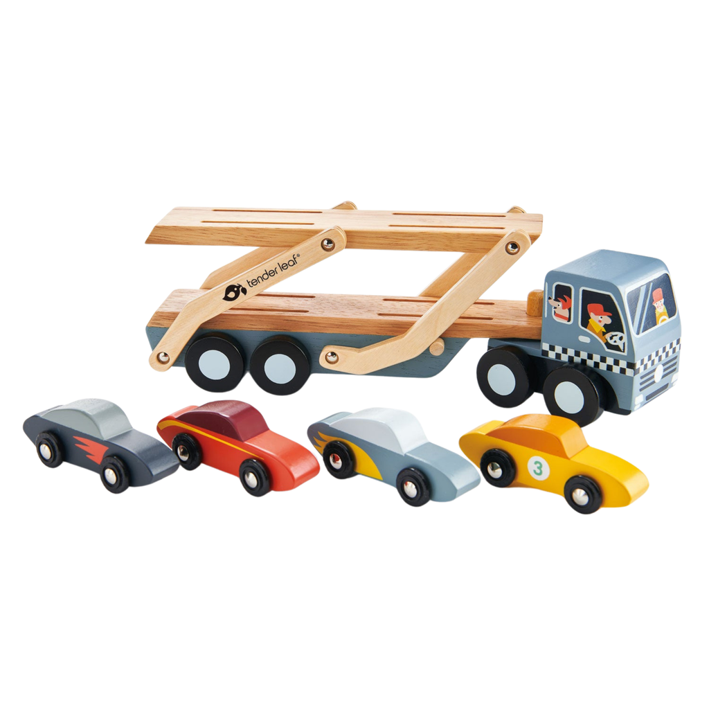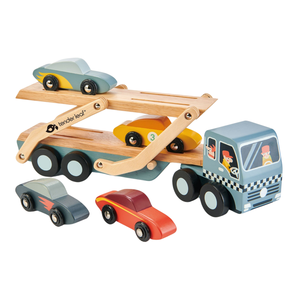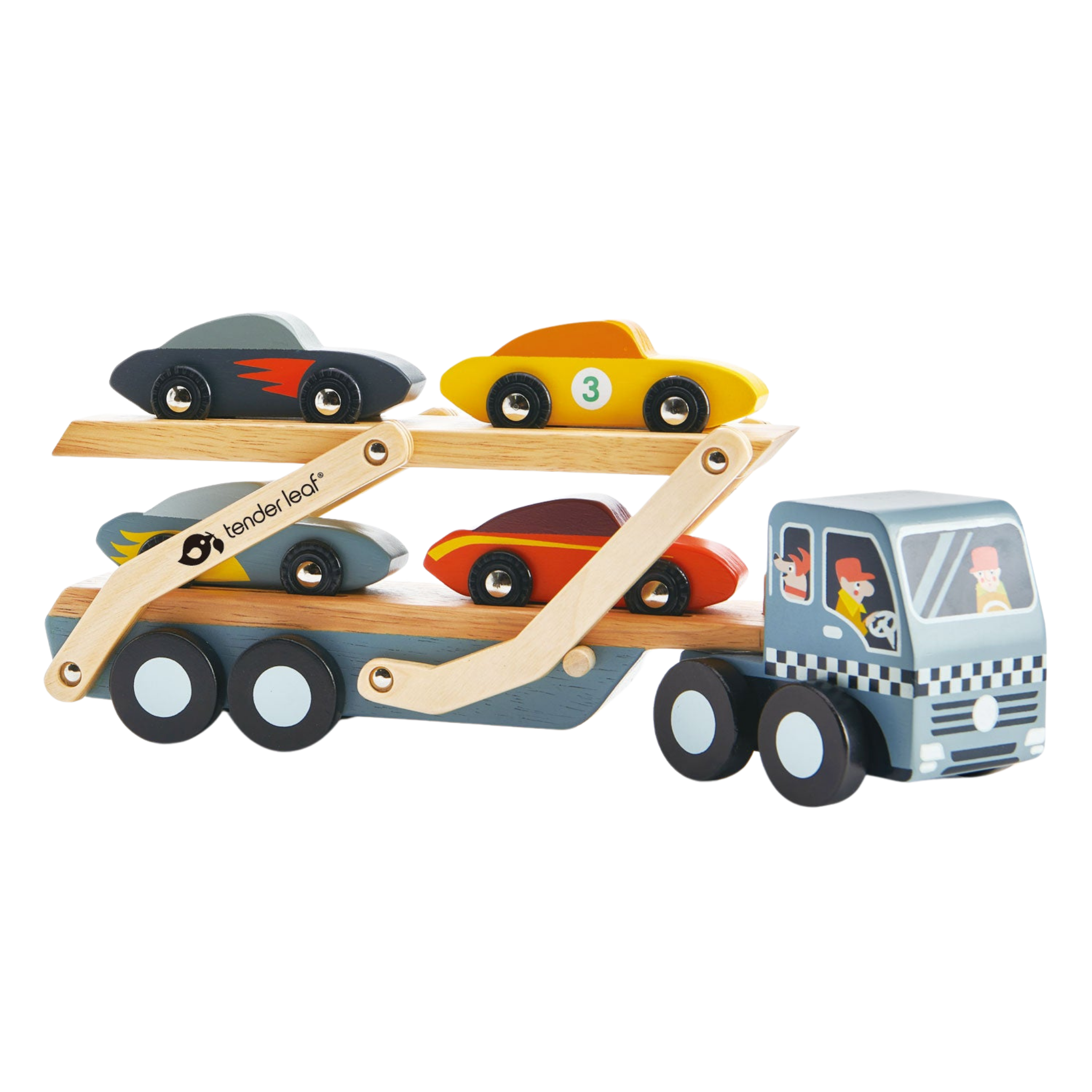 A solid wood transporter with detachable carrier, 4 stylish super cars with metal wheels and a lift down boarding ramp. Check out the little dog in the front cabin!