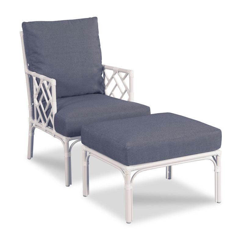 A lovely ottoman styled in the spirit of Chippendale originals of the 18th century. An interesting fretwork back is joined by matching fretwork arms that flank an upholstered cushion. The poles are fashioned in the look of rattan poles over a powder-coated aluminum base that is accented with bindings.