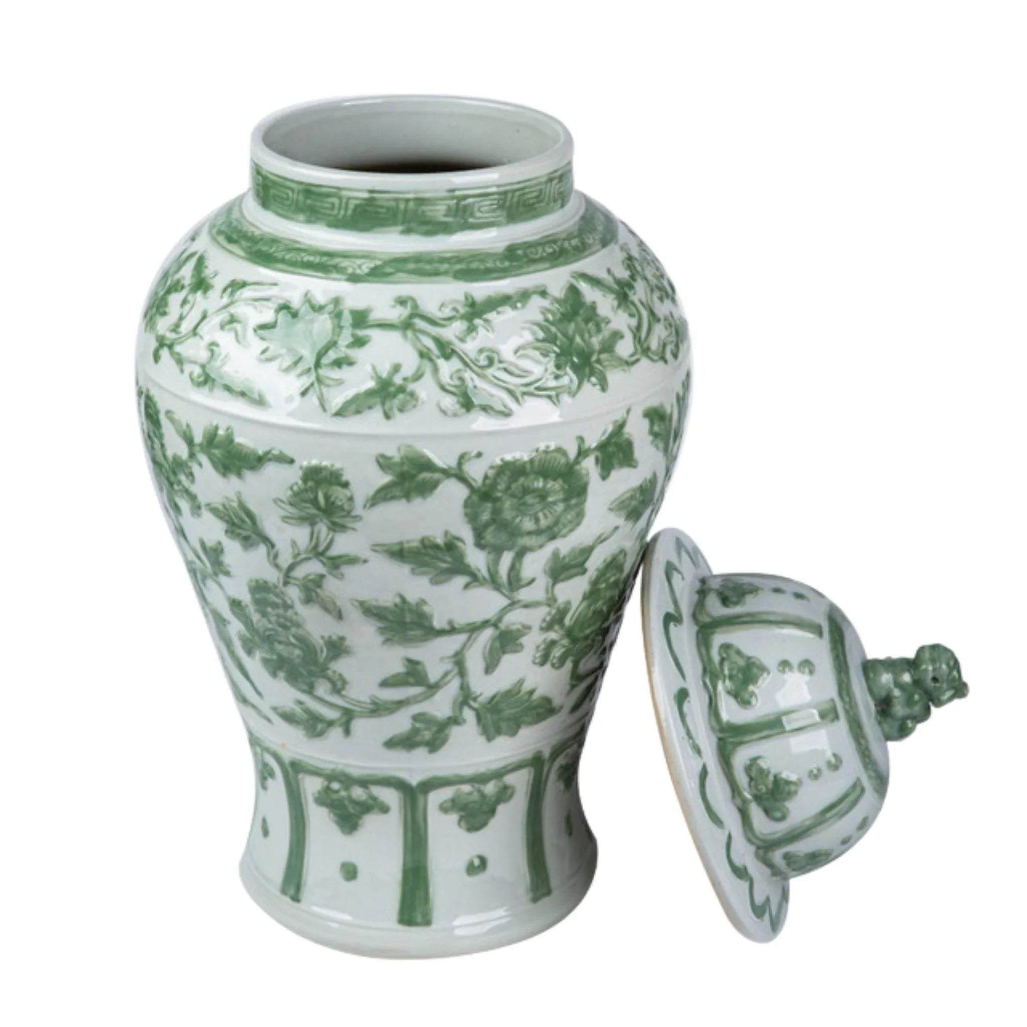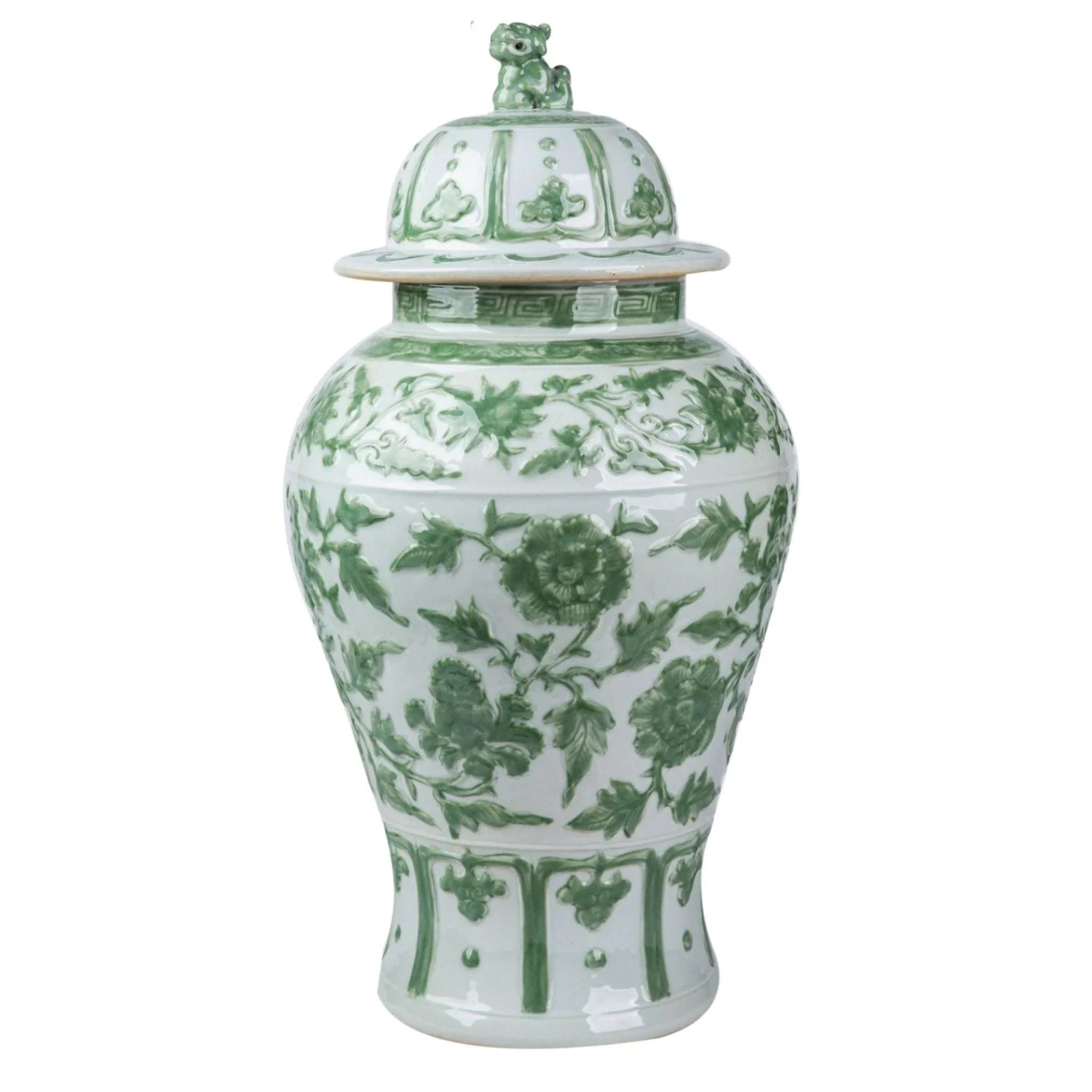 Celadon Green Carved Floral Porcelain Temple Jar with Lion Lid