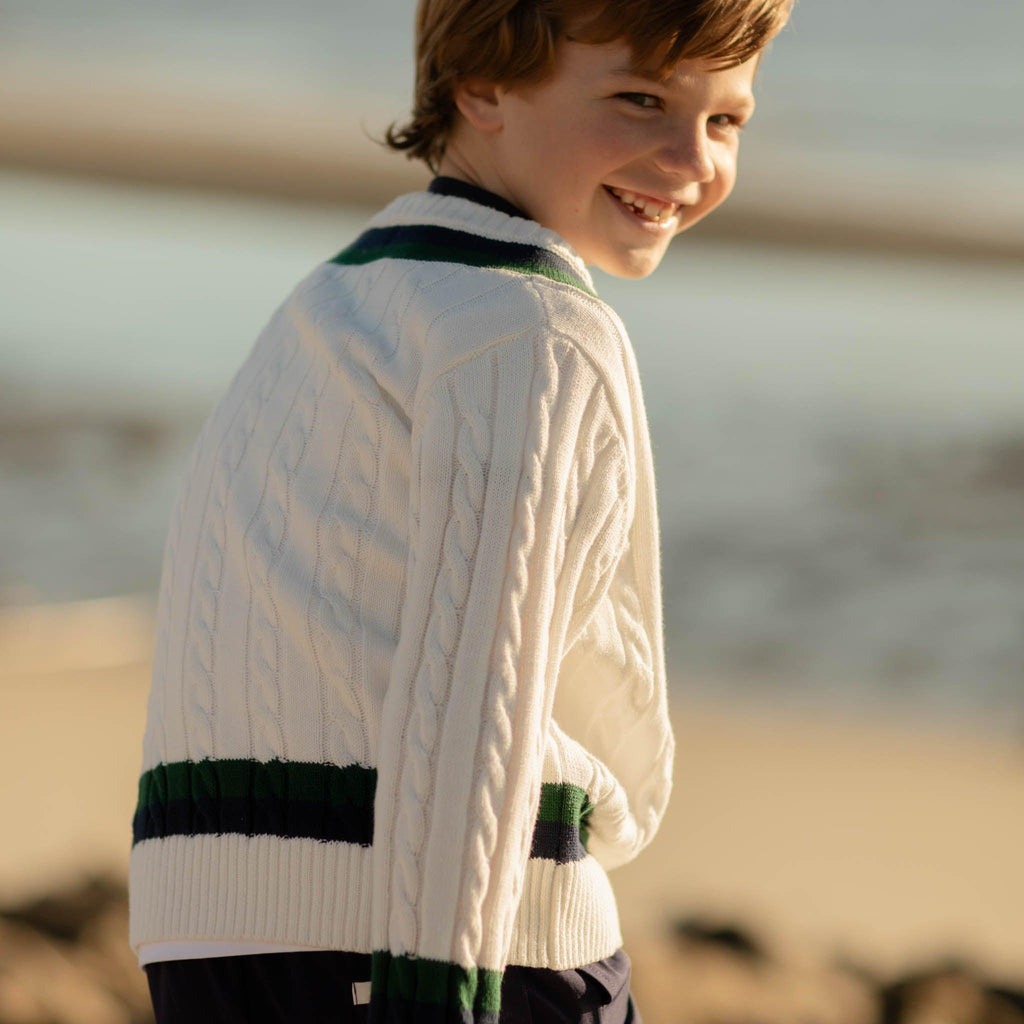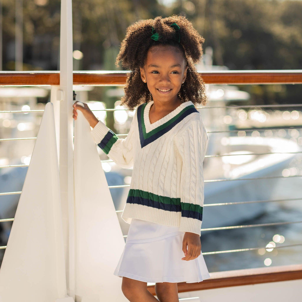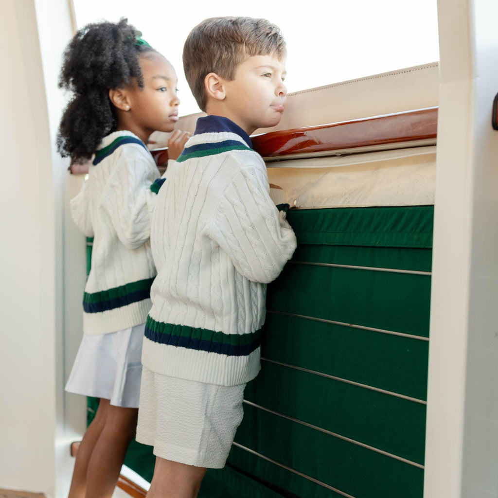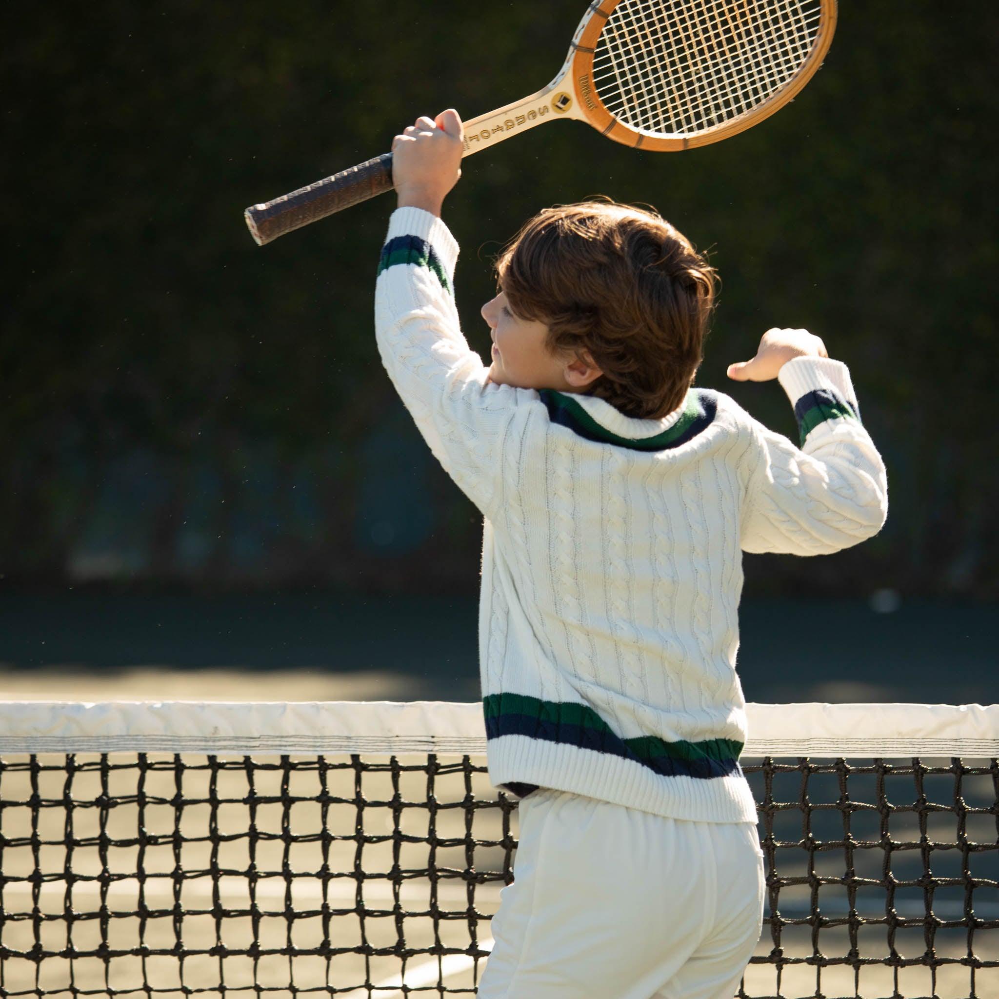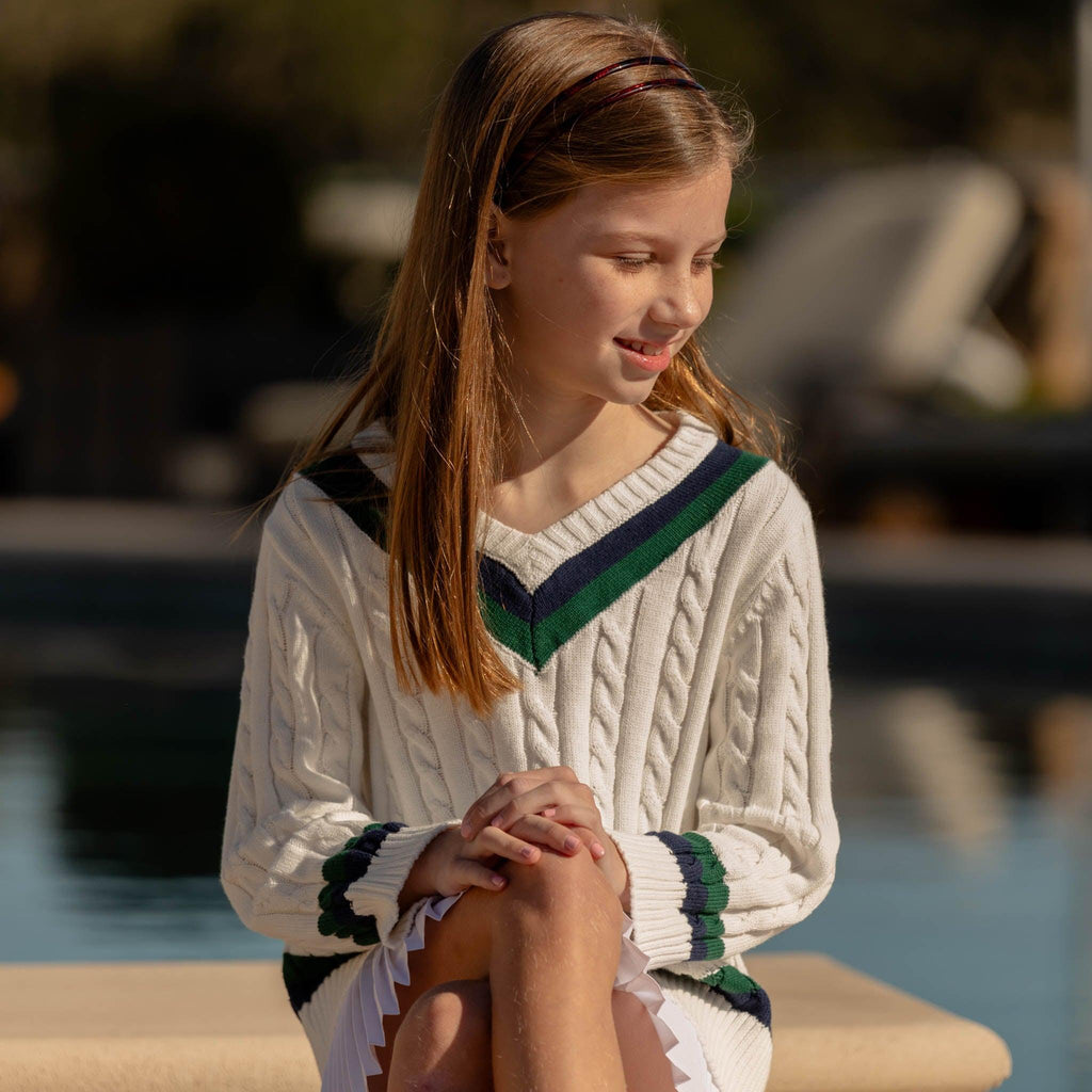 Our Center Court Sweater is our favorite throwback classic that's equally darling for both boys and girls and so versatile they can wear it all year long! Pair it with our Set Point Shorts, our new Taft Tennis Dress or any of our classic collection shorts for a preppy, polished look.