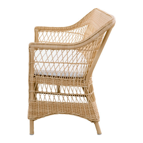 The Charlot Outdoor 3-Seater Sofa by Sika Design showcases an airy, decorative woven back and apron, imparting the look of classic wicker. Crafted from a lightweight AluRattan™ weatherproof aluminum frame and woven in maintenance-free polyethylene ArtFibre™ fibers the sofa combines an elegant aesthetic with durability and year-round weather protection. Finished with a full-length bench cushion, the Charlot brings enduring charm and versatility that make it the darling of outdoor lounging in the garden or on a patio or deck.