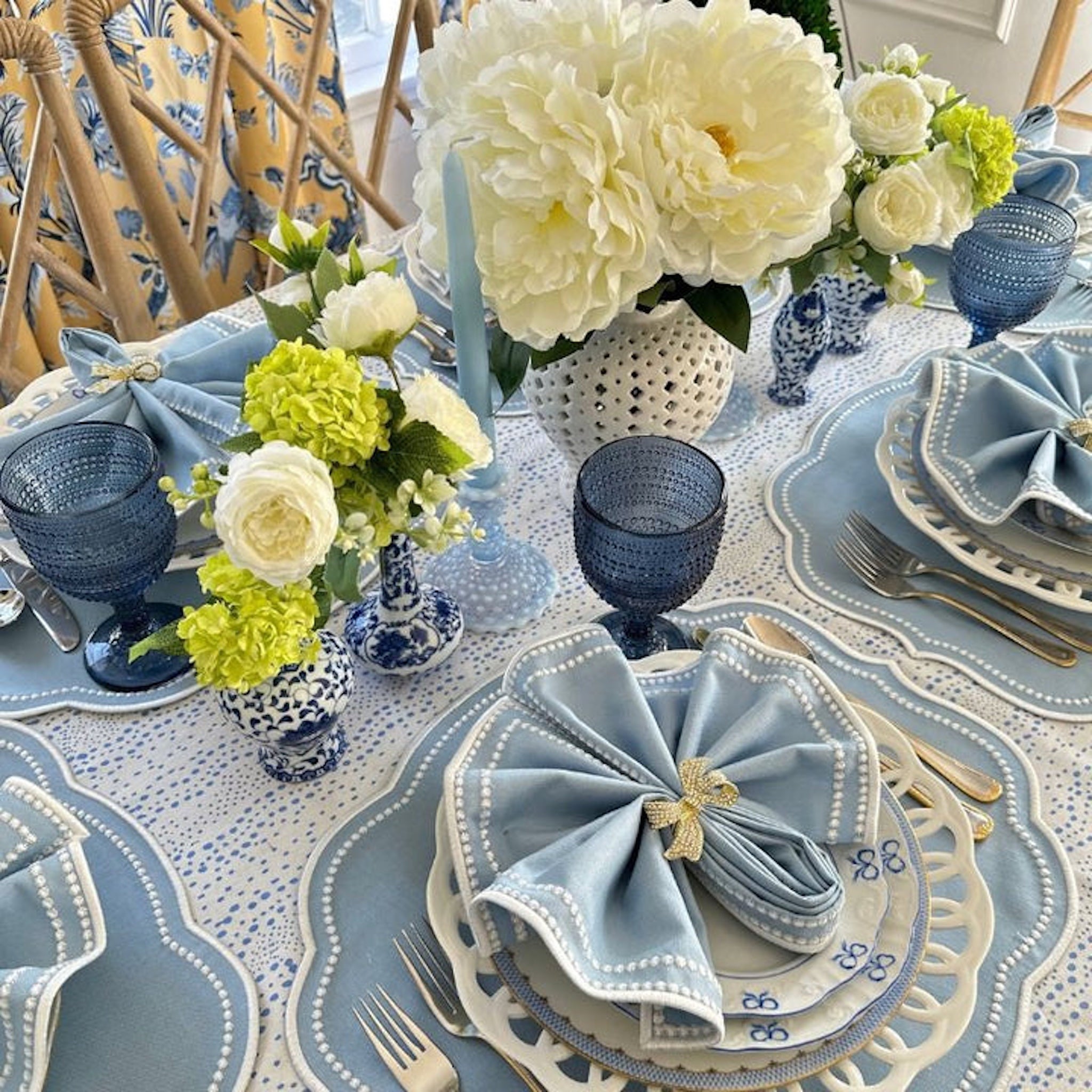Add classic glamour to your table with our hand-crafted blue Charlotte Placemat with white embroidery. Effortless and beautiful table settings should not be mutually exclusive, a point made never more vividly than in the design of the Charlotte placemat.