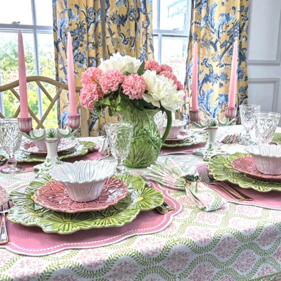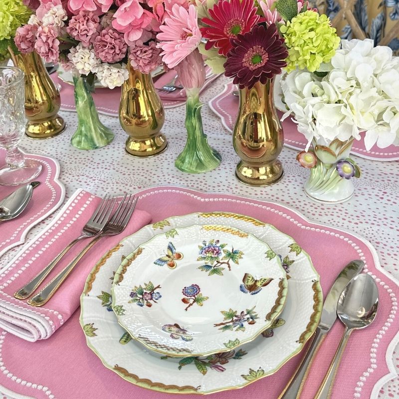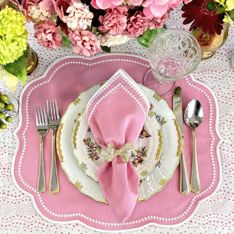 Add classic glamour to your table with our hand-crafted pink Charlotte Placemat with white embroidery.